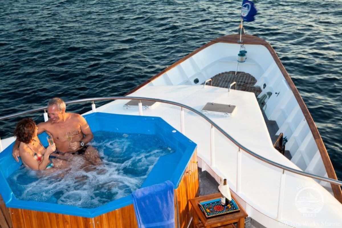 On safari, we are going on a Humbolt Explorer boat, which is prepared for 16 people.The boat is divided into 4 decks with a sun deck, grill, bar and jacuzzi on the roof. Humbolt Explorer is a boat with a high standard of finishing and preparation for diving. Boat has all the attributes to make the trip pass in a nice and luxurious atmosphere. Starting with warm towels served for frozen divers and ending with a wide menu. There are 2 cabins on the middle deck and 6 on the house deck. Each cabin is equipped with a private bathroom, TV and several cabinets, as well as individual air conditioning.