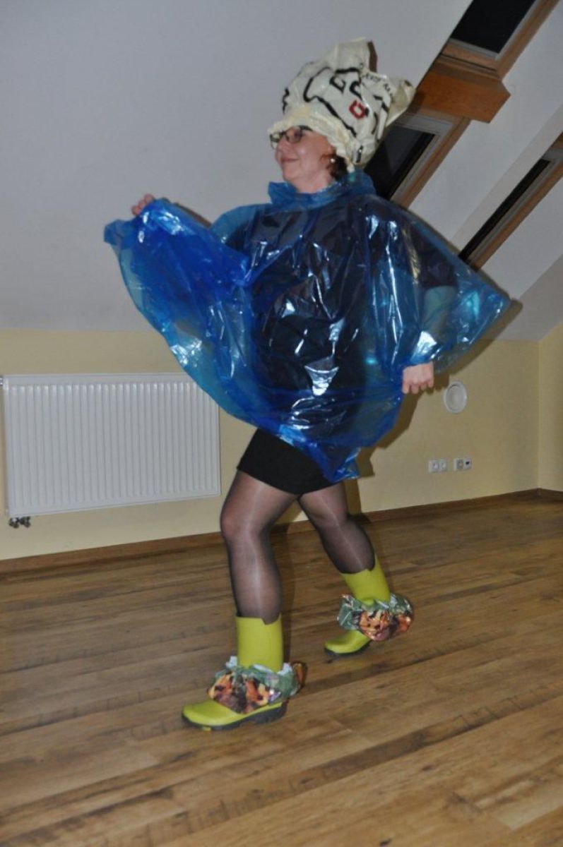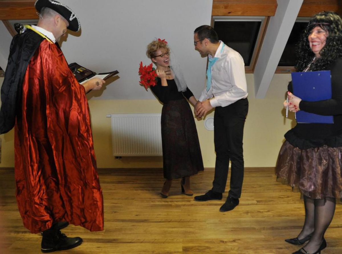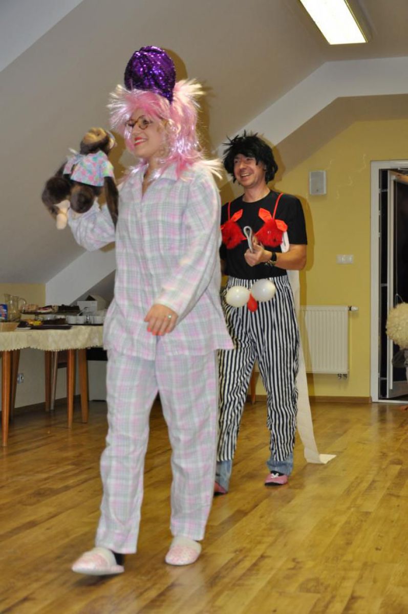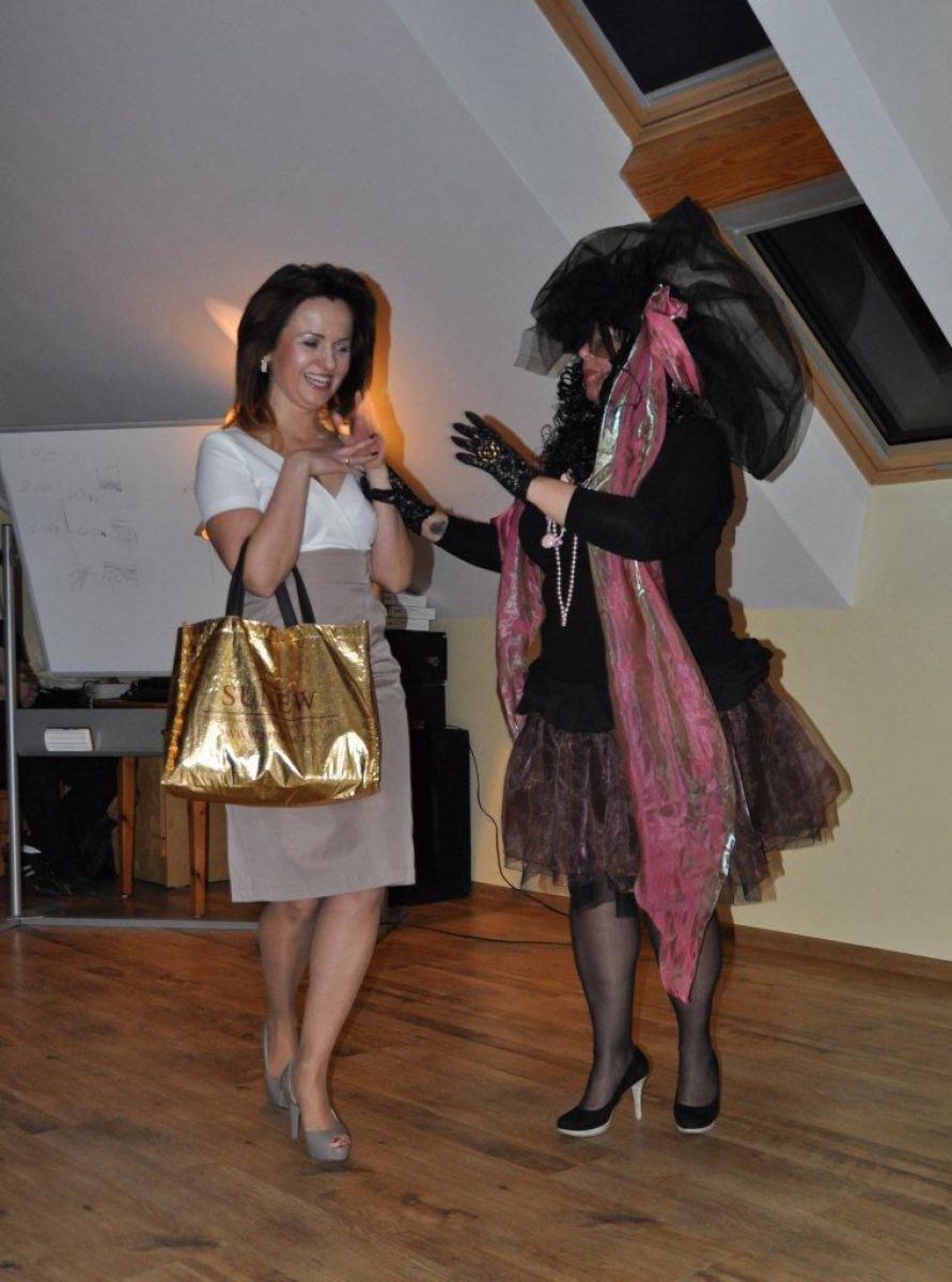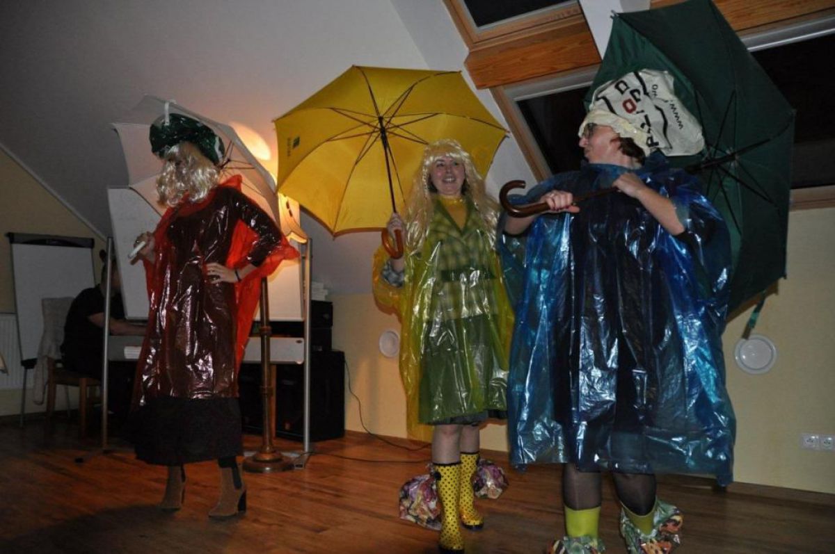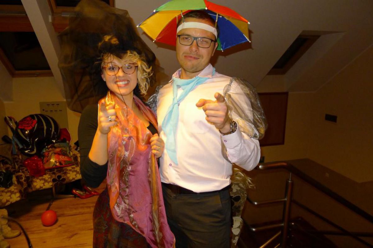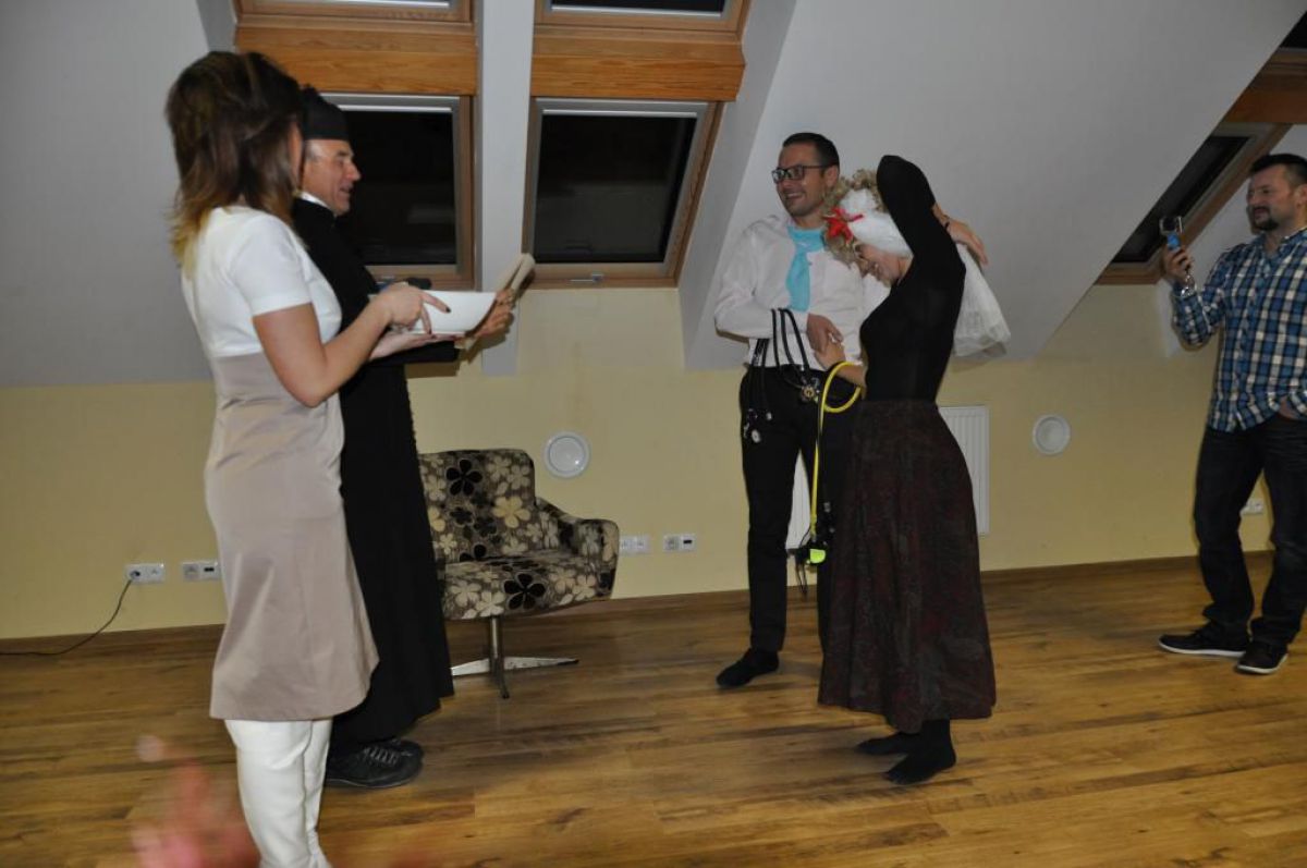 Ciemny zimny wieczór listopad się kończy. Deszcz zacina mokry, wiatr nad Kłodnem krąży. W tej smutnej scenerii wesoła gromada u Krefty w ośrodku za stołami siada. Wszyscy się przebrali diabełki i rogi, tu tańczy gej z panną tam kreator mody. Taki chłop z krwi kości zmieniony w dziewczynę, a inny bez włosów czarną ma czuprynę. Projektantka Asia vel Małgosia Pufa pomysły ma świetne i kostiumów kupa, więc wesołość wielką budzi dziś na sali gdy ślub Pauli z Wnorkiem na nowo przedstawi. Męczą się więc młodzi na oczach publiki, próbując rozwiązać życiowe chochliki. Bo przecież ślub Nurka to jest ważna sprawa a tutaj wesoło można go przedstawiać. Gdy ślub dobiegł końca, Asia vel Małgosia zaraz pokaz mody wesoły ogłasza, więc odzież sportowa do grania biegania a potem zimowa i taka do spania. Modelki, modele, wybrane z publiki robiły furorę, te pozy uniki, te piękne kreacje ten kolor i szpan, publiczność szalała, a to Asi plan. Więc bardzo dziękuję wszystkim co przybyli i fajnie do rana z humorem bawili a Asi Skowrońskiej kłaniam się dziś nisko dziękując za wspaniałe, śmieszne widowisko.
