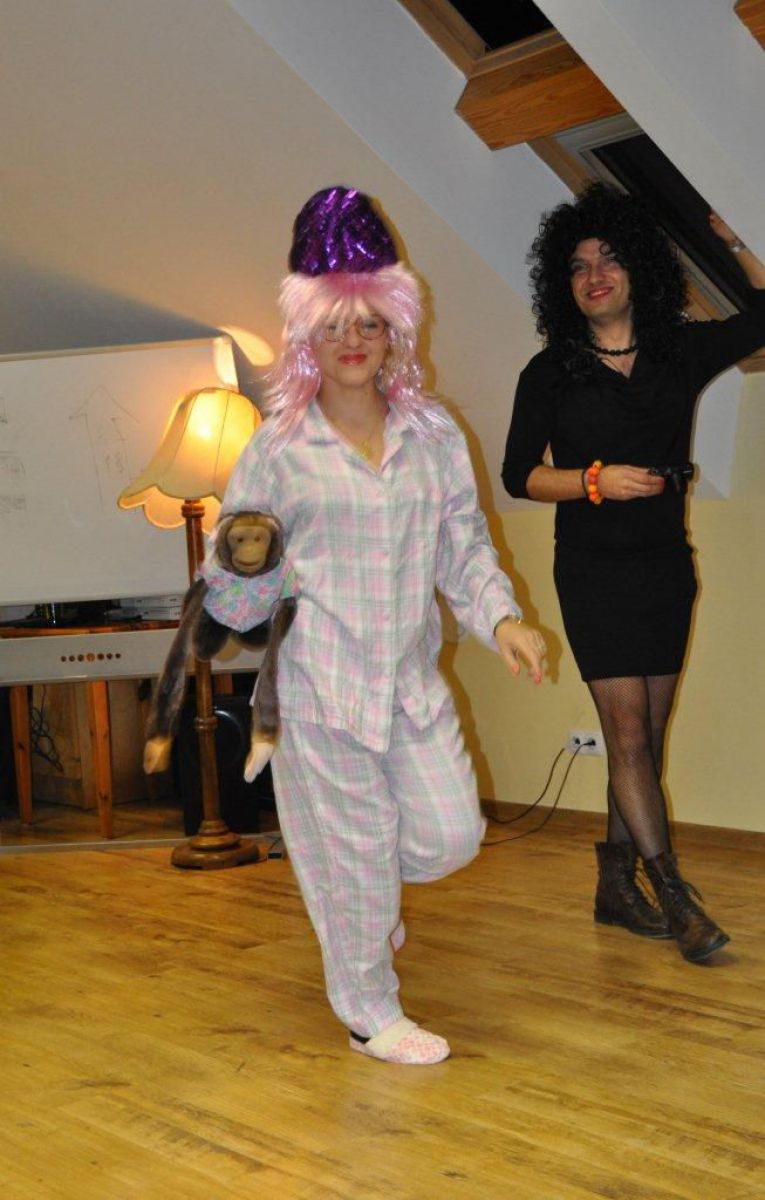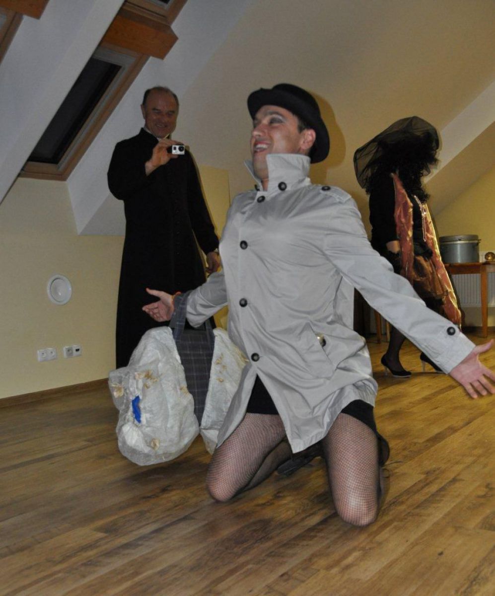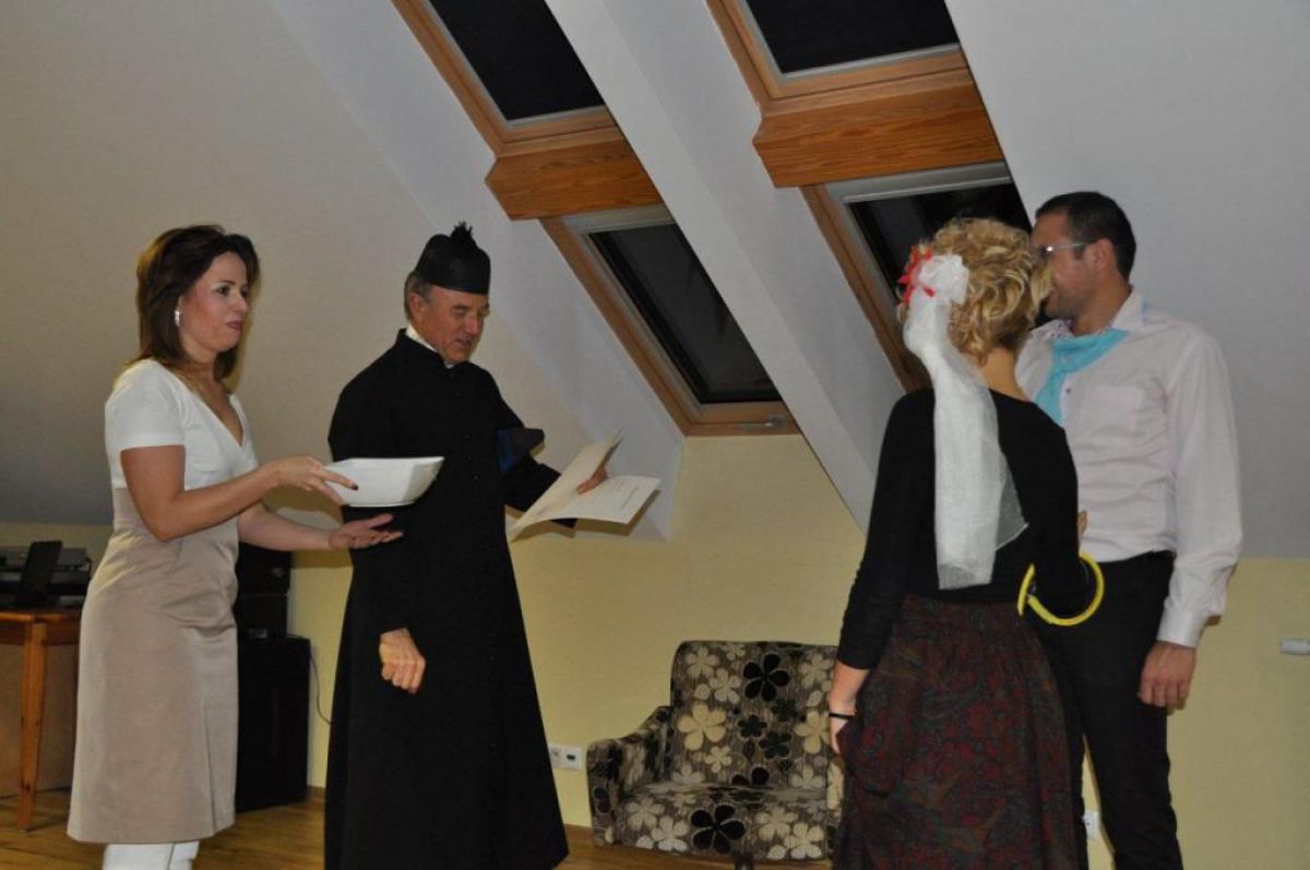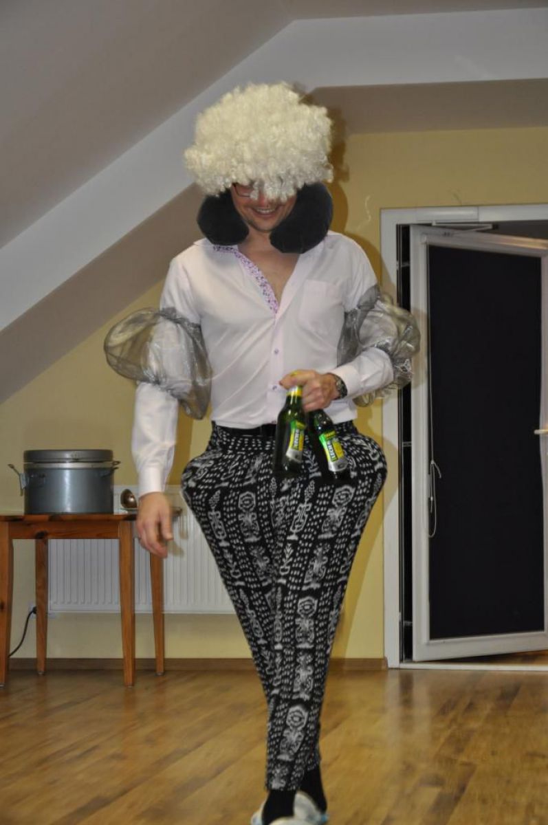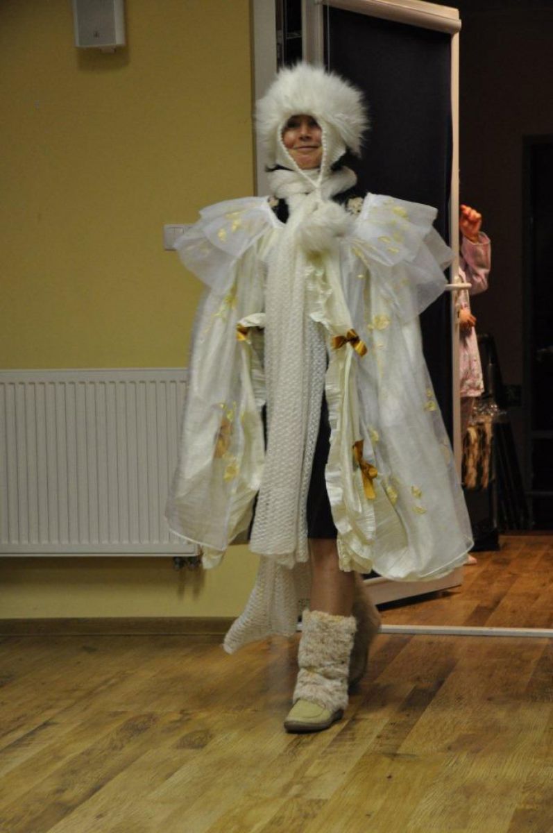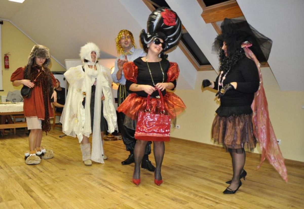 Ciemny zimny wieczór listopad się kończy. Deszcz zacina mokry, wiatr nad Kłodnem krąży. W tej smutnej scenerii wesoła gromada u Krefty w ośrodku za stołami siada. Wszyscy się przebrali diabełki i rogi, tu tańczy gej z panną tam kreator mody. Taki chłop z krwi kości zmieniony w dziewczynę, a inny bez włosów czarną ma czuprynę. Projektantka Asia vel Małgosia Pufa pomysły ma świetne i kostiumów kupa, więc wesołość wielką budzi dziś na sali gdy ślub Pauli z Wnorkiem na nowo przedstawi. Męczą się więc młodzi na oczach publiki, próbując rozwiązać życiowe chochliki. Bo przecież ślub Nurka to jest ważna sprawa a tutaj wesoło można go przedstawiać. Gdy ślub dobiegł końca, Asia vel Małgosia zaraz pokaz mody wesoły ogłasza, więc odzież sportowa do grania biegania a potem zimowa i taka do spania. Modelki, modele, wybrane z publiki robiły furorę, te pozy uniki, te piękne kreacje ten kolor i szpan, publiczność szalała, a to Asi plan. Więc bardzo dziękuję wszystkim co przybyli i fajnie do rana z humorem bawili a Asi Skowrońskiej kłaniam się dziś nisko dziękując za wspaniałe, śmieszne widowisko.