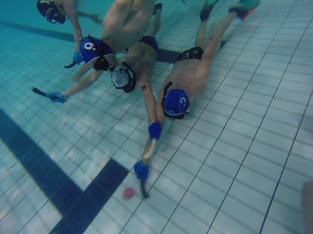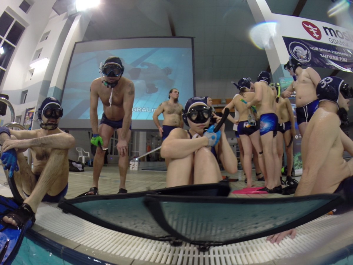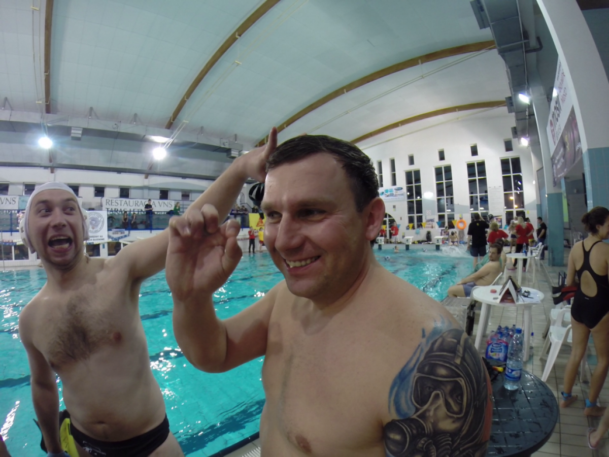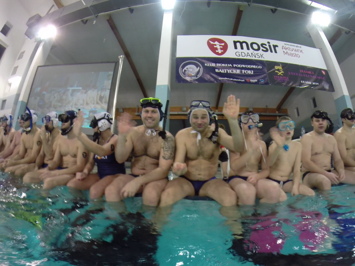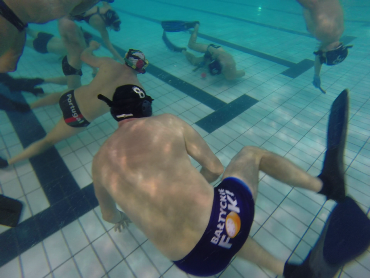 Każdy maskę ma na twarzy, płetwy kipiel robią z wody, kijek w dłoni wyciągniętej sunie krążek hokejowy. Tak to ciemną późną nocą turniejowe trwają szranki krążek skacze po kafelkach i do pustej wpada bramki. Atmosfera jest wspaniała dwie drużyny z zagranicy, kilka drużyn jest z Trójmiasta z Bełchatowa i Trzebnicy. Gdańskie Foki chcą zwyciężyć gospodarzom sprzyja woda bardzo dzielnie się spisują, III miejsce, trochę szkoda. Mistrzem dzisiaj są Słoweńcy, co z Lublany przyjechali, i jedyni z wszystkich drużyn, żadnych meczy nie przegrali. Więc dla wszystkich tych ciekawskich co sobotnią noc przespali kilka fotek tu zamieszczam by zobaczyć jak tam grali.