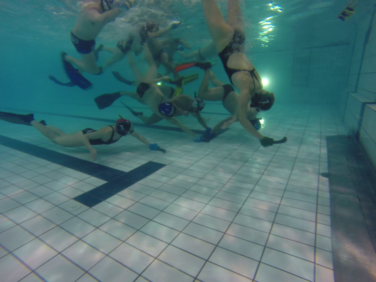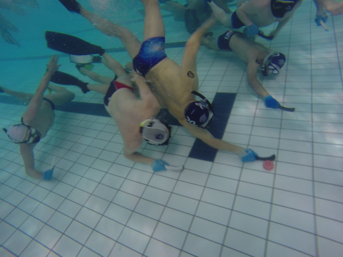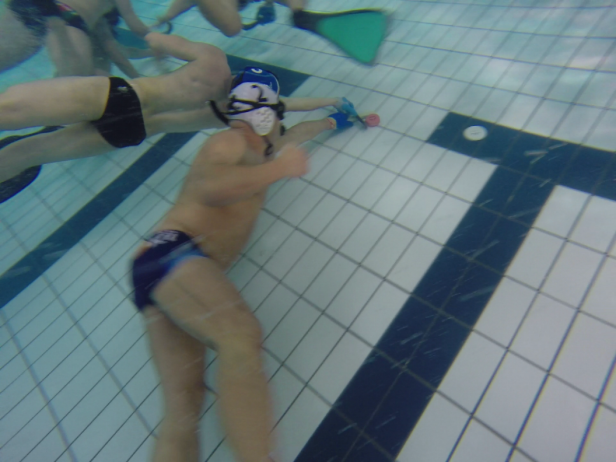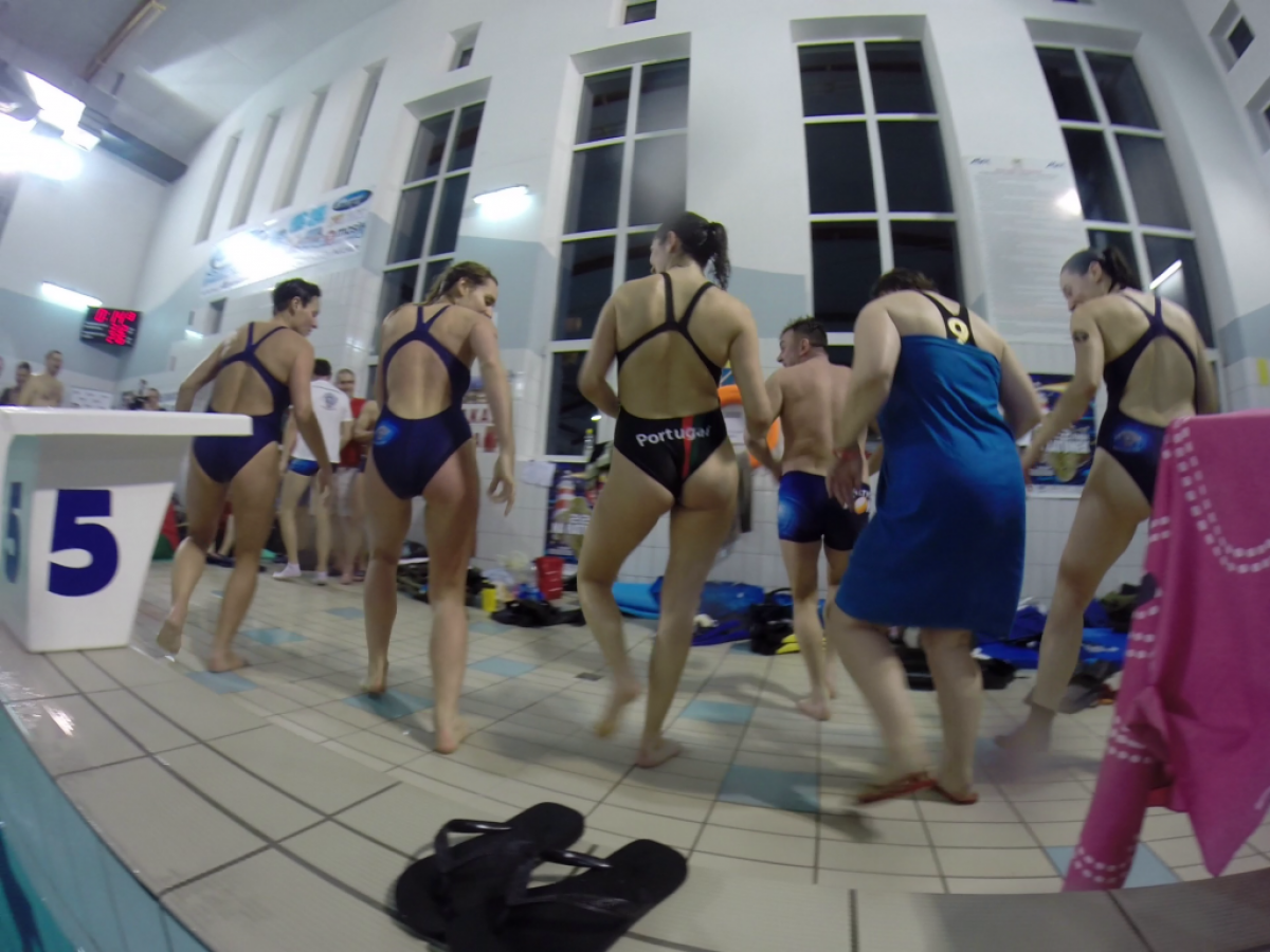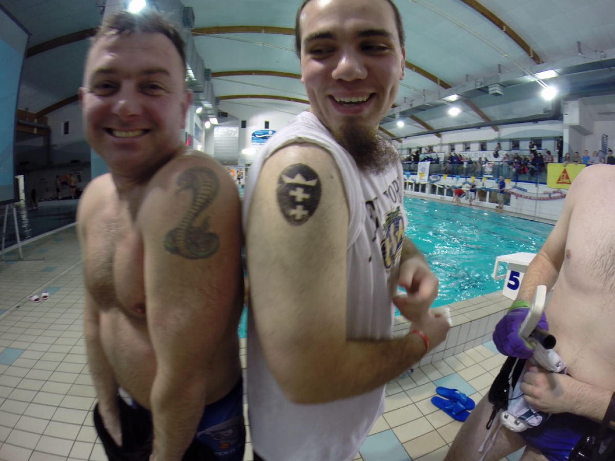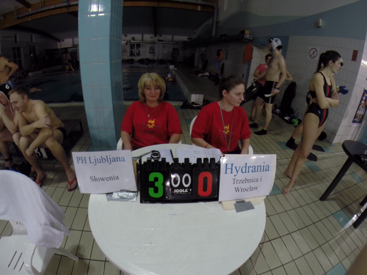 Każdy maskę ma na twarzy, płetwy kipiel robią z wody, kijek w dłoni wyciągniętej sunie krążek hokejowy. Tak to ciemną późną nocą turniejowe trwają szranki krążek skacze po kafelkach i do pustej wpada bramki. Atmosfera jest wspaniała dwie drużyny z zagranicy, kilka drużyn jest z Trójmiasta z Bełchatowa i Trzebnicy. Gdańskie Foki chcą zwyciężyć gospodarzom sprzyja woda bardzo dzielnie się spisują, III miejsce, trochę szkoda. Mistrzem dzisiaj są Słoweńcy, co z Lublany przyjechali, i jedyni z wszystkich drużyn, żadnych meczy nie przegrali. Więc dla wszystkich tych ciekawskich co sobotnią noc przespali kilka fotek tu zamieszczam by zobaczyć jak tam grali.