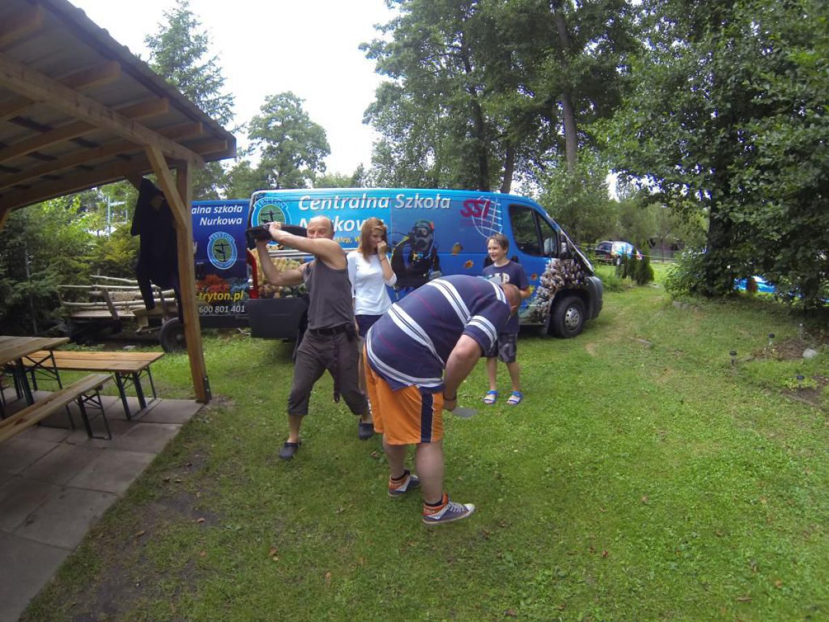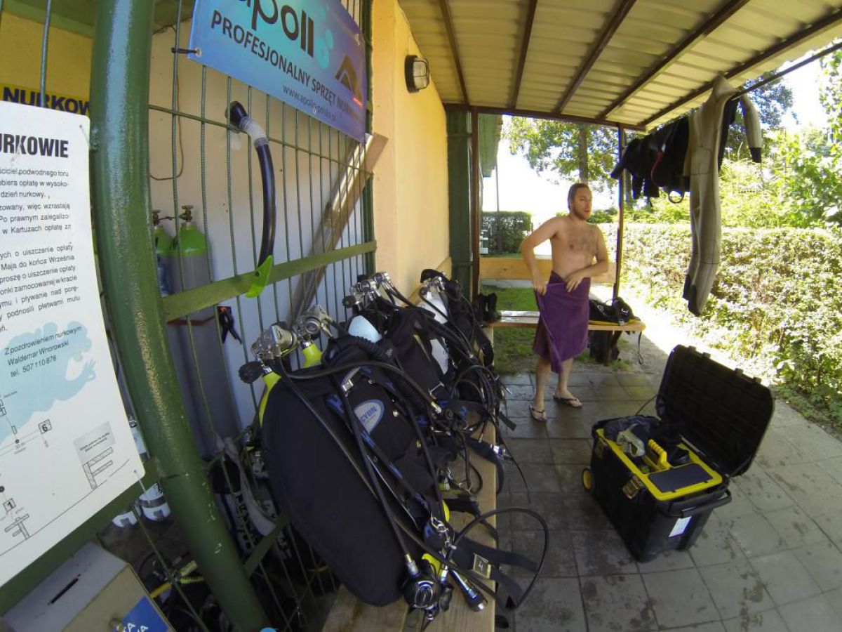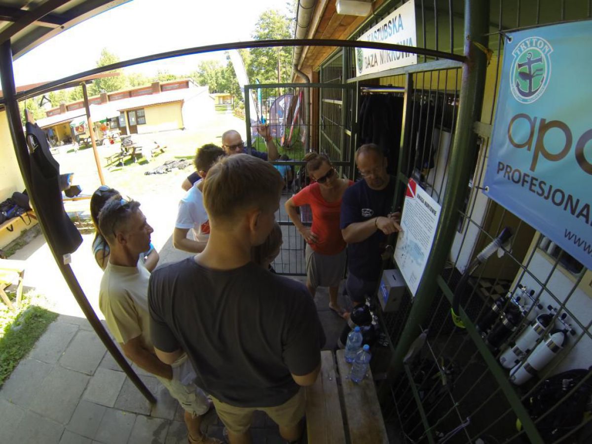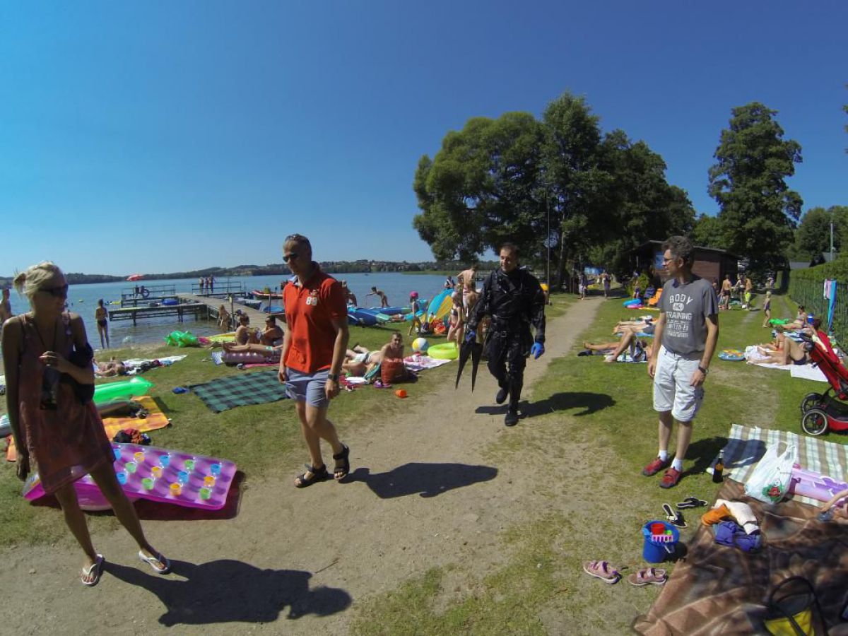 Niesamowite jak ten czas leci niedawno objadałem się świeżymi truskawkami , a teraz zostały mi tylko maliny i czarne jagody. A niedługo jesień i wysyp jesiennych owoców potem babie lato i żółty jesienny liść. Coś mnie jakaś nostalgia napadła, tęsknota za tym co było, a przecież mamy połowę lata i Egipskie upały. Więc żeby się trochę schłodzić to wszyscy co mogą nad wodę, a Ci co potrafią to nawet pod wodę. Więc i ja zadomowiłem się w ten weekend w Chmielnie nad naszym ulubionym Kłodnem. I w tych lazurowych wodach przebywam całymi godzinami, no może trochę przesadziłem z tym lazurem, ale pomarzyć zawsze można. Zresztą dla mnie i nie jestem w tym odosobniony, nie musi być taki kryształ, grunt że jest gdzie się zanurzyć. I Ci co nie nurkują mogą tylko pozazdrościć, tej ciszy i spokoju, Gdy tylko znikasz bracie pod wodą i zostawiasz tam u góry kłopoty dnia codziennego, gwar hałas gdy otula Cię cisza przerywana własnym oddechem. Wtedy Twoje ciało przykute grawitacją do matki ziemi, tu pod wodą szybuje jak by nie istniało prawo ciążenia. Gdy zawiśniemy bez ruchu nad dnem, lub w klatkach toru podwodnego, gdy otoczą nas zewsząd stada ryb, wtedy czujemy się tak, jak byśmy byli częścią tego systemu. No trochę jednak popłynąłem ale do brzegu jak mawia Krzysiek, a więc na brzegu tłumy ludzi spragnionych ochłody. A w Kaszubskiej Bazie tłumy nurków spragnionych podwodnej przygody. Sporo przyjezdnych z Polski i krajów ościennych, trafili się nawet Francuzi i liczna grupa naszych rodzimych kursantów. Zresztą popatrzcie na naszą galerię, zdjęcia trochę powyginane ale to nie pijany fotograf, tylko szerokokątna kamerka GoPro.