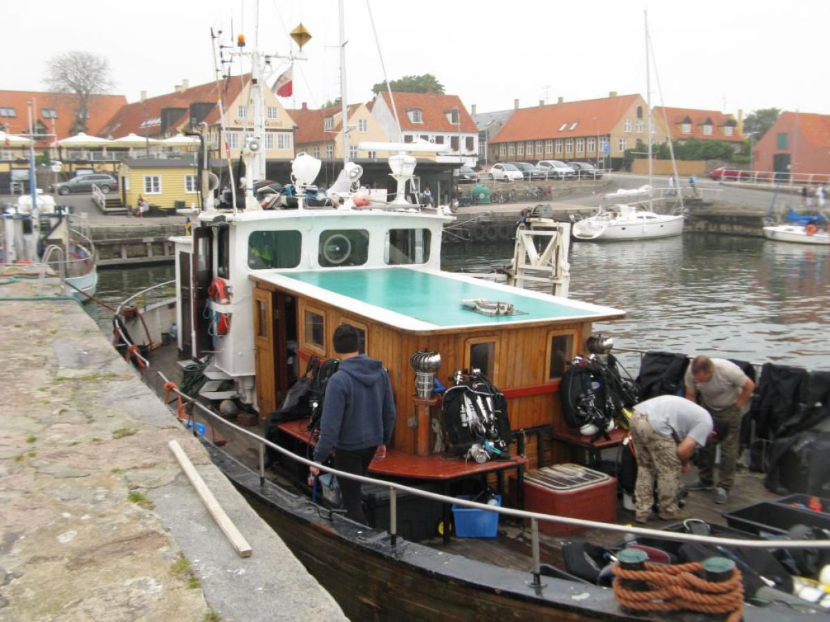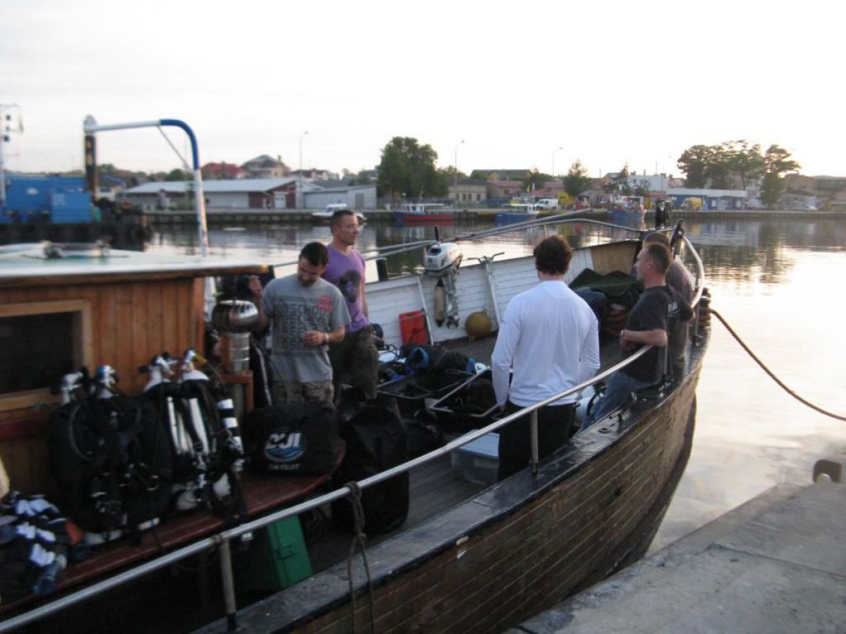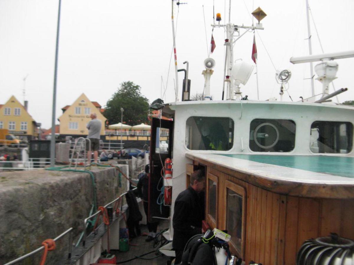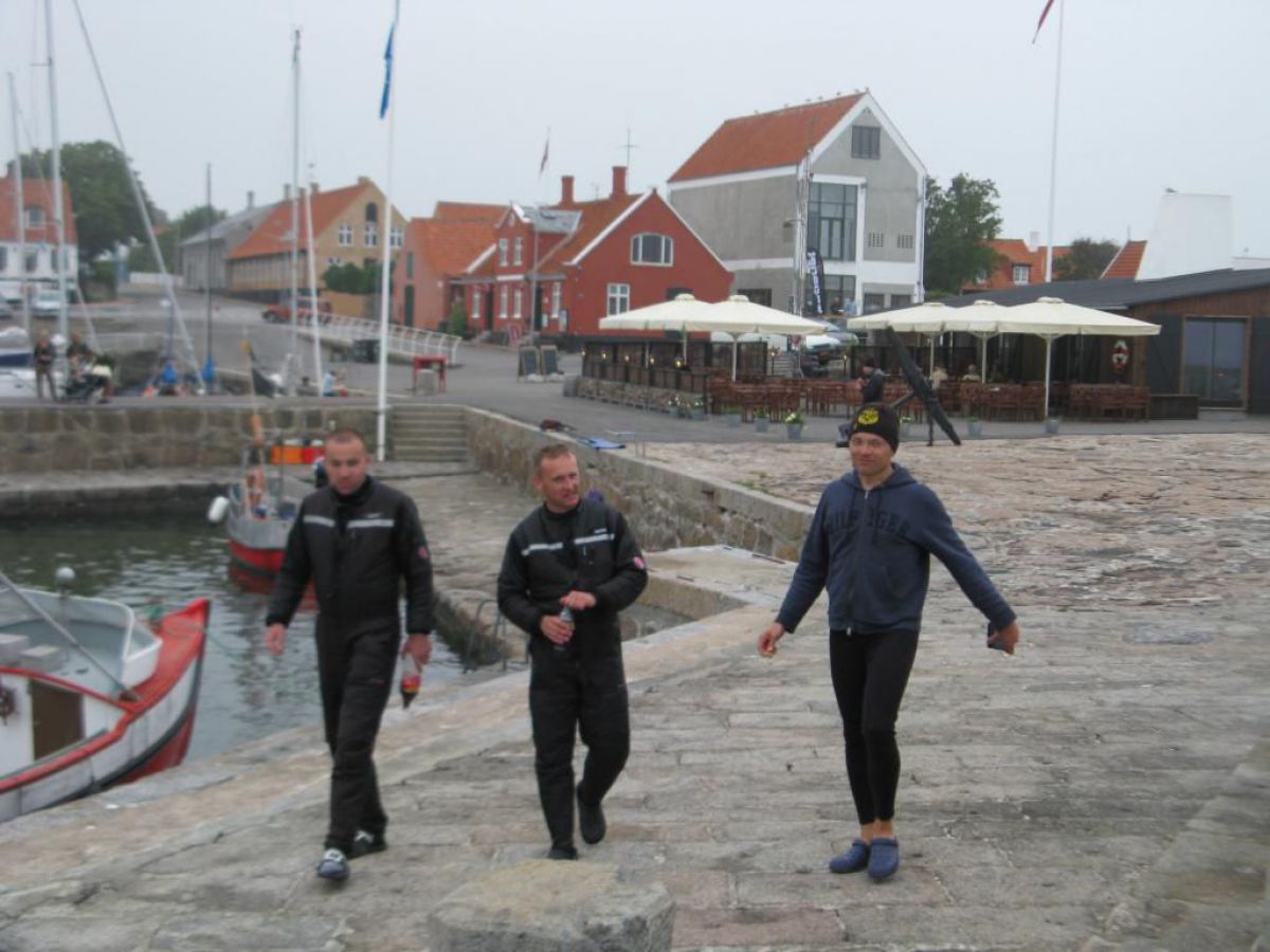 Rejs po wrakach Bornholmu zaczęliśmy do zaokrętowania się jednostce Nitrox w Darłówku. Nabrzeże przy którym stała nasza jednostka odcięte jest od morza nisko osadzonym mostem który o pełnych godzinach otwierał się umożliwiając żeglugę. Krótko po wyjściu z portu okazało się że silnik nie ma chłodzenia. Naprawa uszkodzenia trwała dość długo i traciliśmy nadzieję na udany rejs. Całe szczęście okazało się że silnik jest sprawny a brak chłodzenia wynikał z zakręconego zaworu który ktoś przez przypadek zamknął :-) Sporo czasu załodze zajęło znalezienie usterki ale w chwili gdy okazała się błahą wyruszyliśmy w dalszy rejs. Łódź Nitrox jest idealnie przygotowana do obsługi nawet 12 nurków. Znajduje się na nim sprężarka przestronny dek nurkowy, prysznic, toaleta, winda nurkowa. Wszystko to co potrzebne jest do zorganizowania wyjazdu nurkowego. Dzięki wieczornym przystankom w portach poza czasem na łodzi i nurkowaniami, mogliśmy zwiedzać okolice wyspy i lokalne puby :)