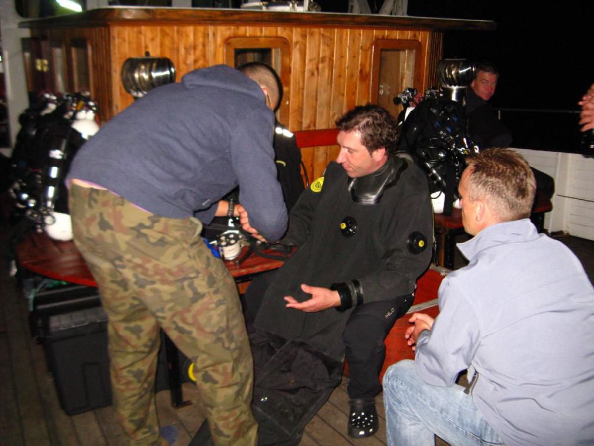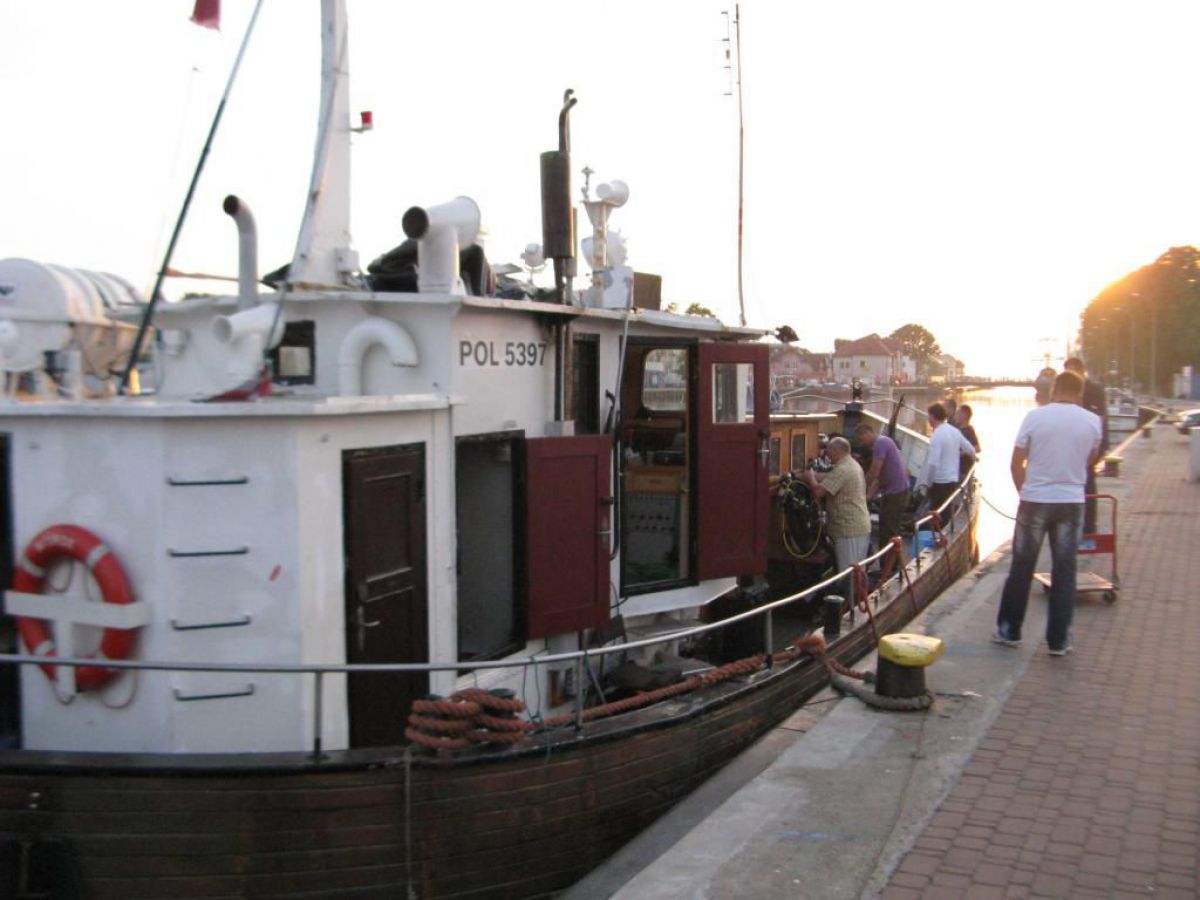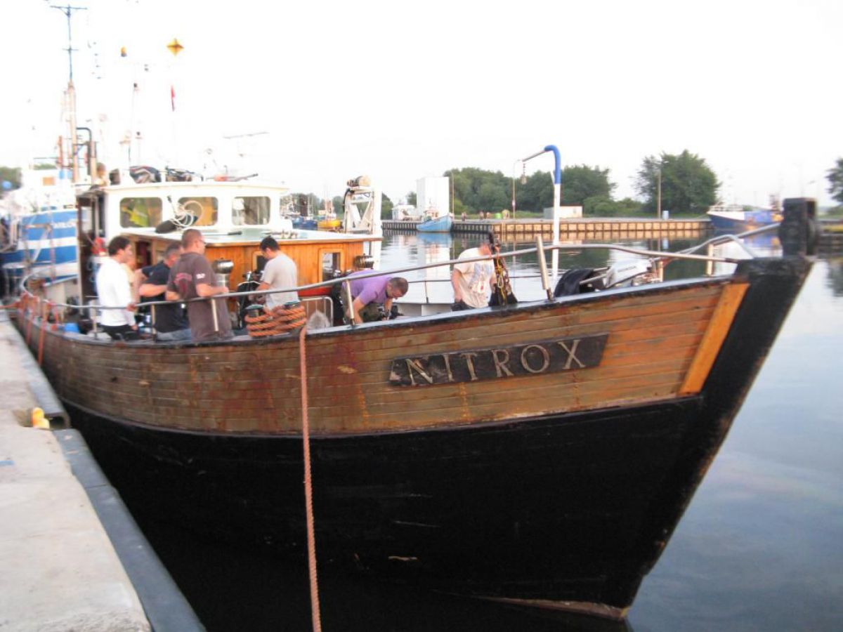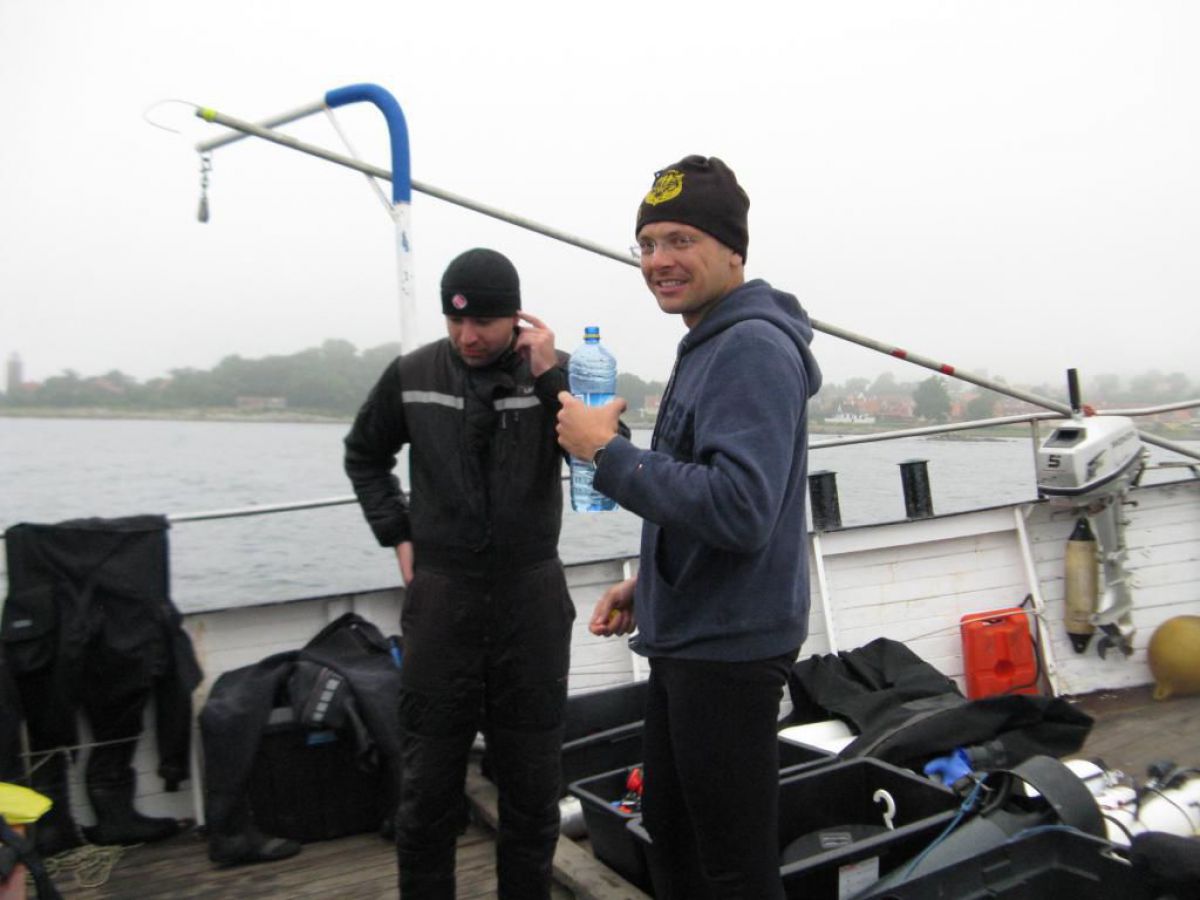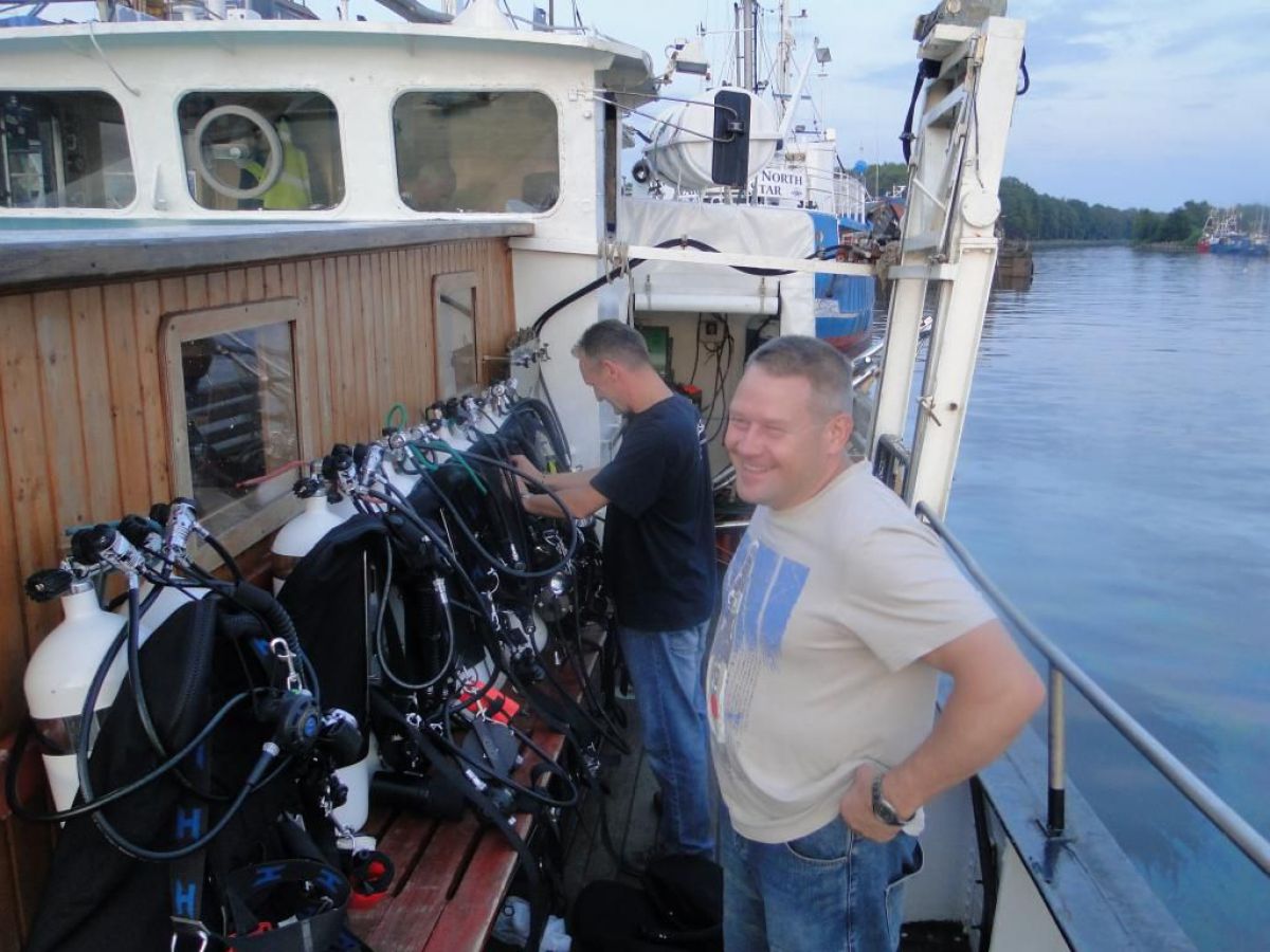 Rejs po wrakach Bornholmu zaczęliśmy do zaokrętowania się jednostce Nitrox w Darłówku. Nabrzeże przy którym stała nasza jednostka odcięte jest od morza nisko osadzonym mostem który o pełnych godzinach otwierał się umożliwiając żeglugę. Krótko po wyjściu z portu okazało się że silnik nie ma chłodzenia. Naprawa uszkodzenia trwała dość długo i traciliśmy nadzieję na udany rejs. Całe szczęście okazało się że silnik jest sprawny a brak chłodzenia wynikał z zakręconego zaworu który ktoś przez przypadek zamknął :-) Sporo czasu załodze zajęło znalezienie usterki ale w chwili gdy okazała się błahą wyruszyliśmy w dalszy rejs. Łódź Nitrox jest idealnie przygotowana do obsługi nawet 12 nurków. Znajduje się na nim sprężarka przestronny dek nurkowy, prysznic, toaleta, winda nurkowa. Wszystko to co potrzebne jest do zorganizowania wyjazdu nurkowego. Dzięki wieczornym przystankom w portach poza czasem na łodzi i nurkowaniami, mogliśmy zwiedzać okolice wyspy i lokalne puby :)