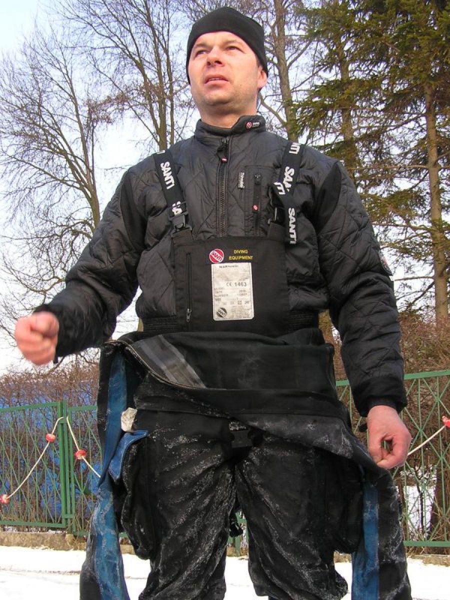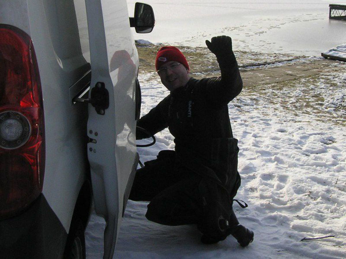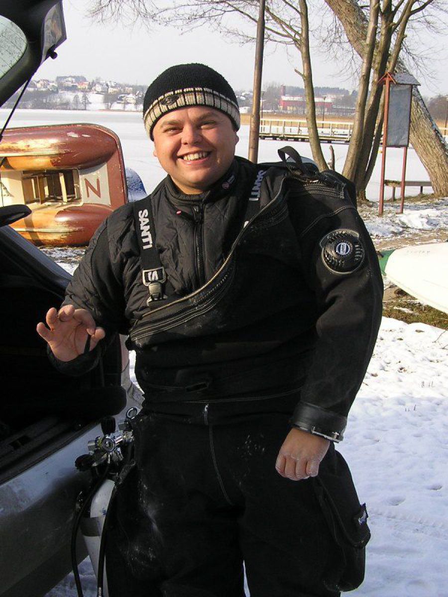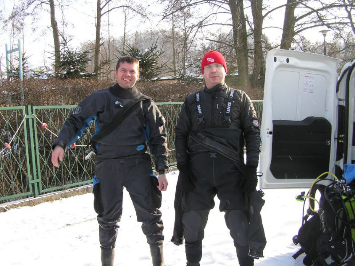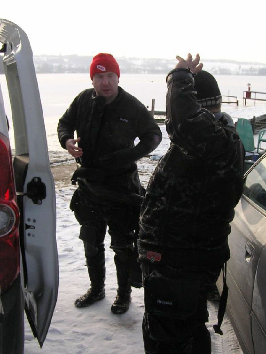 W sobotę wybraliśmy się nad jezioro Białe niedaleko Grzybna. Stan jeziora całkowicie nas jednak zaskoczył. Całe jezioro zamarznięte, okolica pokryta sporą warstwą śniegu, a przy brzegu lód, który ciężko było przebić bez odpowiedniego sprzętu. Przejezdna była jedynie droga dojazdowa do jeziora. Jedno z naszych aut nawet na dobrych kilkanaście minut zakopało się w śniegu. Ciężko tam zaparkować, by nie zablokować innym jedynej przejezdnej drogi. Na Kaszubach zima w pełni. Zrezygnowaliśmy z nurkowania, do którego nie byliśmy dobrze przygotowani i szybko postanowiliśmy pojechać do Chmielna. W Chmielnie było również biało, ale pokrywa lodowa na jeziorze znacznie cieńsza. Temperatura na zewnątrz około -10 oC, a woda przy powierzchni zaledwie 1 oC. Mieliśmy troszkę problemów z zamarzającym sprzętem, bo przebieraliśmy się i przygotowywaliśmy sprzęt na świeżym, rześkim powietrzu o ujemnej temperaturze, ale humory i słońce nam dopisywały. Brak wiatru powodował, że mimo mrozu bardzo przyjemnie się czuliśmy. Po nurkowaniu wzmocniła nas gorąca kawa prosto z termosu przywieziona przez jednego z nas. Mimo zmiany planów, byliśmy zadowoleni z wyprawy. Czuliśmy się świetnie, bo wiedzieliśmy, że nie zmarnowaliśmy weekendowego czasu przed telewizorami, czy na bieganiu po marketach. Wróciliśmy do domów planując już kolejne wyprawy.
