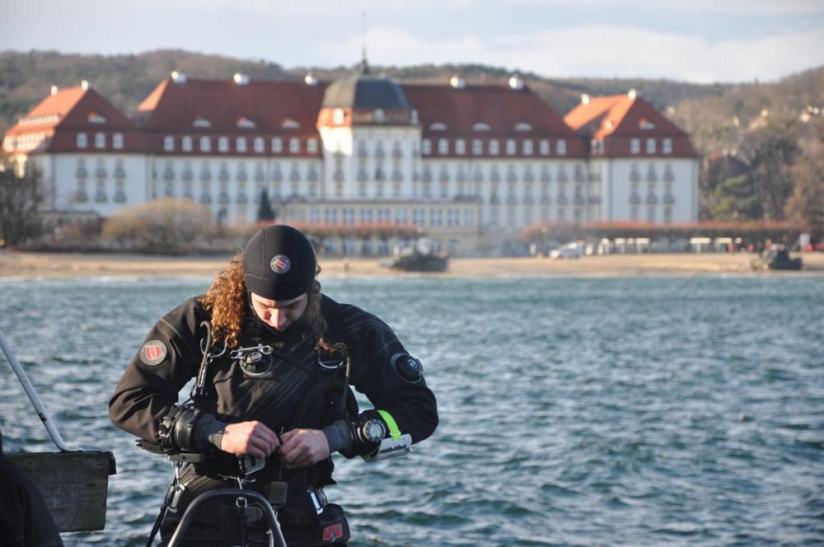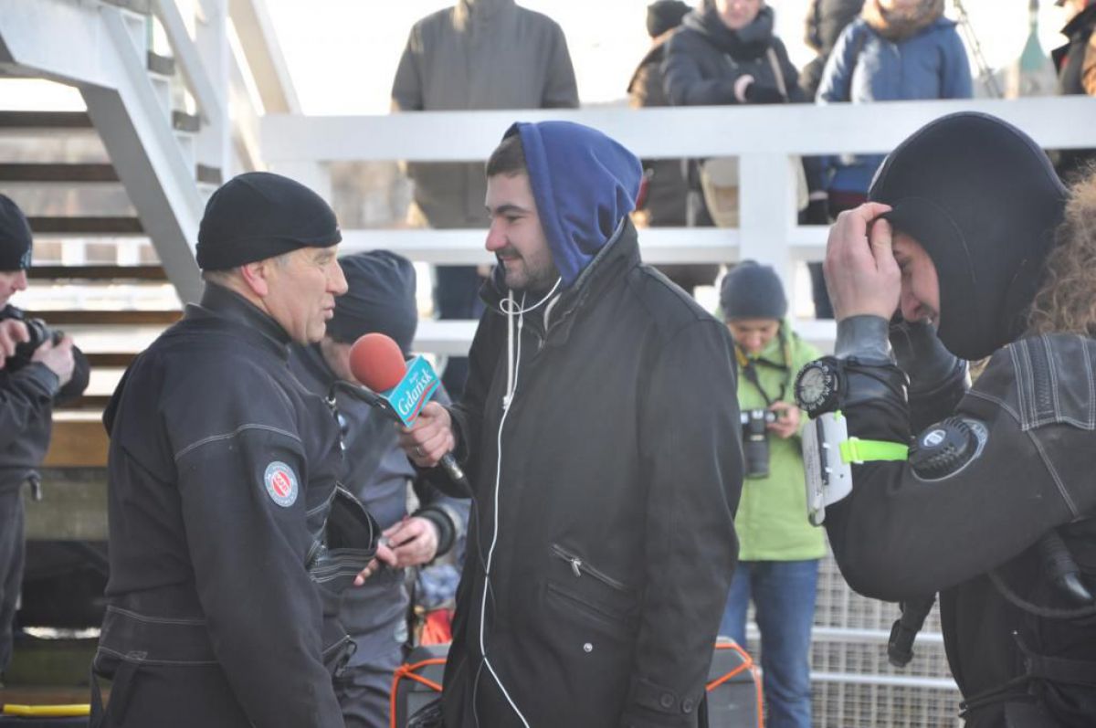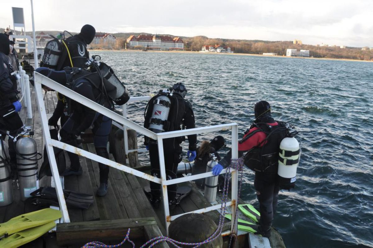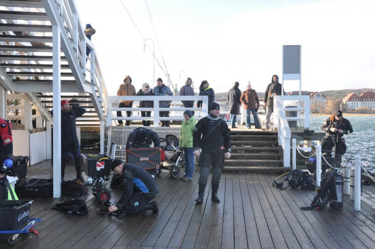 Jest niedzielny dzień styczniowy gra orkiestra już Owsiaka, Sopot wolno się już budzi molo jeszcze puste z rana. Zimny mokry wiatr zacina słońce czasem wyjrzy z góry, a po molo ciągnąc wózki idą same stare nury. Idą sobie zanurkować, bo w zatoce fajna woda, a pod molem jak we wraku można rybki po filmować. Więc skafander suchy wkładam, włączam Santi ogrzewanie i do wody skaczę z mola, reszta nurków skacze za mną. Wolno wpływam między pale płosząc flądry jak talerze, babki razem z miętusami uciekają pod kamienie. Gęsta chmara małych rybek jak mgły obłok świat zasłania i sceneria jak z horroru tuż przed nami się odsłania. Ktoś, kto nie był nie zrozumie jak cudownie jest pod wodą i nie tylko tam gdzie ciepło, ale zimą tu pod molo.
