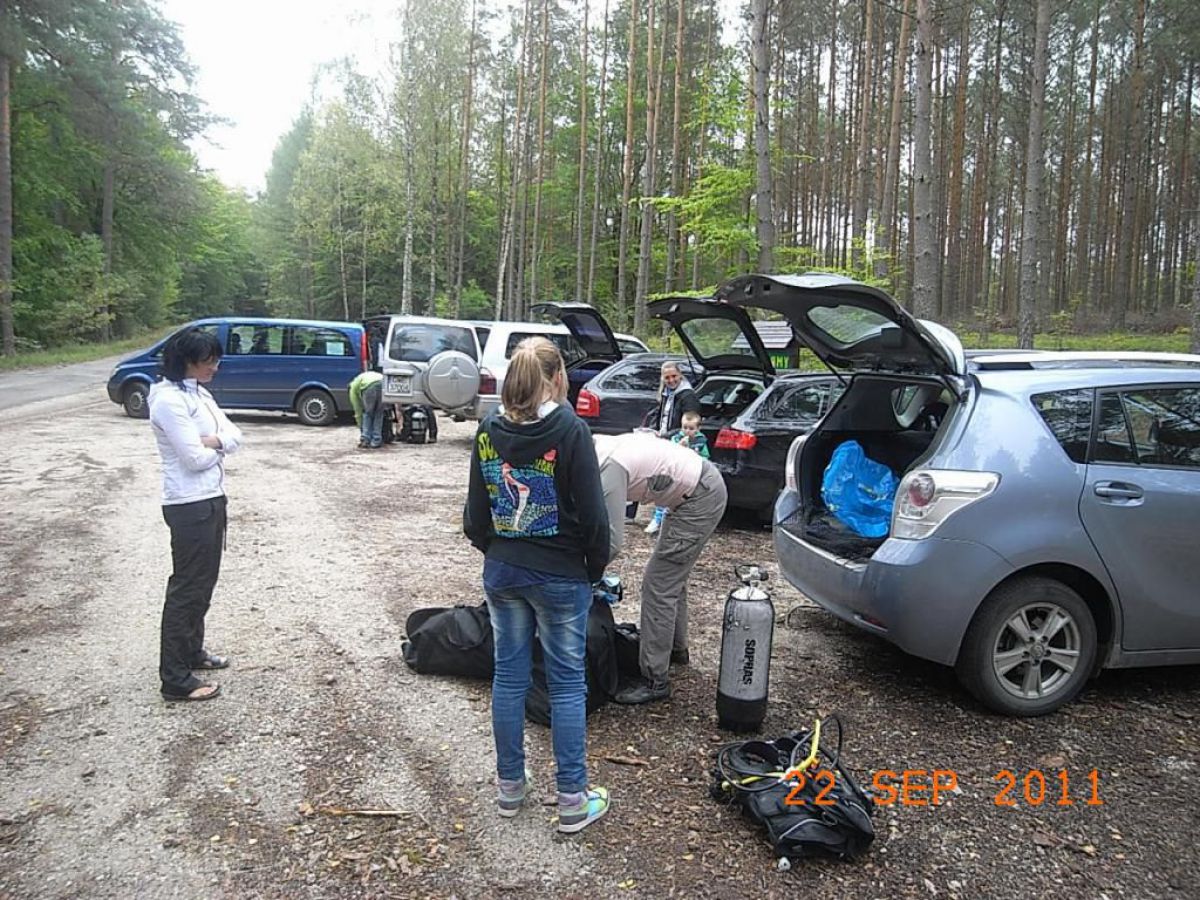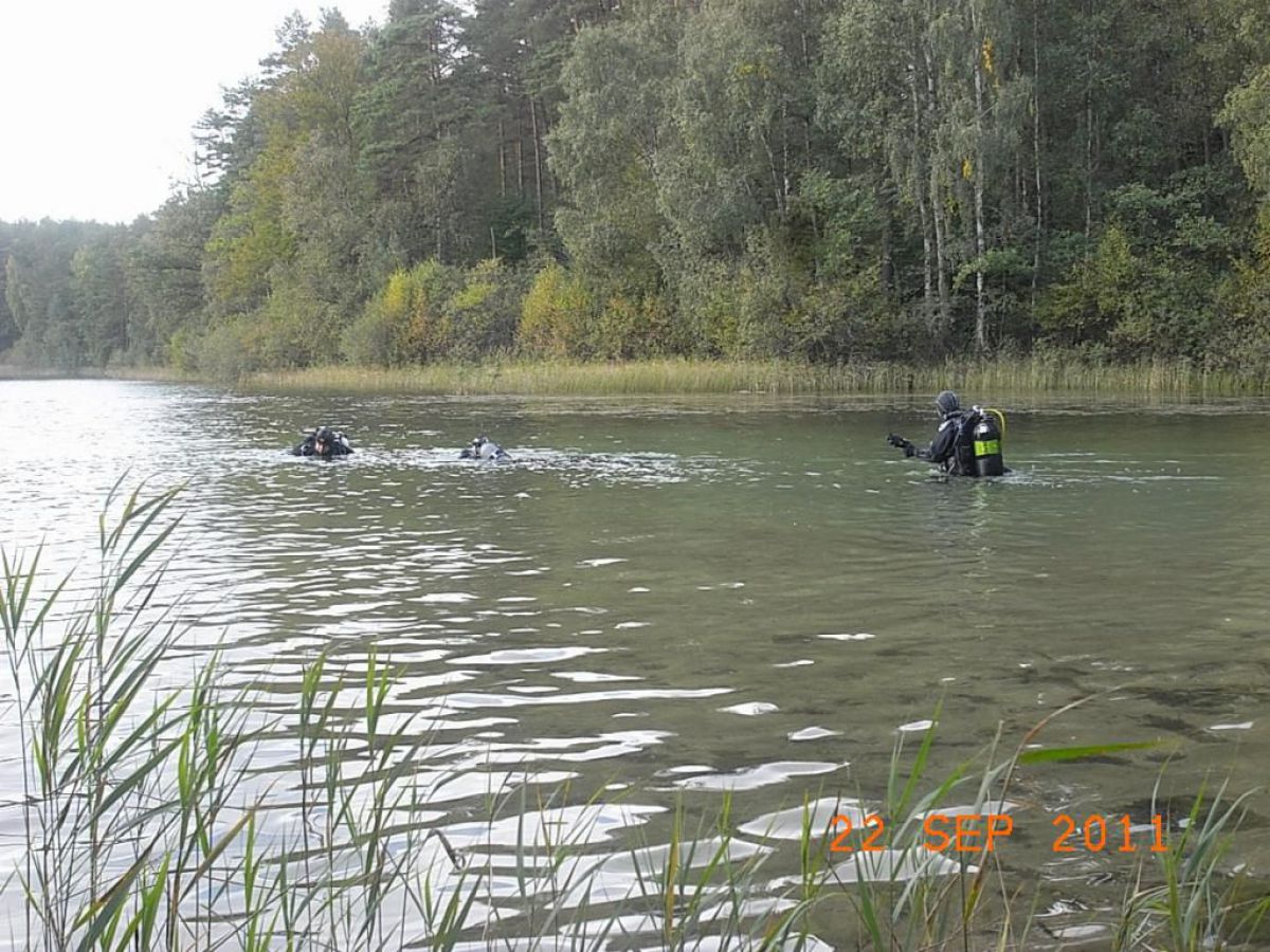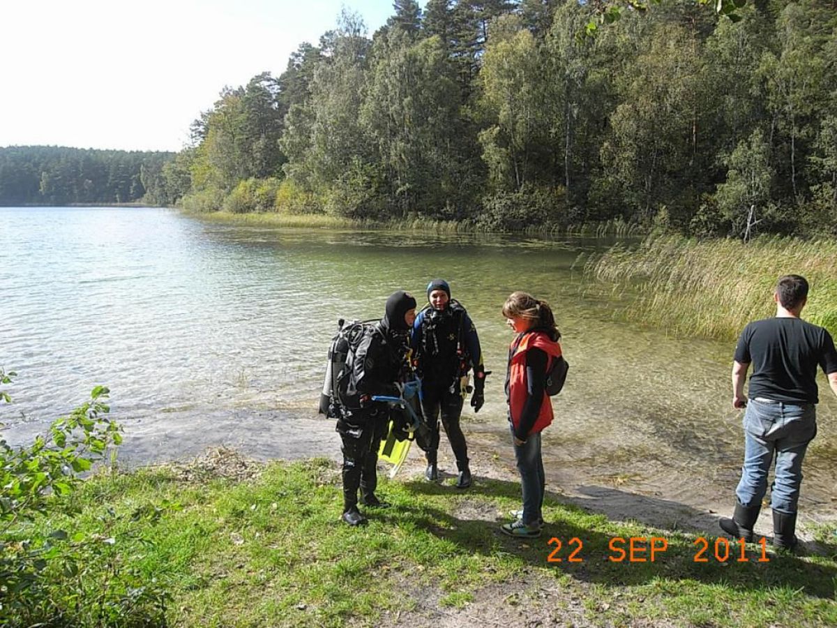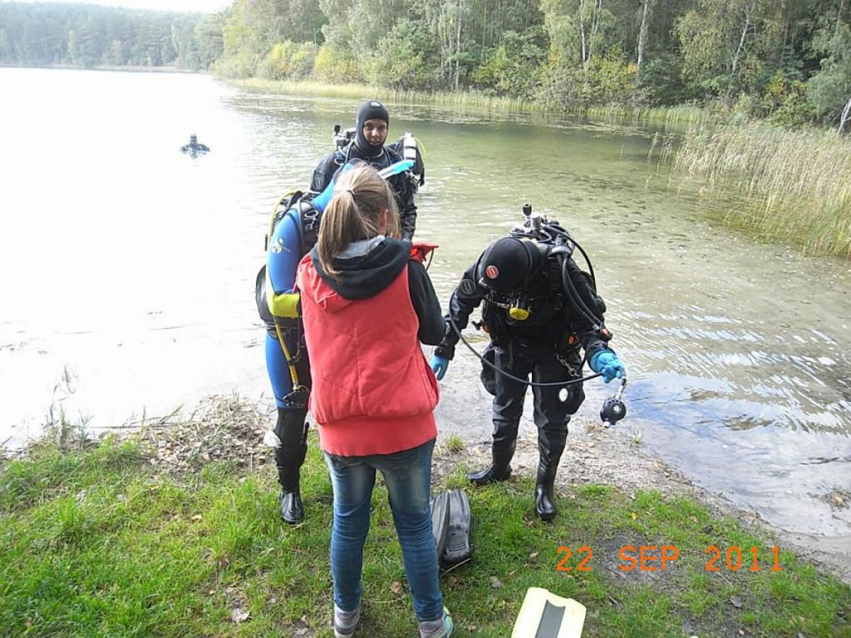 topniu odwdzięczyć się matce ziemi za to co nam ofiaruje i wzięliśmy udział w Sprzątaniu Świata, wybierając jedną z jej perełek jezioro nomen omen Zmarłe. Dwugodzinna podróż samochodem przez piękna kaszubską ziemię i jesteśmy w miejscowości o swojsko brzmiącej nazwie LASKA. Przywitał nas kierownik Zaborskiego Parku Krajobrazowego Mariusz Grzempa bardzo sympatyczny i zaangażowany w ochronę przyrody pasjonat. Po ubraniu skafandrów i zabraniu worków na śmieci nurkowie poszli pod wodę w poszukiwaniu wyrobów naszej cywilizacji. Po godzinnym nurkowaniu wypełniliśmy zaledwie częściowo jeden worek, a pan Mariusz dopełnił go śmieciami zebranymi na brzegu,