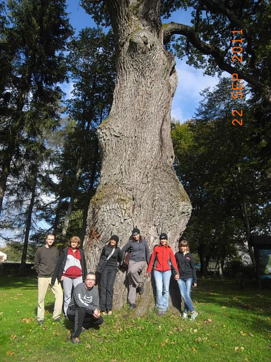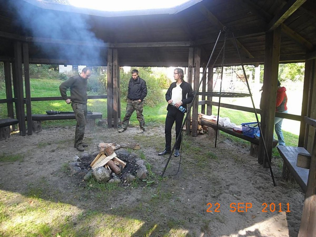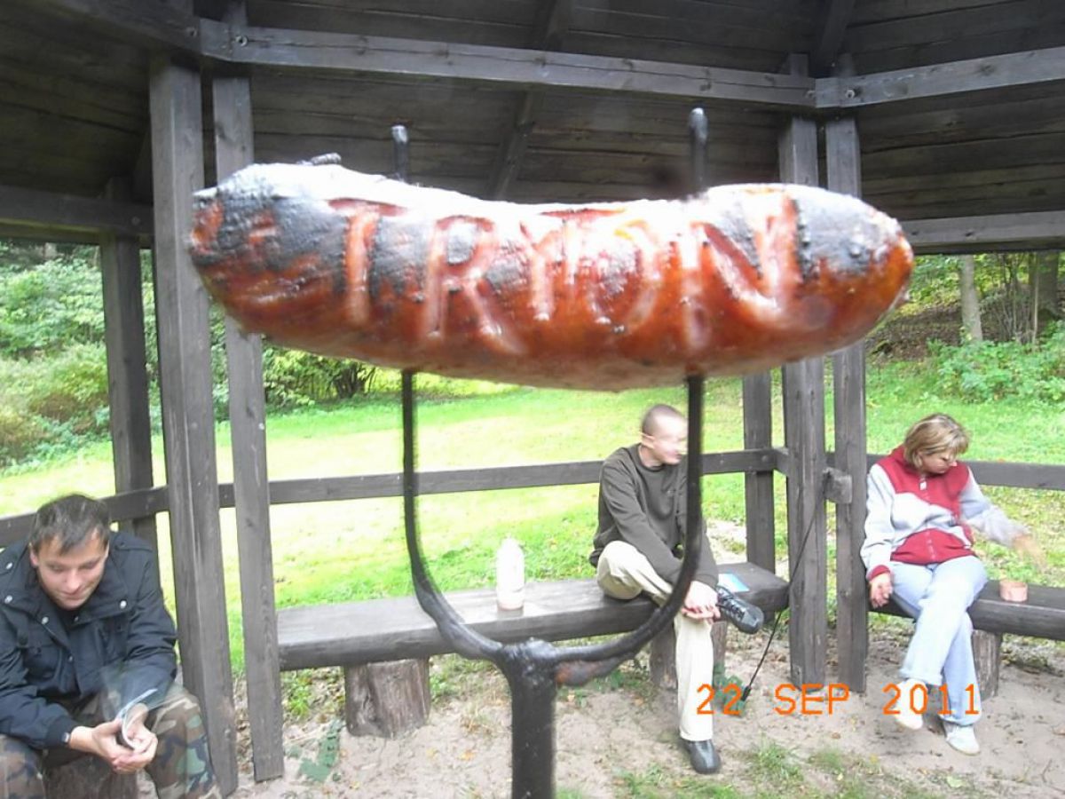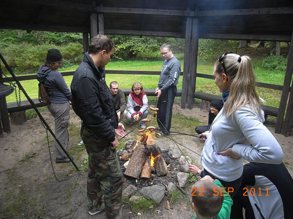 głównie produktami Durex ??? No wiecie były wakacje było ciepło więc trochę rozluźnienia w narodzie nie zaszkodzi a szczególnie w tej jego młodszej części. Po nurkowaniu w naprawdę urokliwym i czystym jeziorku kierownik Mariusz Grzempa zaprosił nas na ognisko przy siedzibie nadleśnictwa Przymuszewo. Zielona polana z równo skoszoną trawą zadbanym podjazdem i otoczeniem, gdzie widać gospodarską rękę, zrobiła na nas miłe wrażenie. Słońce które wreszcie wyszło z za chmury rozświetliło polanę gdzie stoi ogromny dąb Łokietka, rośnie mały dąb Jana Pawła II i my z kiełbaskami przy ognisku. Zresztą wszystko widać na zdjęciach i pozostaje mi tylko zaprosić was na inne wyjazdy w również fajne i urokliwe miejsca.