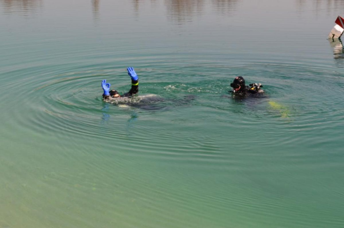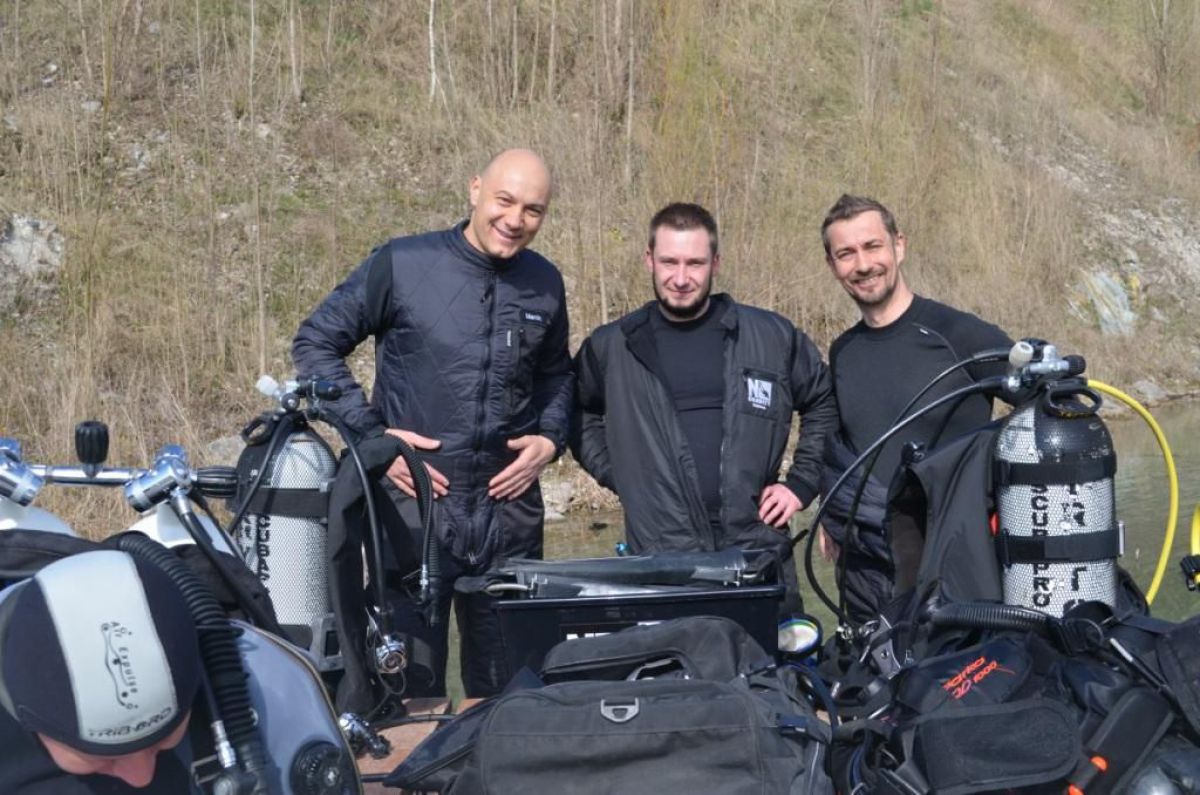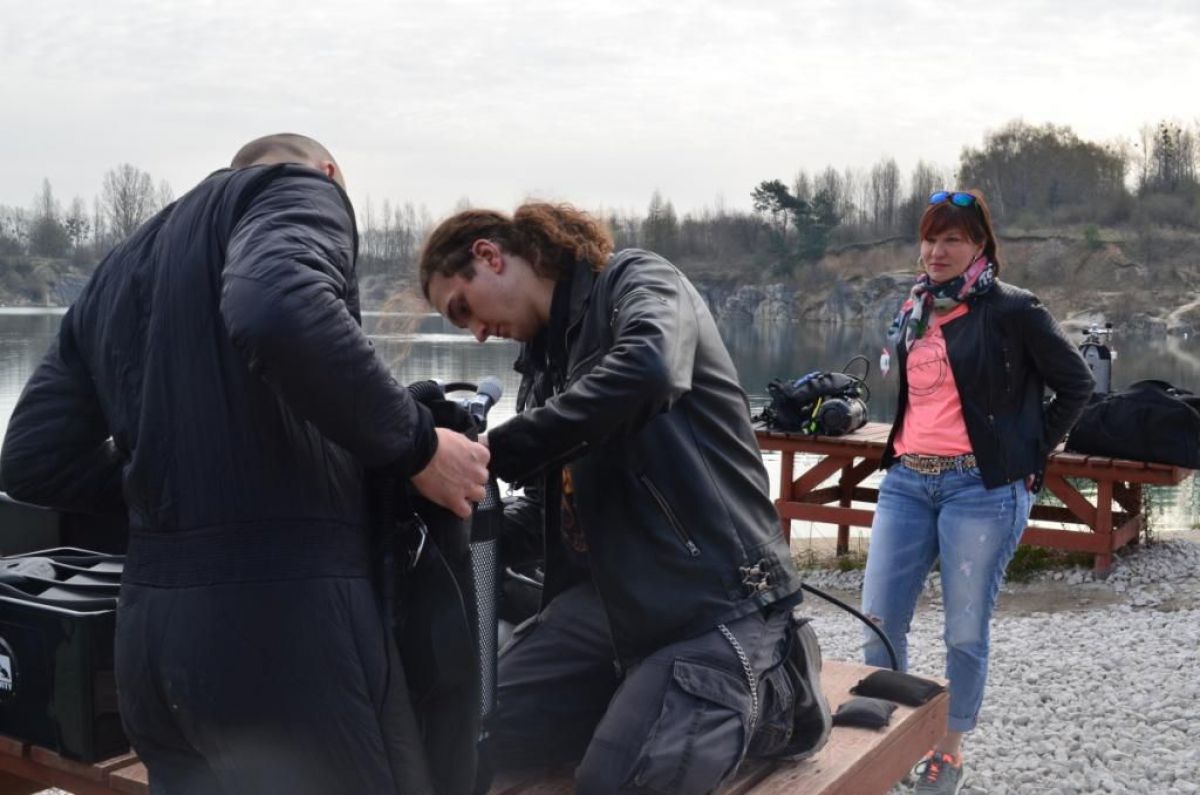 Droga jest długa, więc trzeba ją pokonać szybko i tym sposobem już chwilę przed 10-tą rozpakowywaliśmy sprzęt na pomoście. Nie obyło się bez „mokrych” napraw, ktoś zapomniał wężyka do „suchara” innemu brakowało balastu. Jednakże, wszystkiemu zaradziliśmy dość szybko i już o 11:00 pokazałem grupie kciuka w dół i rozpoczęliśmy nurkowanie. Na pierwsze zanurzenie wybraliśmy tę głębszą –prawą stronę zbiornika. Od razu urzekła nas niebiesko-zielona czystość wody dająca niecałe 10 metrów widoczności oraz, wyjątkowo wysoka temperatura, bo na 17 metrach nadal utrzymywało się 8 stopni!.