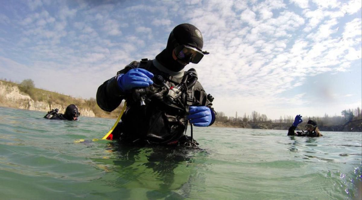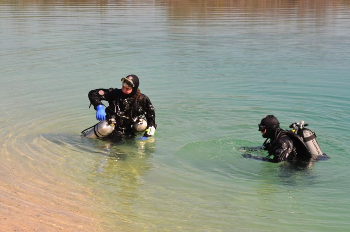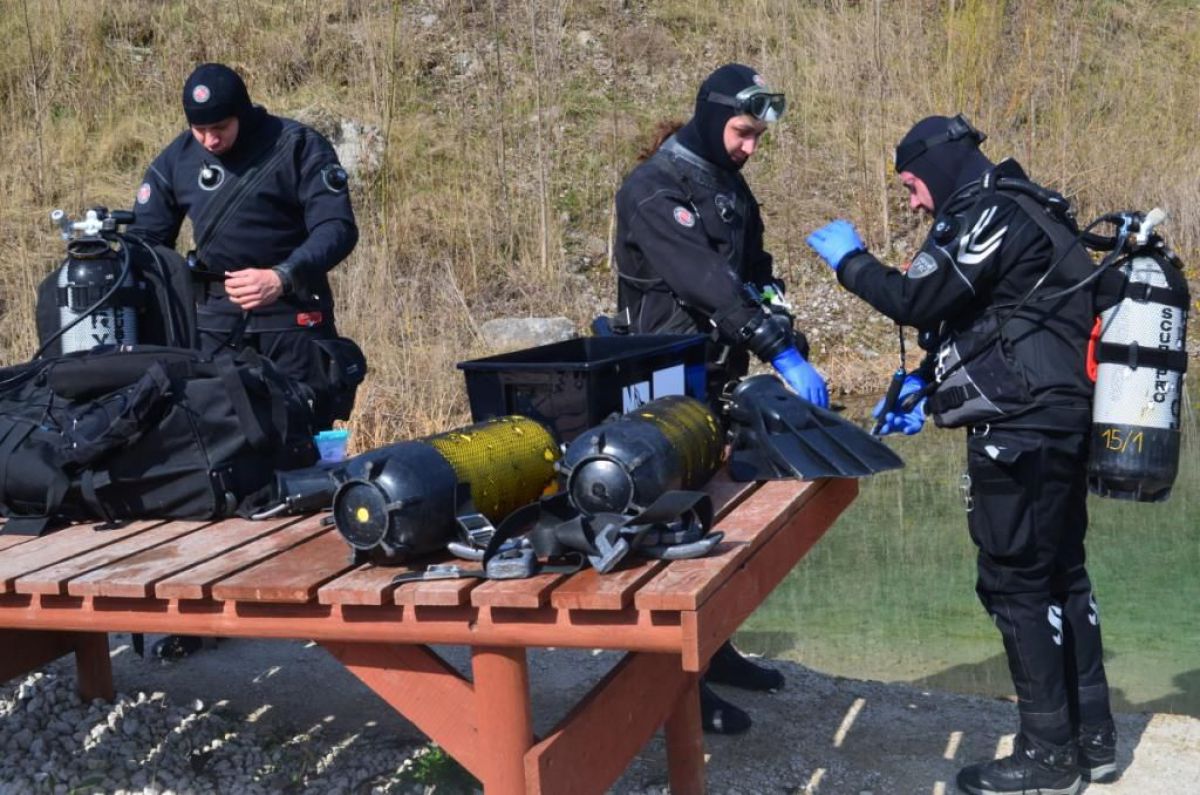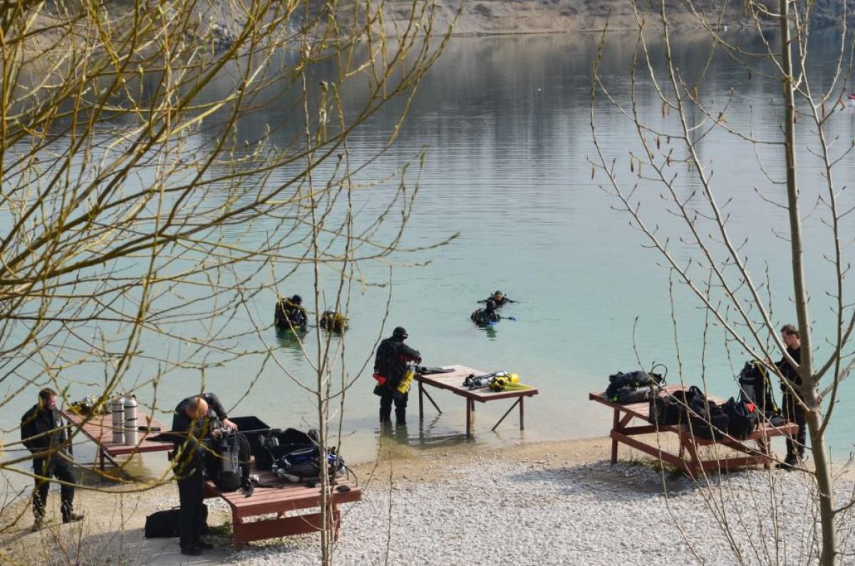 Droga jest długa, więc trzeba ją pokonać szybko i tym sposobem już chwilę przed 10-tą rozpakowywaliśmy sprzęt na pomoście. Nie obyło się bez „mokrych” napraw, ktoś zapomniał wężyka do „suchara” innemu brakowało balastu. Jednakże, wszystkiemu zaradziliśmy dość szybko i już o 11:00 pokazałem grupie kciuka w dół i rozpoczęliśmy nurkowanie. Na pierwsze zanurzenie wybraliśmy tę głębszą –prawą stronę zbiornika. Od razu urzekła nas niebiesko-zielona czystość wody dająca niecałe 10 metrów widoczności oraz, wyjątkowo wysoka temperatura, bo na 17 metrach nadal utrzymywało się 8 stopni!.