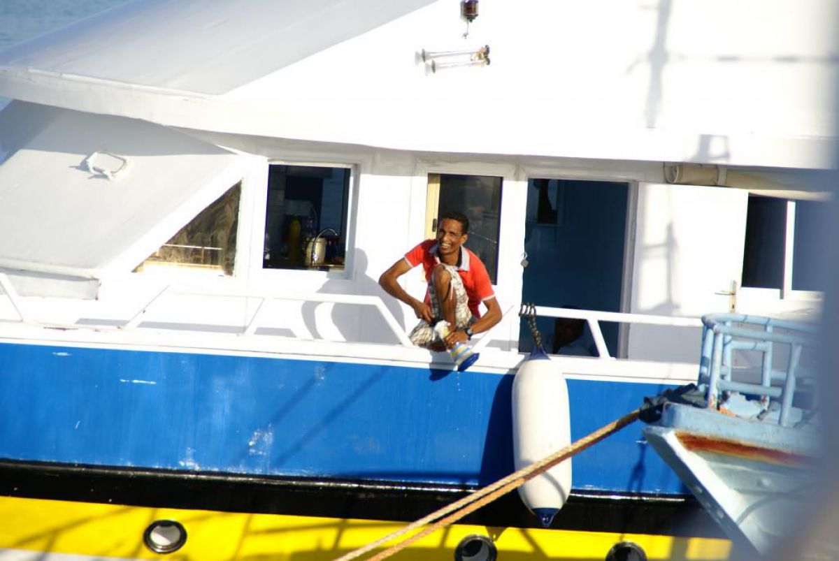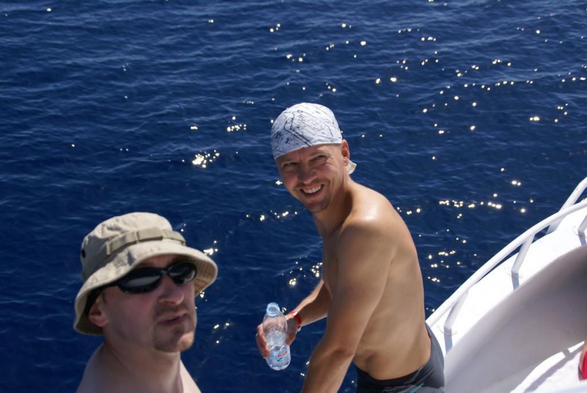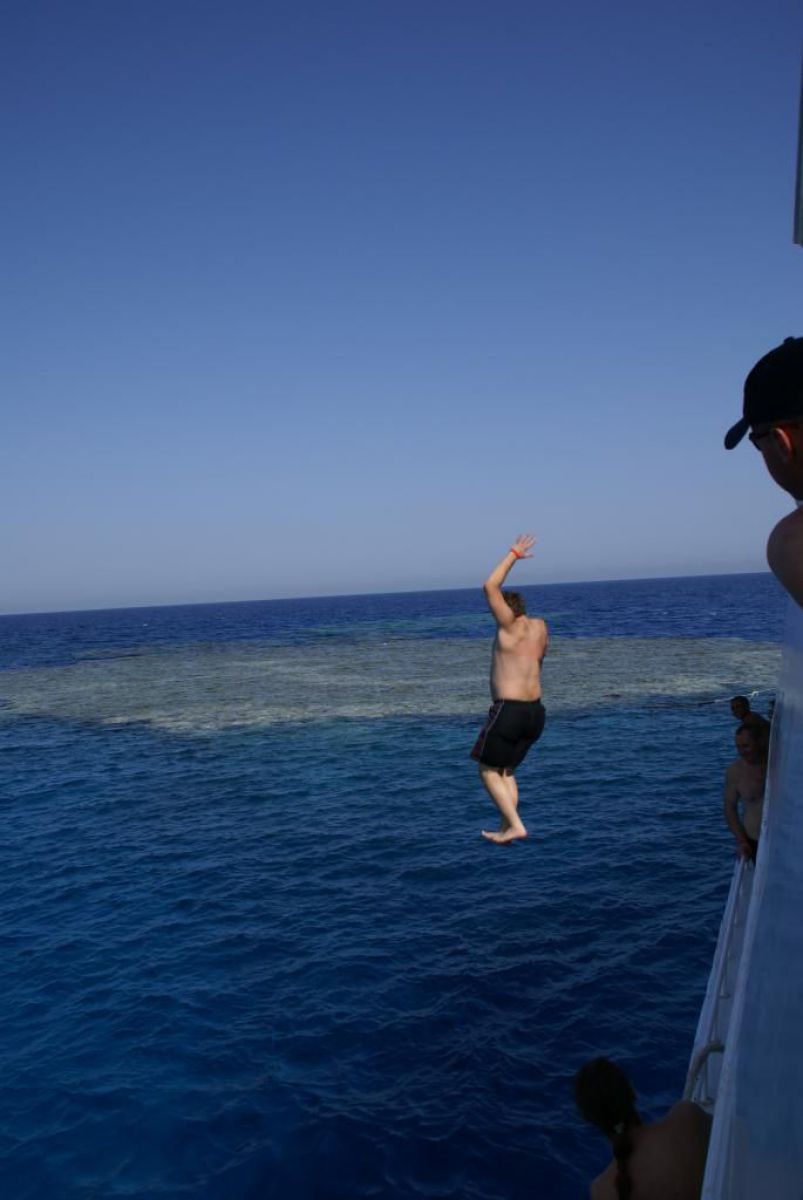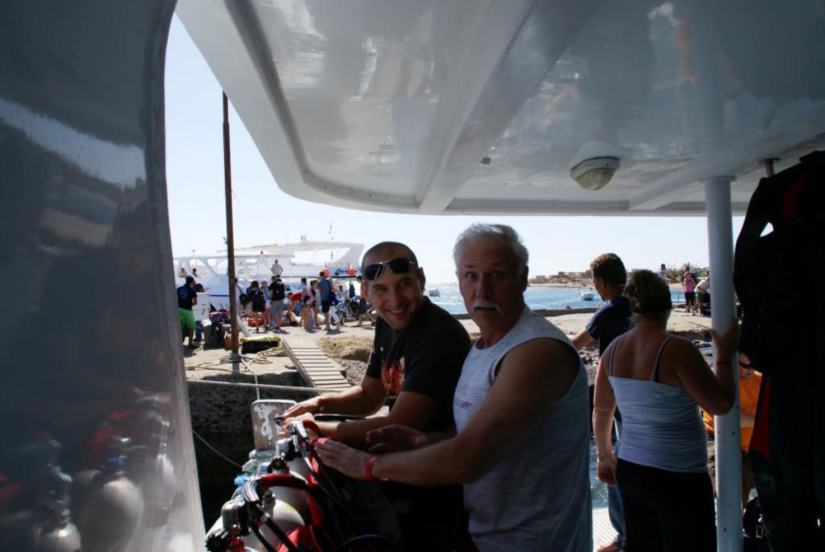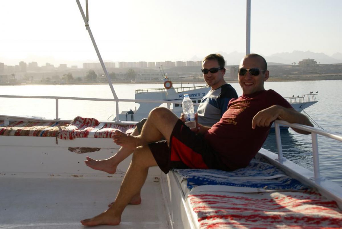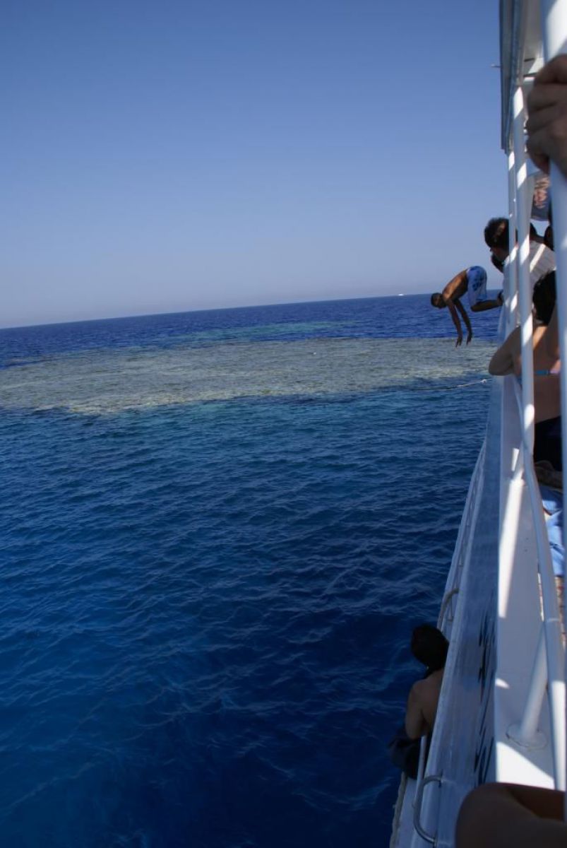 Następnego dnia busiki zabierają nas z całym majdanem nurkowym do portu, gdzie wchodzimy na pokład naszej łodzi nurkowej. Powietrze gorące jak w saunie, choć lekki zefirek dmucha, słońce praży, a w koło piękna lazurowa woda choć morze jest z nazwy czerwone??? Parkujemy przy rafie, krótki briefing i do wody, a woda ciepła i przezroczysta, a na dodatek wokół koralowej rafy pełno kolorowych rybek, normalnie akwarium.