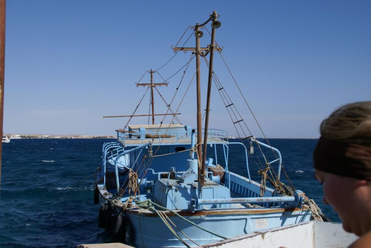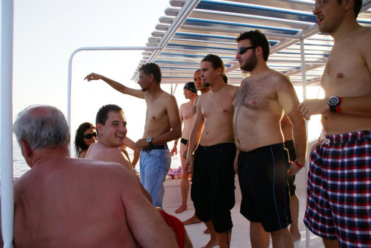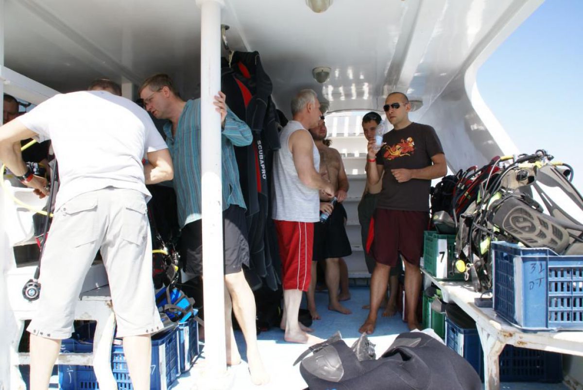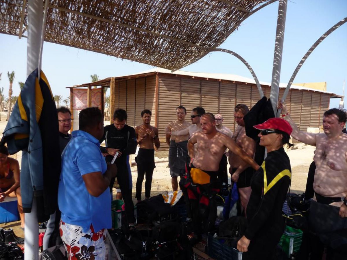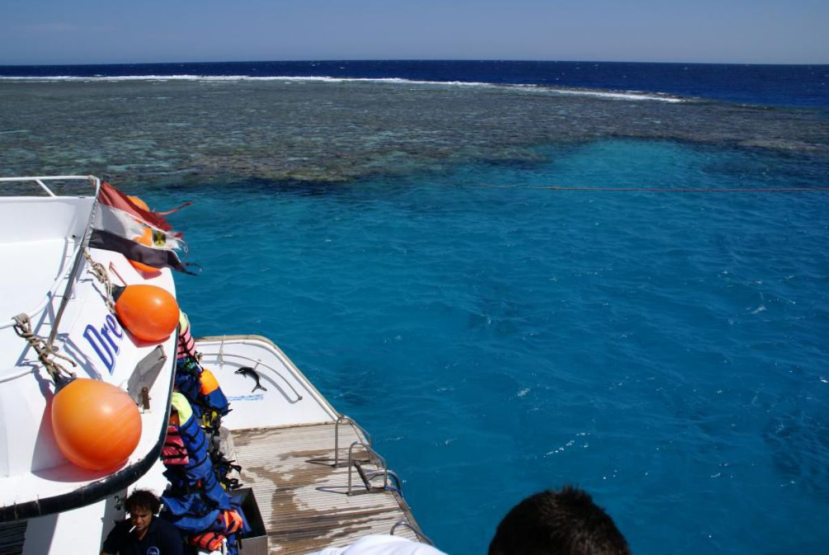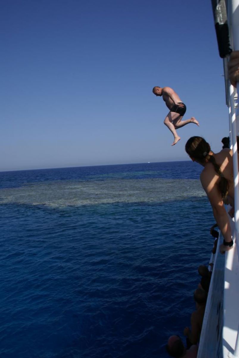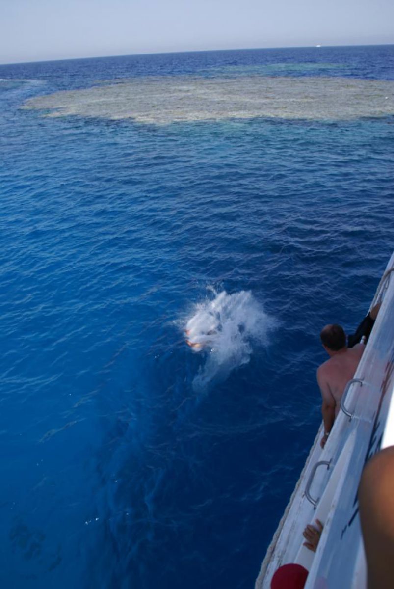 Następnego dnia busiki zabierają nas z całym majdanem nurkowym do portu, gdzie wchodzimy na pokład naszej łodzi nurkowej. Powietrze gorące jak w saunie, choć lekki zefirek dmucha, słońce praży, a w koło piękna lazurowa woda choć morze jest z nazwy czerwone??? Parkujemy przy rafie, krótki briefing i do wody, a woda ciepła i przezroczysta, a na dodatek wokół koralowej rafy pełno kolorowych rybek, normalnie akwarium.