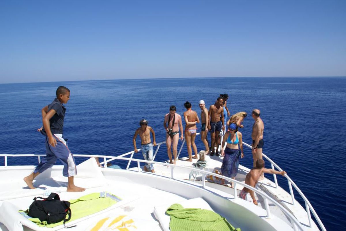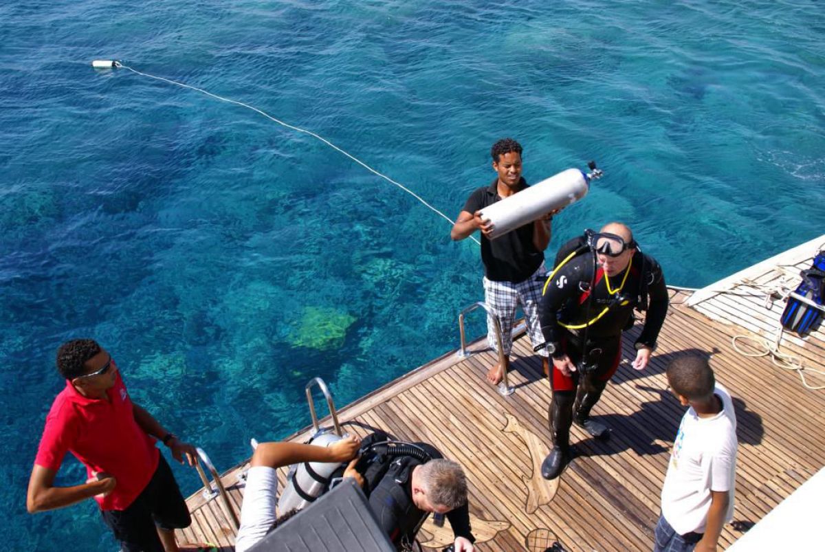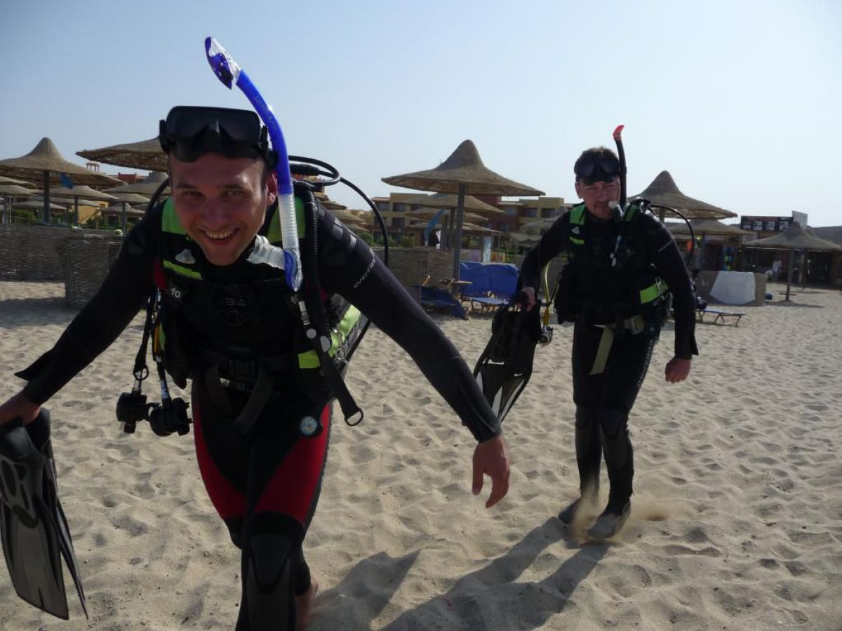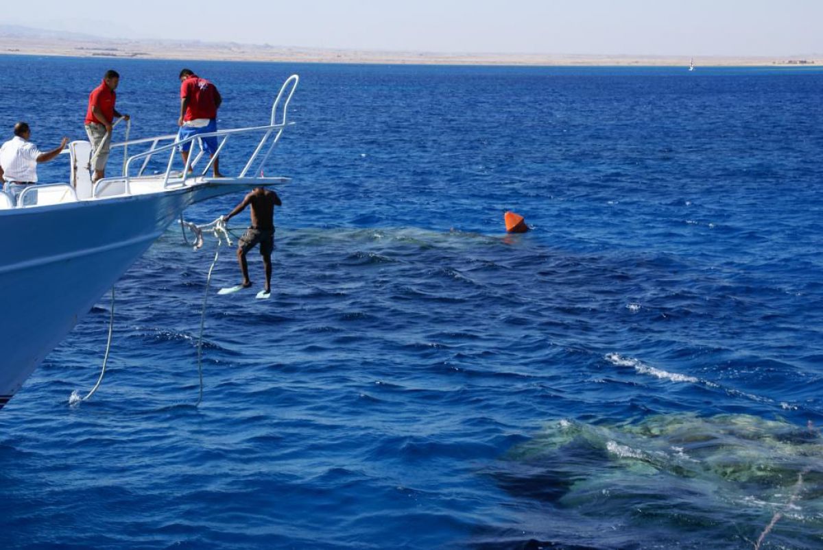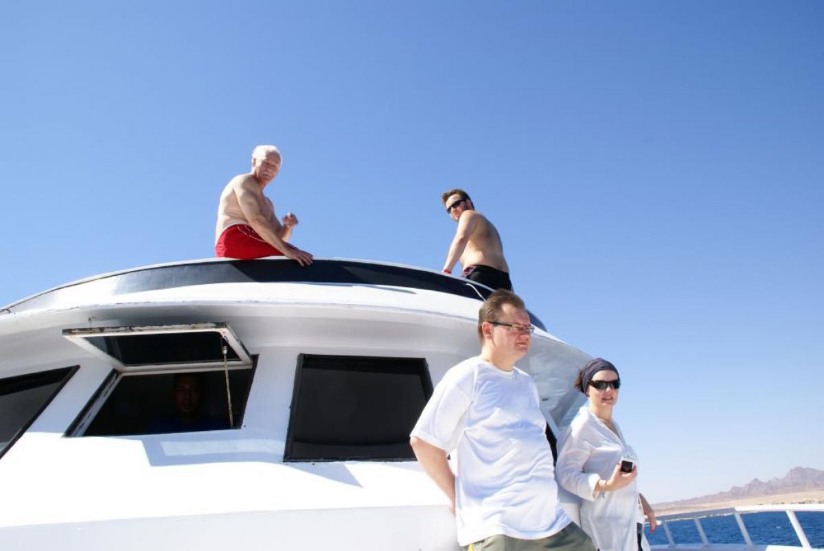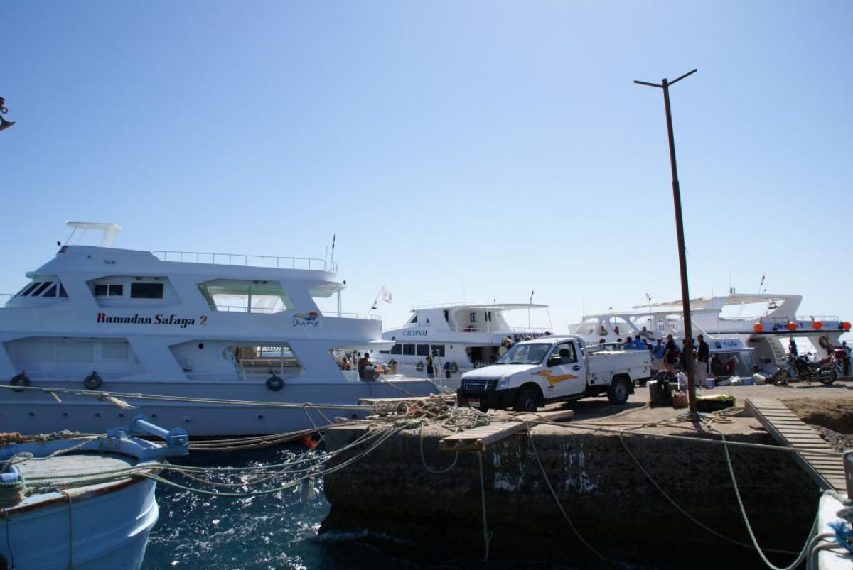 Następnego dnia busiki zabierają nas z całym majdanem nurkowym do portu, gdzie wchodzimy na pokład naszej łodzi nurkowej. Powietrze gorące jak w saunie, choć lekki zefirek dmucha, słońce praży, a w koło piękna lazurowa woda choć morze jest z nazwy czerwone??? Parkujemy przy rafie, krótki briefing i do wody, a woda ciepła i przezroczysta, a na dodatek wokół koralowej rafy pełno kolorowych rybek, normalnie akwarium.