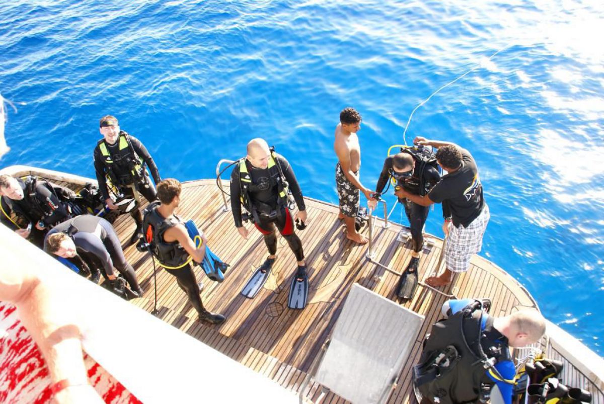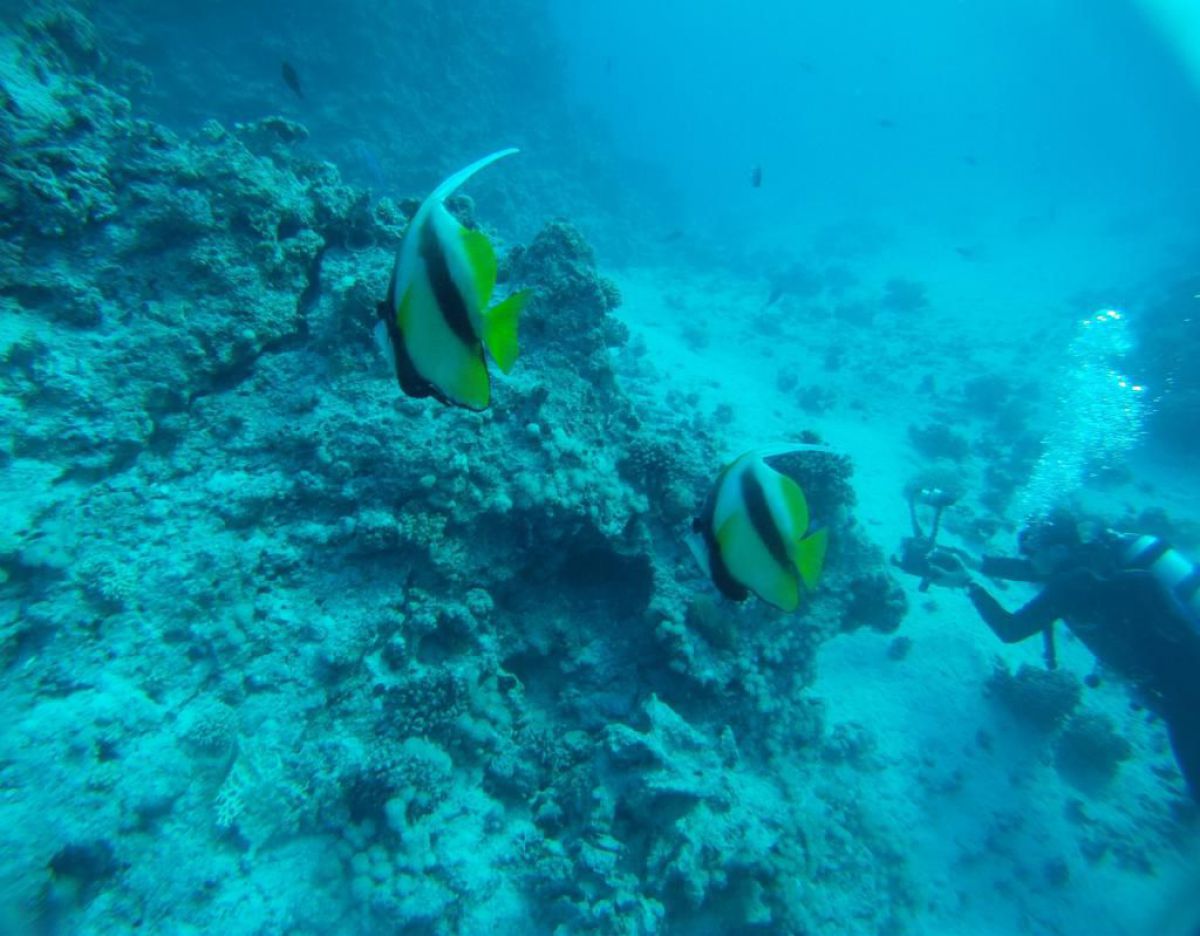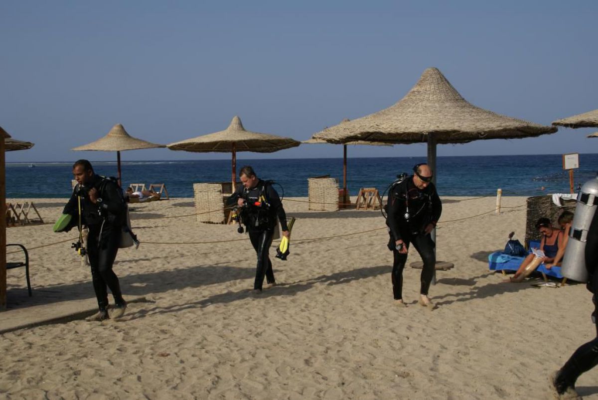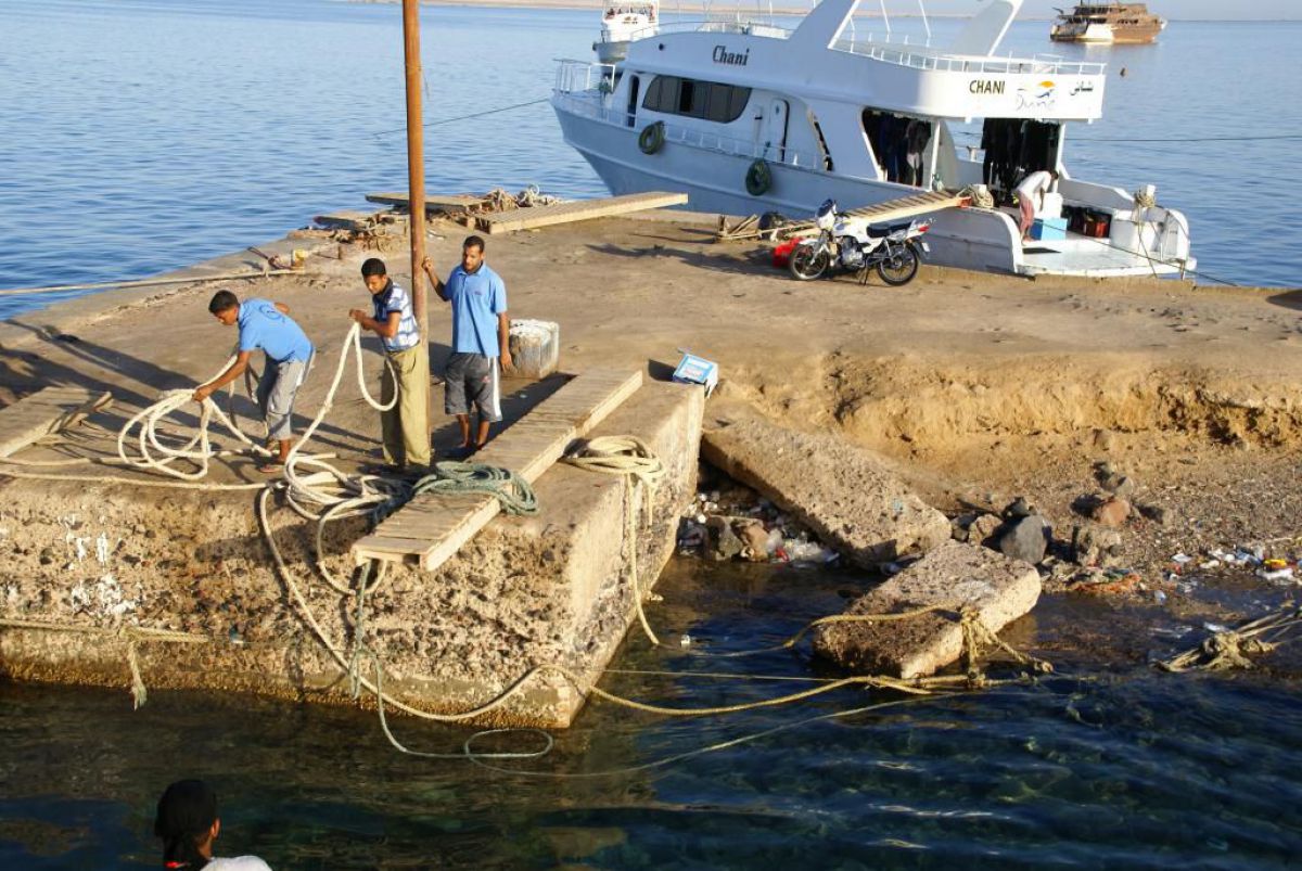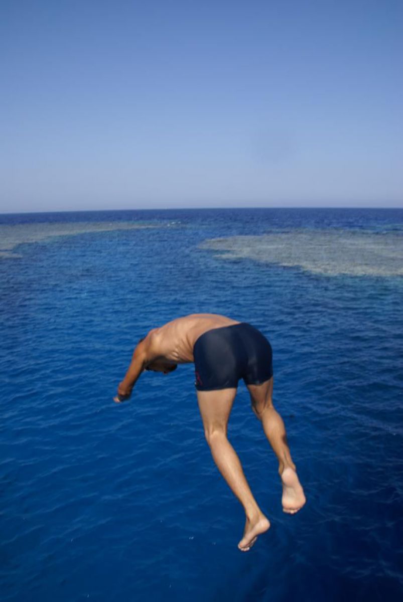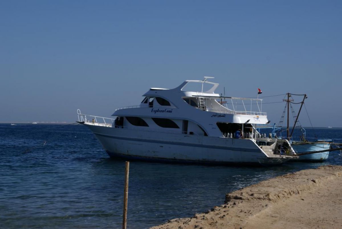 Następnego dnia busiki zabierają nas z całym majdanem nurkowym do portu, gdzie wchodzimy na pokład naszej łodzi nurkowej. Powietrze gorące jak w saunie, choć lekki zefirek dmucha, słońce praży, a w koło piękna lazurowa woda choć morze jest z nazwy czerwone??? Parkujemy przy rafie, krótki briefing i do wody, a woda ciepła i przezroczysta, a na dodatek wokół koralowej rafy pełno kolorowych rybek, normalnie akwarium.