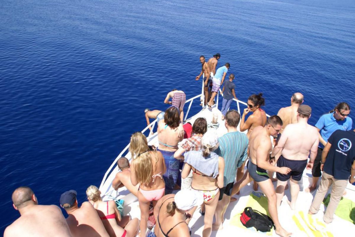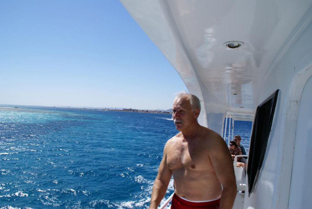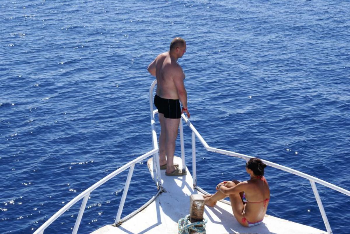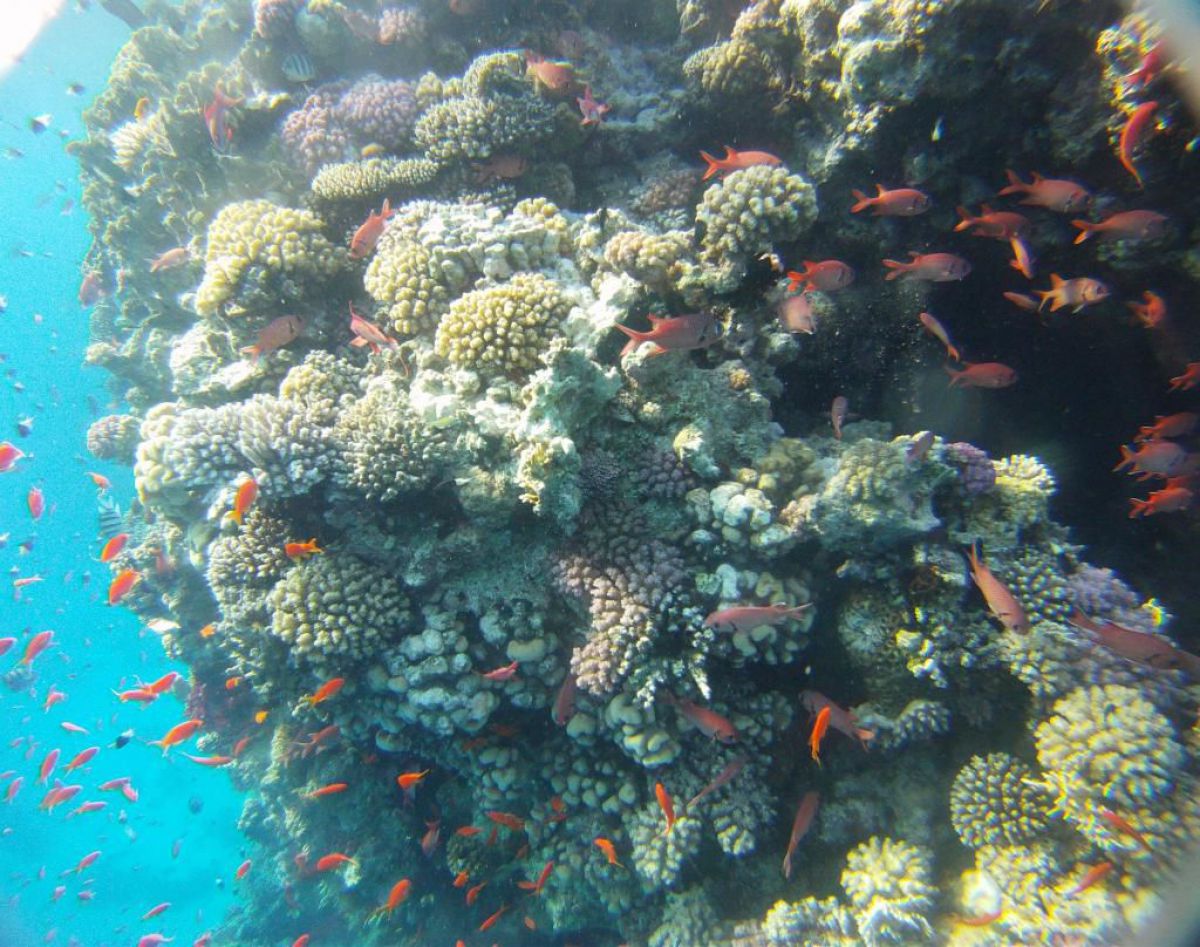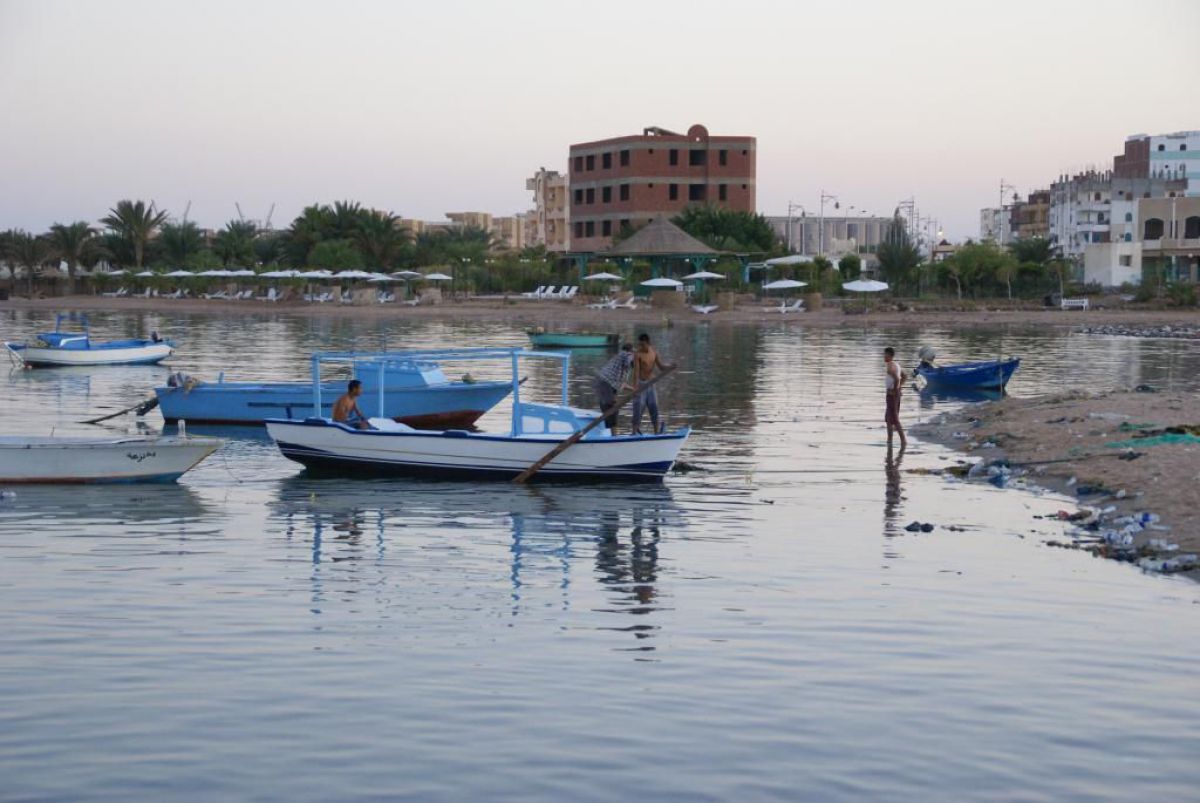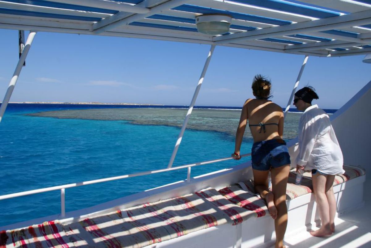 Następnego dnia busiki zabierają nas z całym majdanem nurkowym do portu, gdzie wchodzimy na pokład naszej łodzi nurkowej. Powietrze gorące jak w saunie, choć lekki zefirek dmucha, słońce praży, a w koło piękna lazurowa woda choć morze jest z nazwy czerwone??? Parkujemy przy rafie, krótki briefing i do wody, a woda ciepła i przezroczysta, a na dodatek wokół koralowej rafy pełno kolorowych rybek, normalnie akwarium.