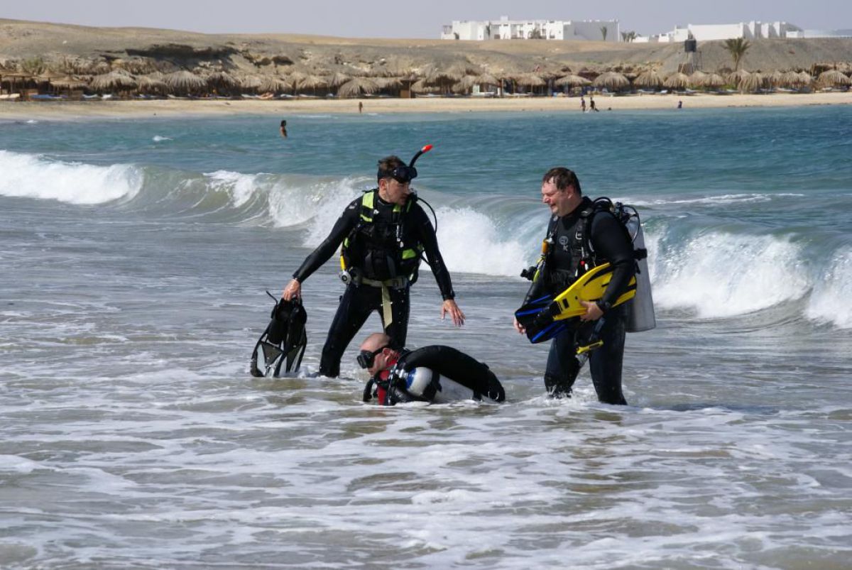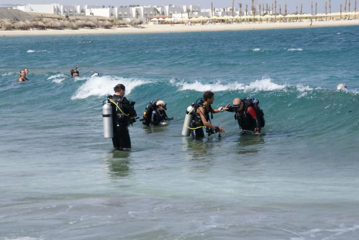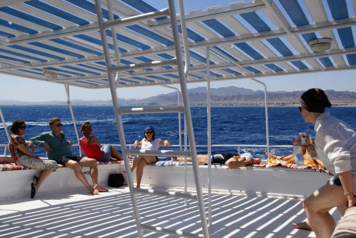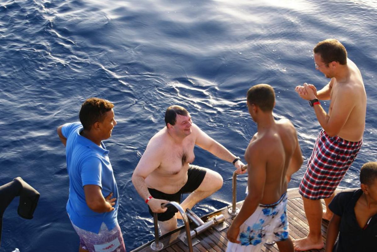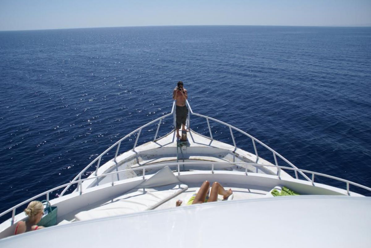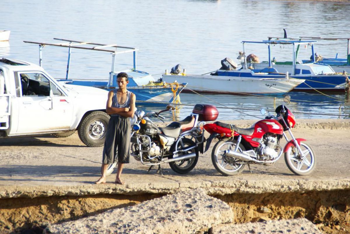 Następnego dnia busiki zabierają nas z całym majdanem nurkowym do portu, gdzie wchodzimy na pokład naszej łodzi nurkowej. Powietrze gorące jak w saunie, choć lekki zefirek dmucha, słońce praży, a w koło piękna lazurowa woda choć morze jest z nazwy czerwone??? Parkujemy przy rafie, krótki briefing i do wody, a woda ciepła i przezroczysta, a na dodatek wokół koralowej rafy pełno kolorowych rybek, normalnie akwarium.