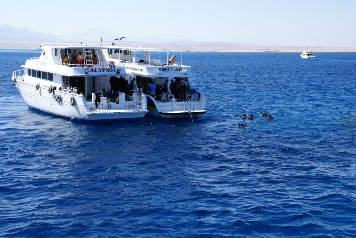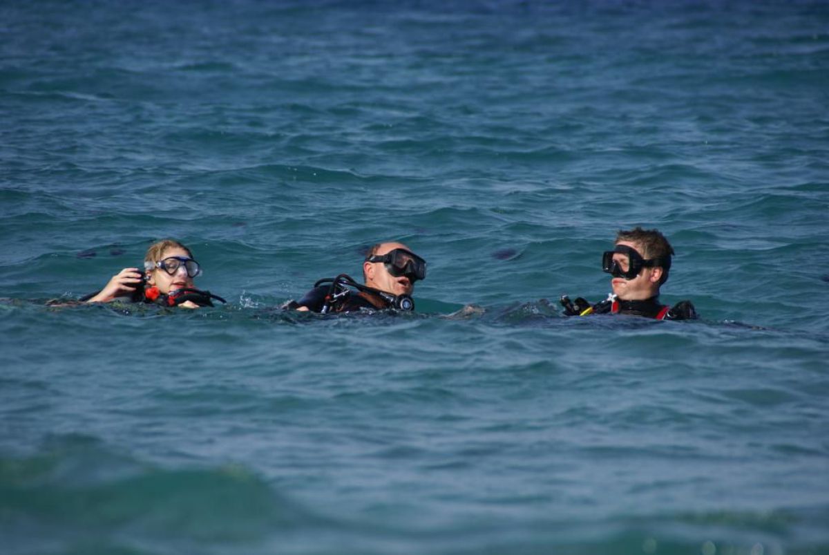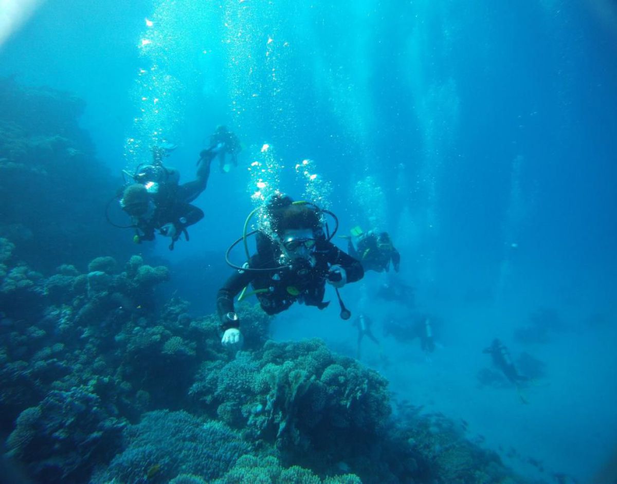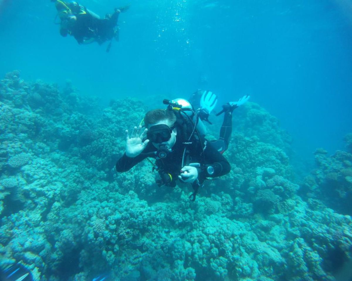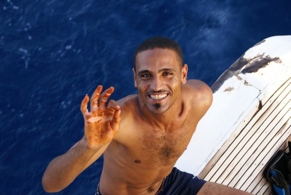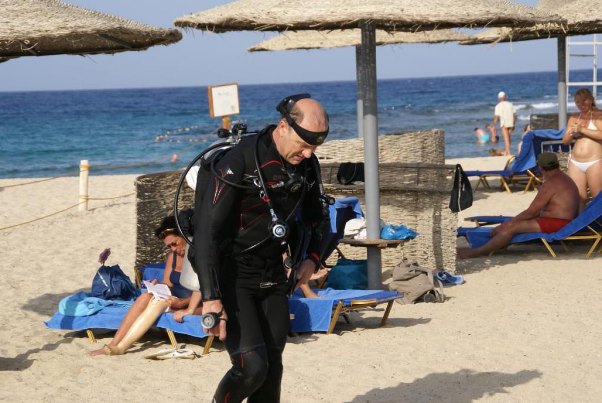 Następnego dnia busiki zabierają nas z całym majdanem nurkowym do portu, gdzie wchodzimy na pokład naszej łodzi nurkowej. Powietrze gorące jak w saunie, choć lekki zefirek dmucha, słońce praży, a w koło piękna lazurowa woda choć morze jest z nazwy czerwone??? Parkujemy przy rafie, krótki briefing i do wody, a woda ciepła i przezroczysta, a na dodatek wokół koralowej rafy pełno kolorowych rybek, normalnie akwarium.