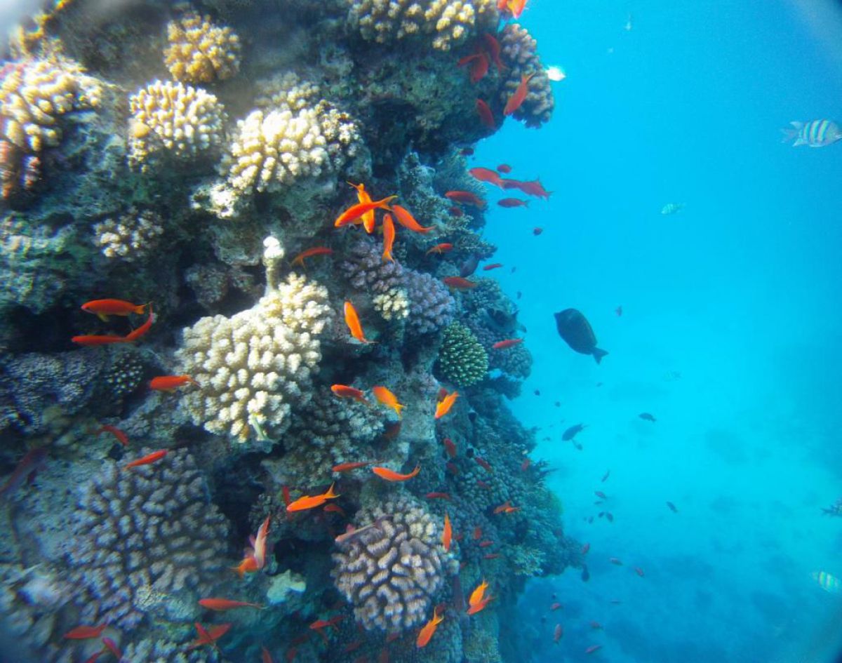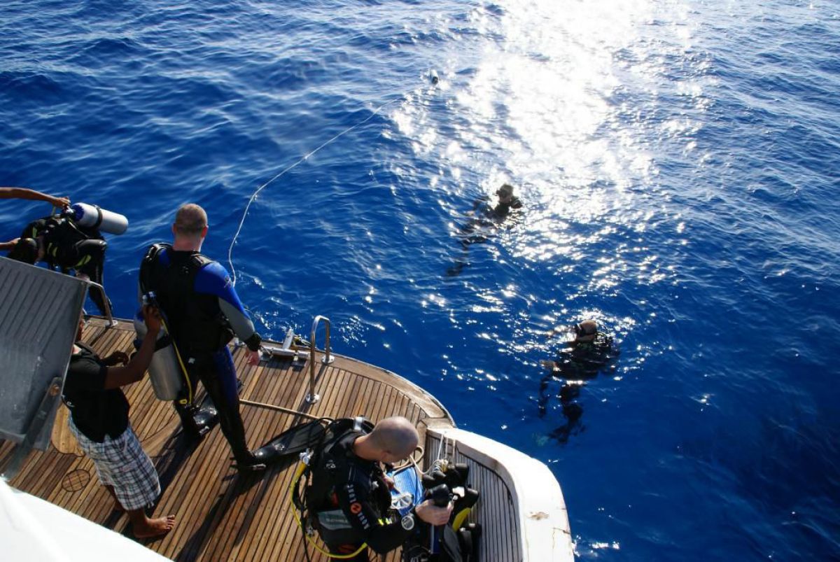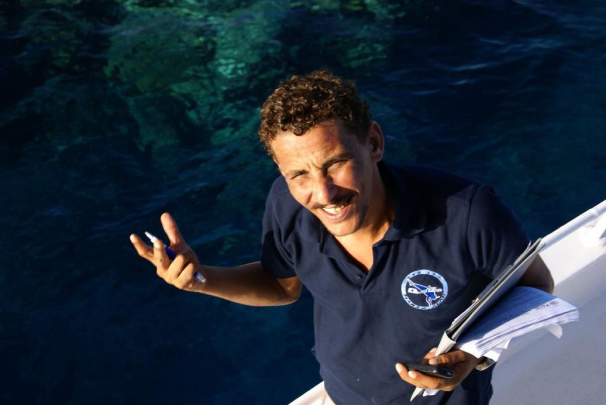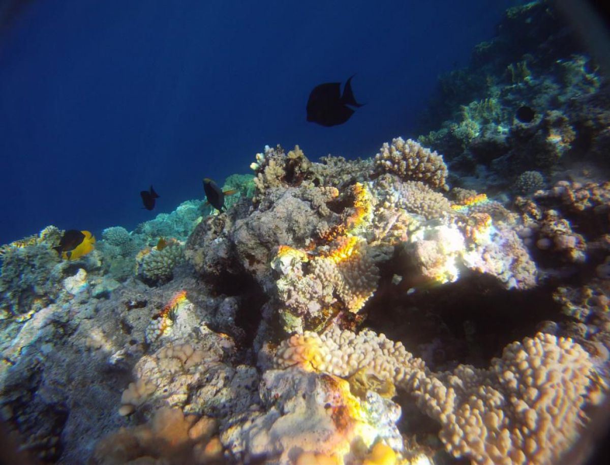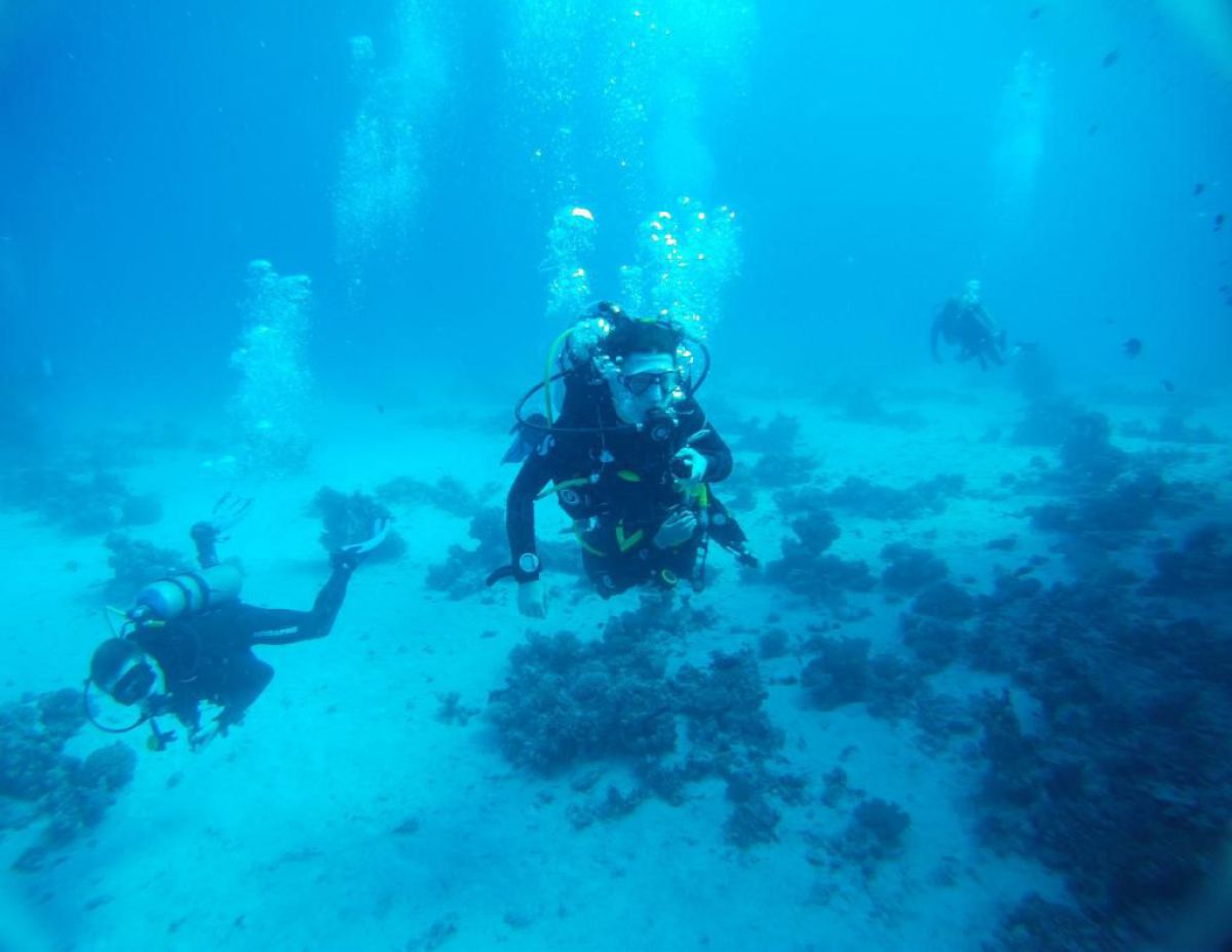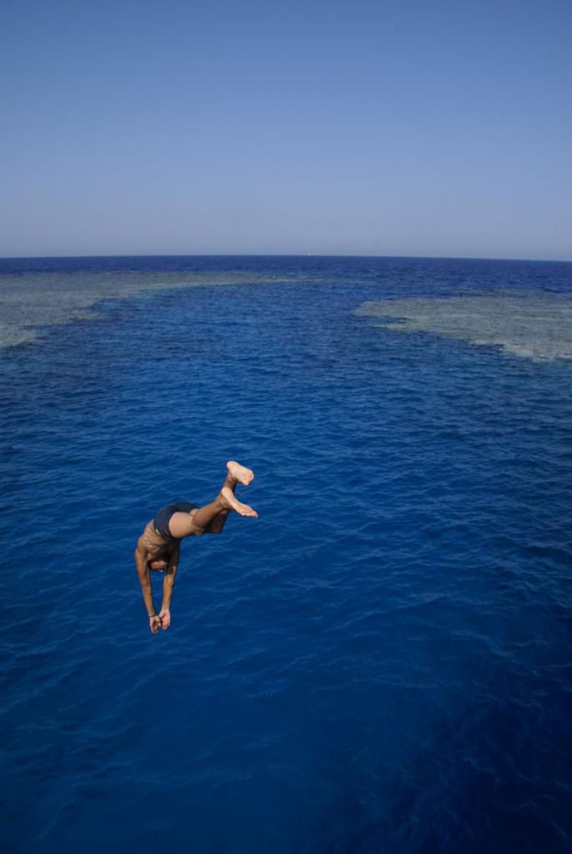 Następnego dnia busiki zabierają nas z całym majdanem nurkowym do portu, gdzie wchodzimy na pokład naszej łodzi nurkowej. Powietrze gorące jak w saunie, choć lekki zefirek dmucha, słońce praży, a w koło piękna lazurowa woda choć morze jest z nazwy czerwone??? Parkujemy przy rafie, krótki briefing i do wody, a woda ciepła i przezroczysta, a na dodatek wokół koralowej rafy pełno kolorowych rybek, normalnie akwarium.