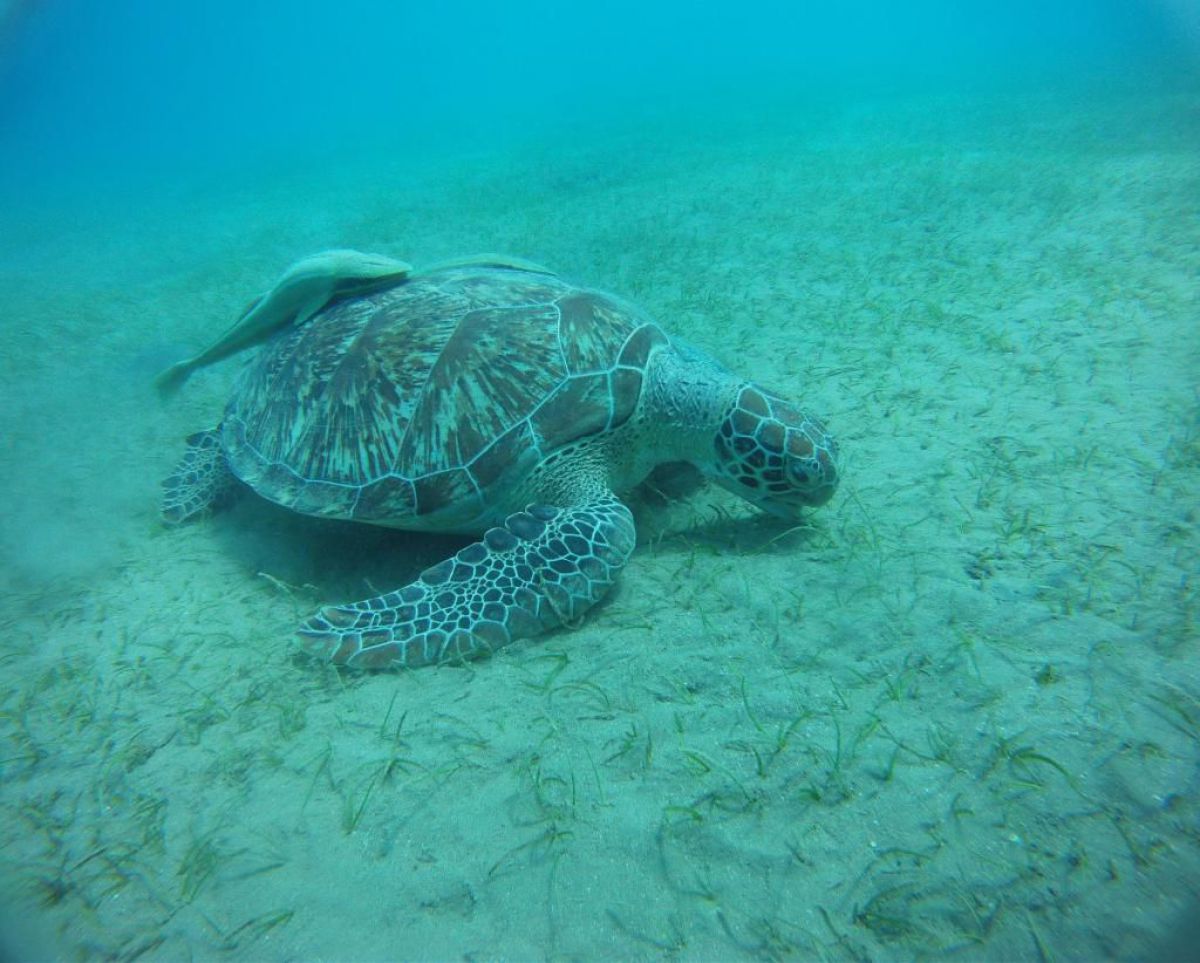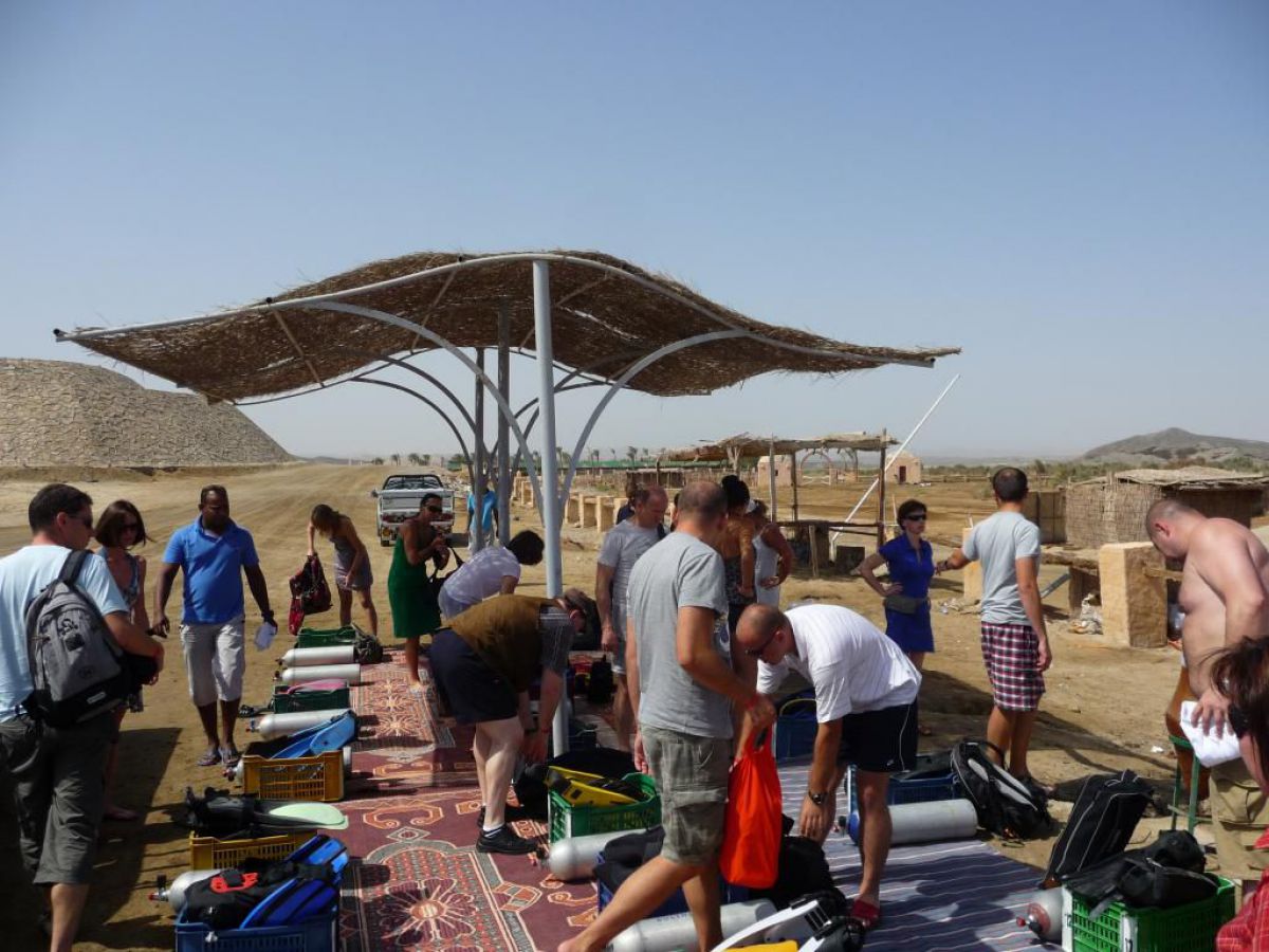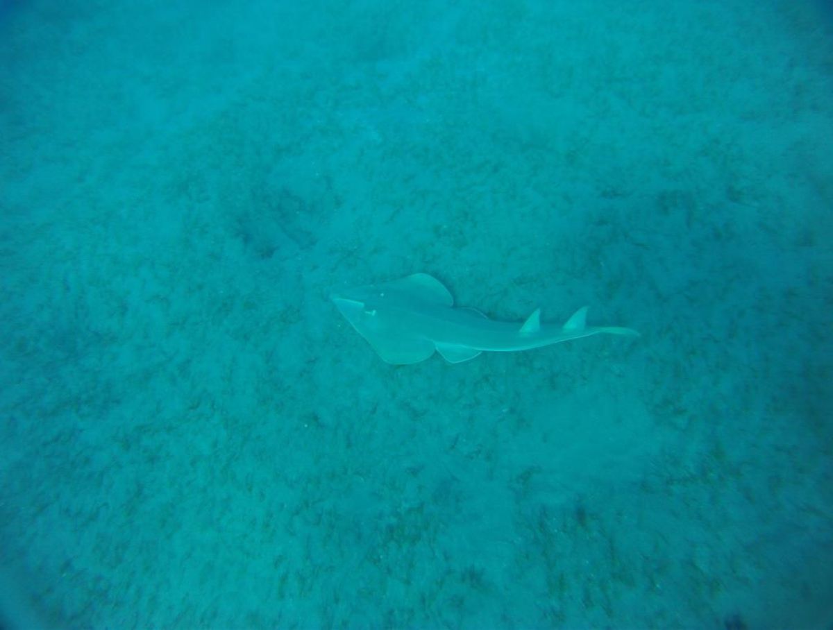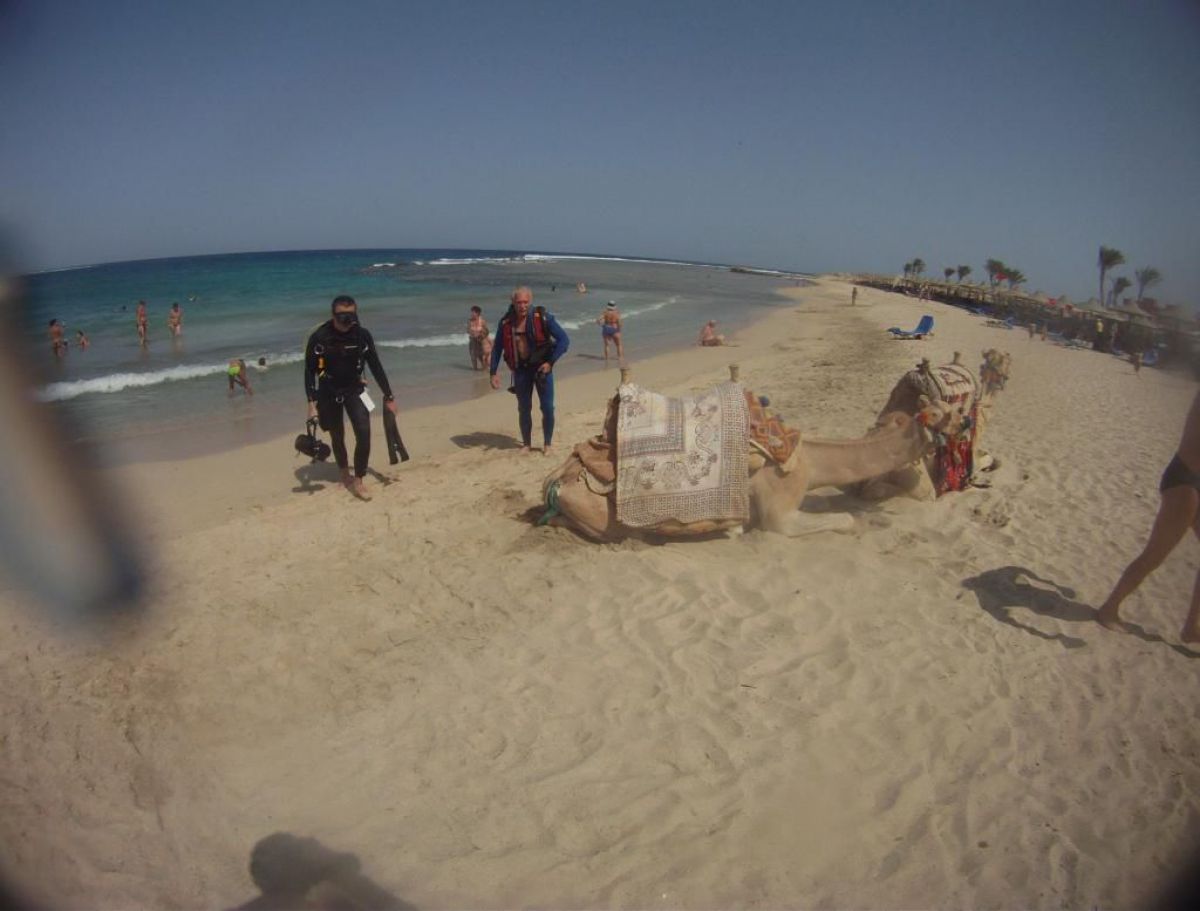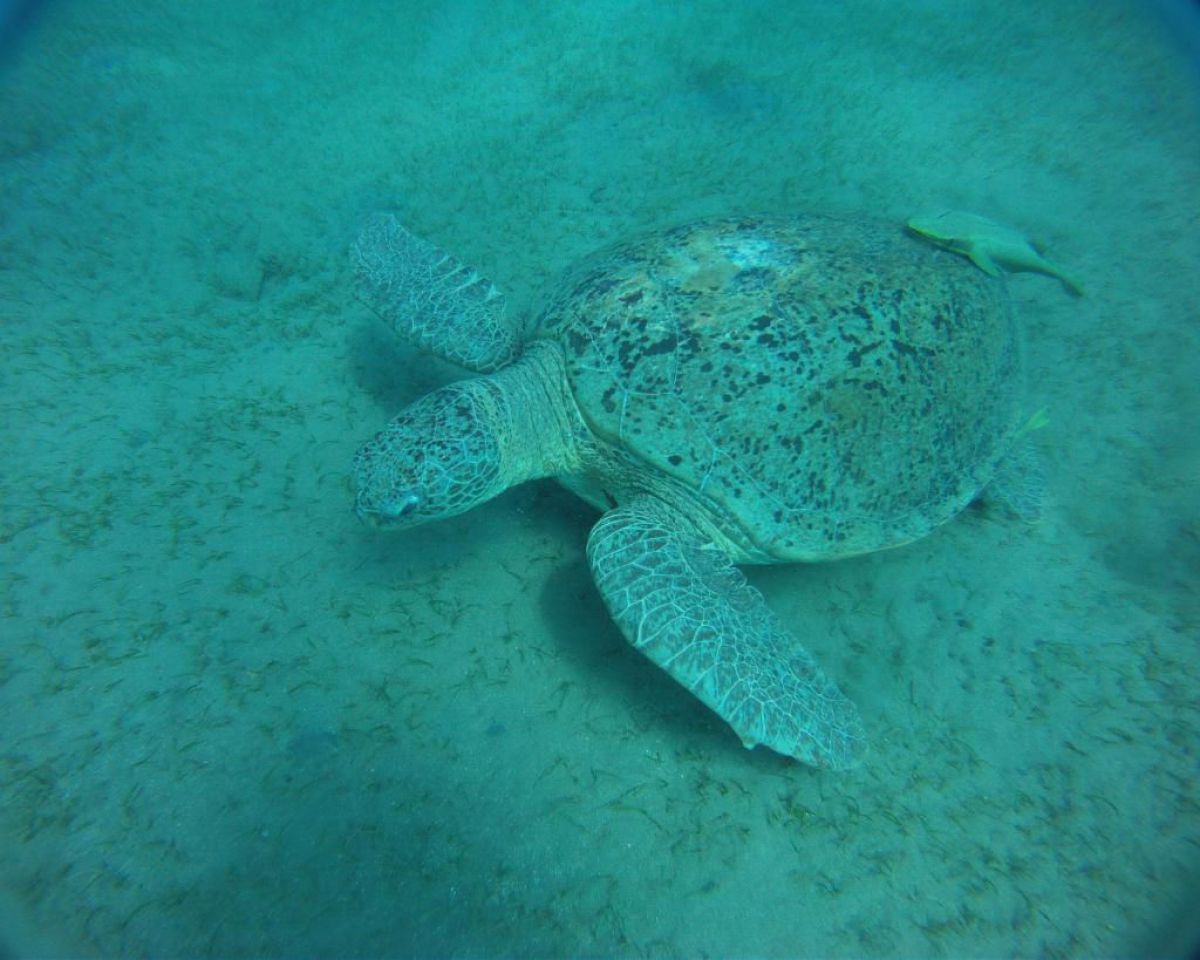 Ostatni dzień nurkowy jedziemy do Abu Dabbab, gdzie pod wodą rośnie trawa, pasą się krowy morskie i żółwie. Dwie godziny busikiem wzdłuż pustyni i jesteśmy nad zatoką Abu Dabbab hotel, plaża, palmy i palące słońce. Prowizoryczne zadaszenie i rozłożone na ziemi dywany, może latające? wolę nie sprawdzać, więc briefing butla na plecy i pod wodę. Jest spora fala więc pod wodą buja jak diabli ale co tam są żółwie i to duże jedzą trawę nie zwracając uwagi na nurków. Jest też rekin gitarowy, tak się nazywa i tak wygląda, duża płaszczka i takie różne kolorowe rybki.