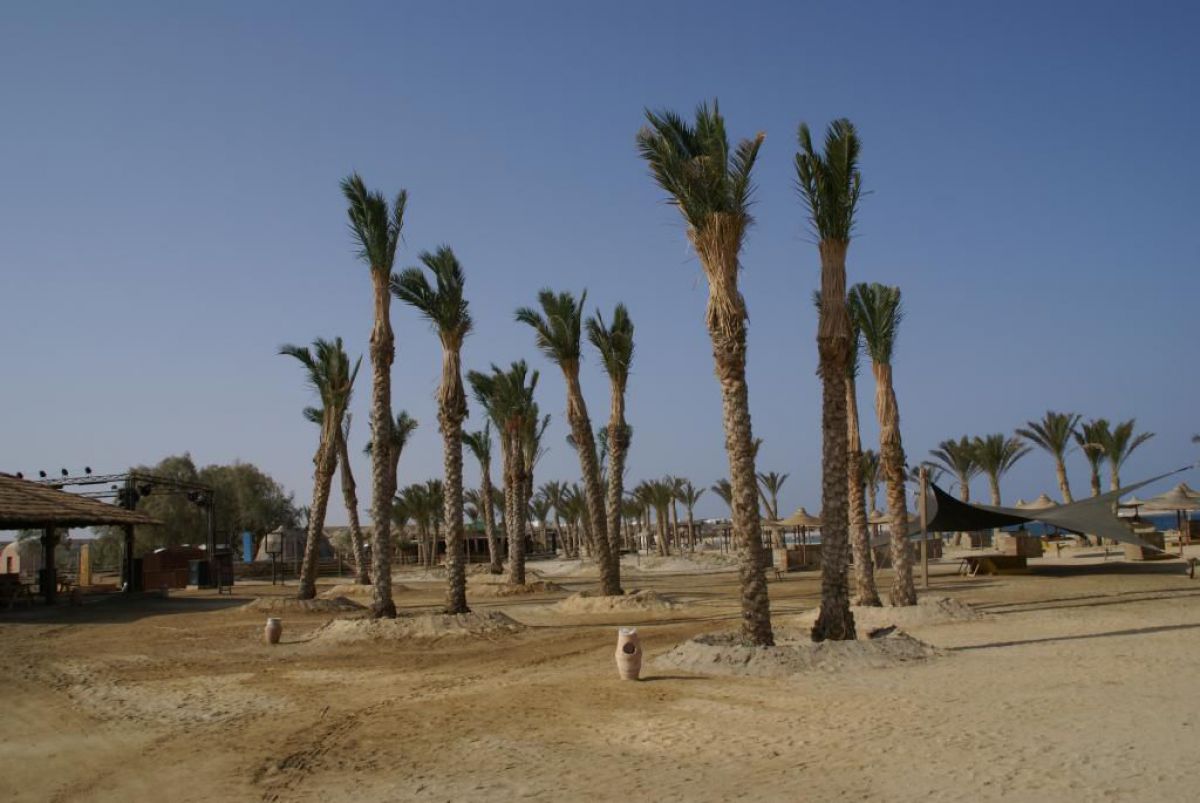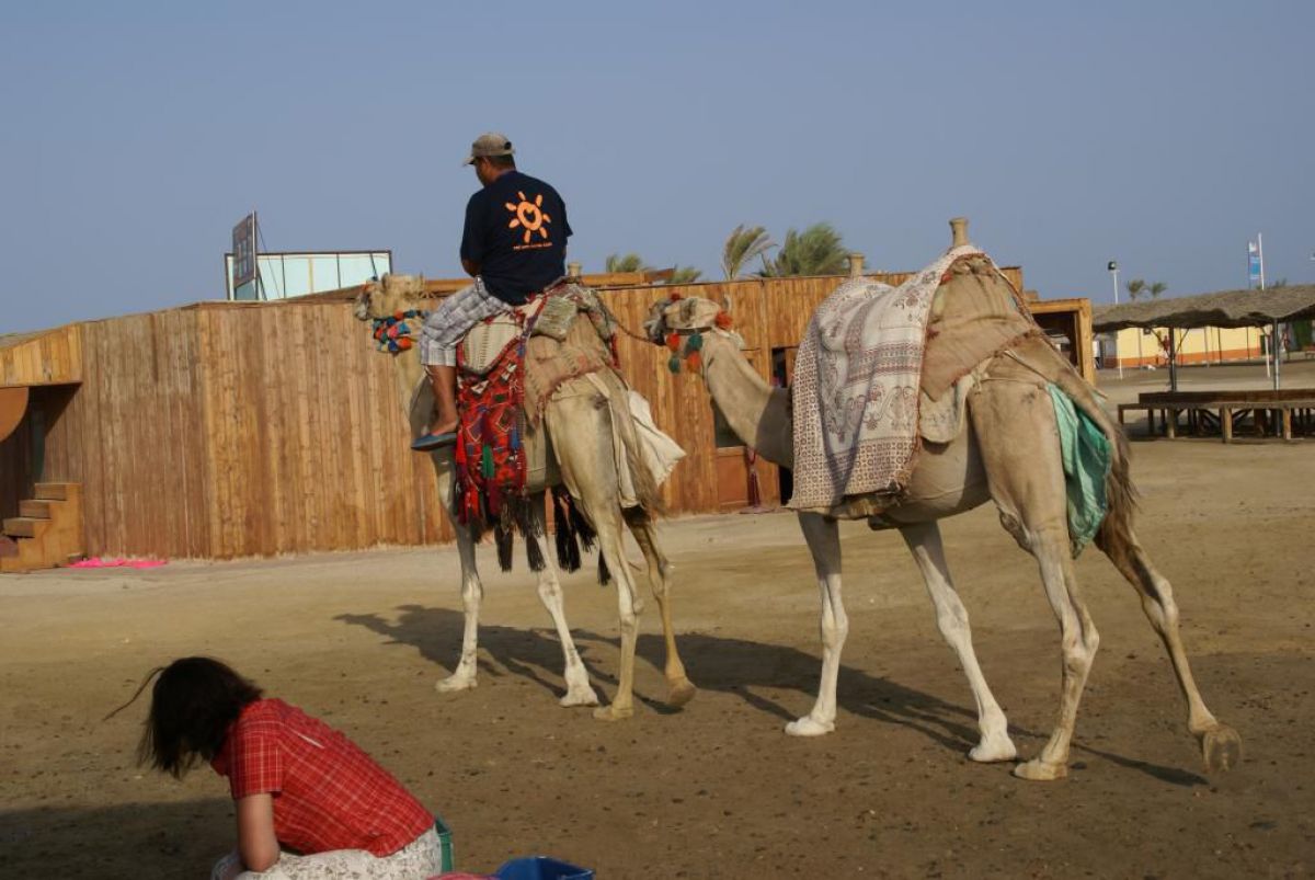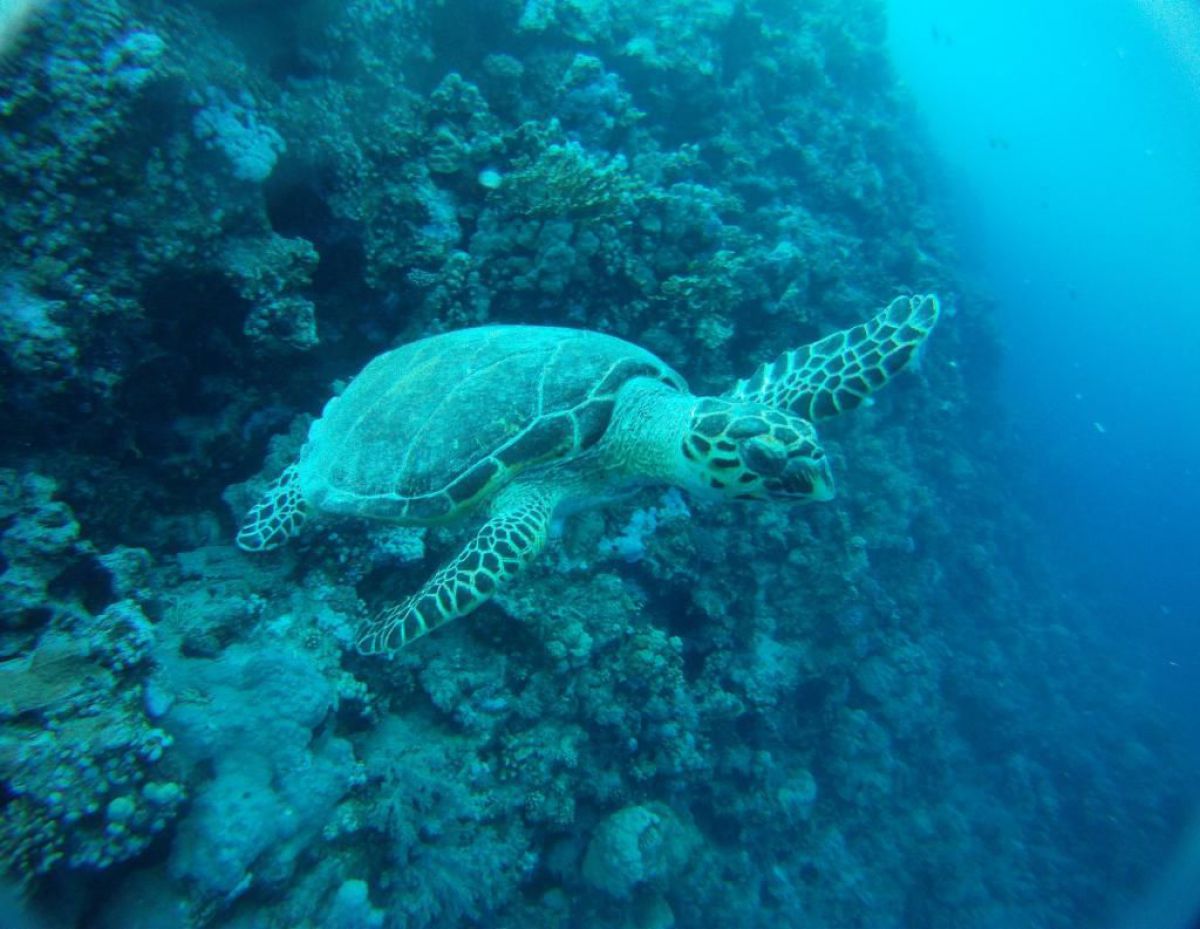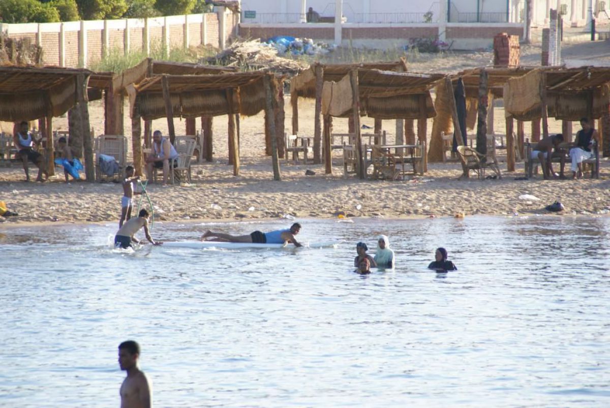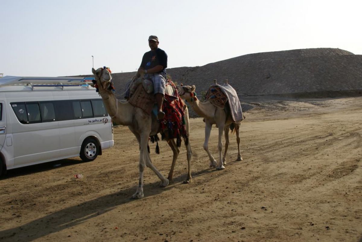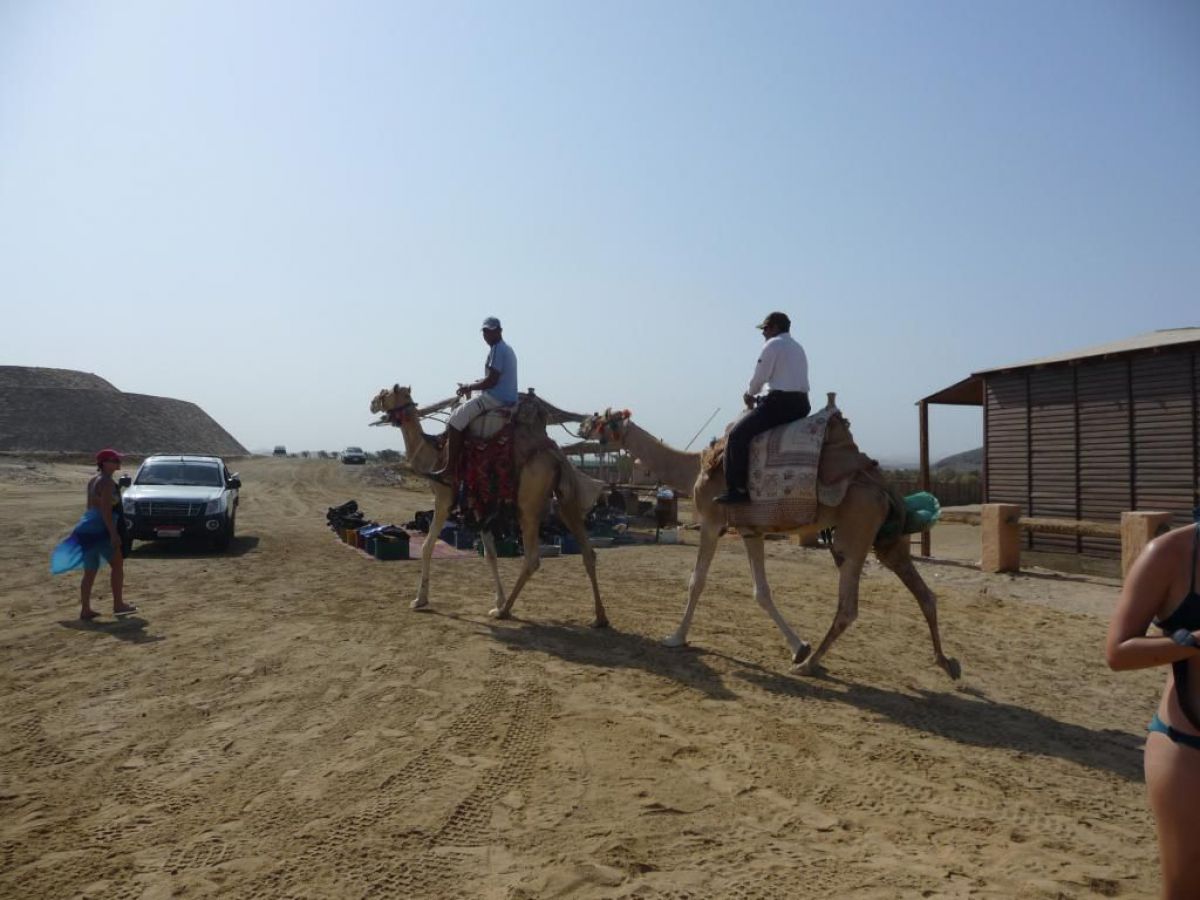 Ostatni dzień nurkowy jedziemy do Abu Dabbab, gdzie pod wodą rośnie trawa, pasą się krowy morskie i żółwie. Dwie godziny busikiem wzdłuż pustyni i jesteśmy nad zatoką Abu Dabbab hotel, plaża, palmy i palące słońce. Prowizoryczne zadaszenie i rozłożone na ziemi dywany, może latające? wolę nie sprawdzać, więc briefing butla na plecy i pod wodę. Jest spora fala więc pod wodą buja jak diabli ale co tam są żółwie i to duże jedzą trawę nie zwracając uwagi na nurków. Jest też rekin gitarowy, tak się nazywa i tak wygląda, duża płaszczka i takie różne kolorowe rybki.