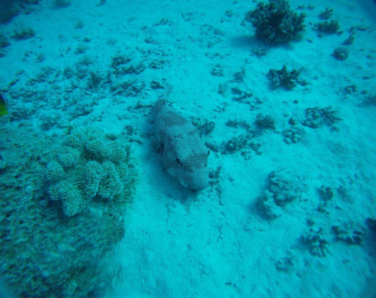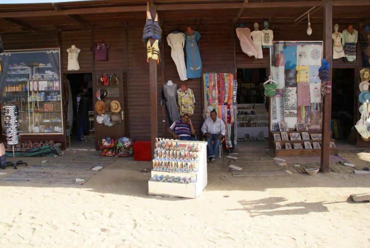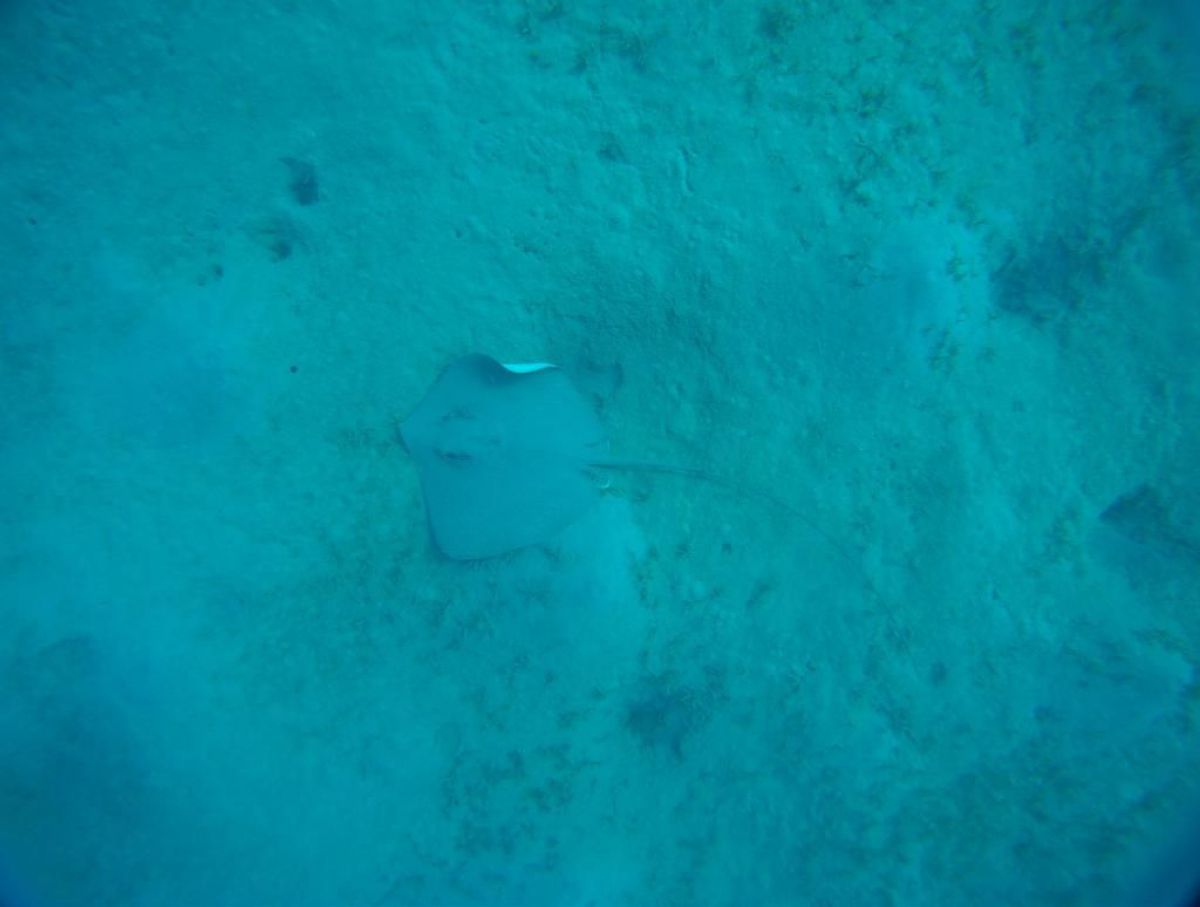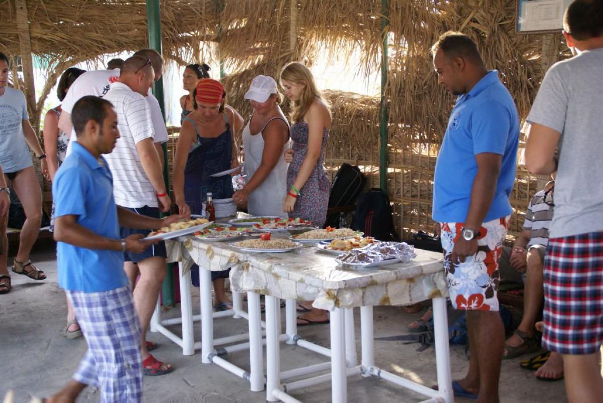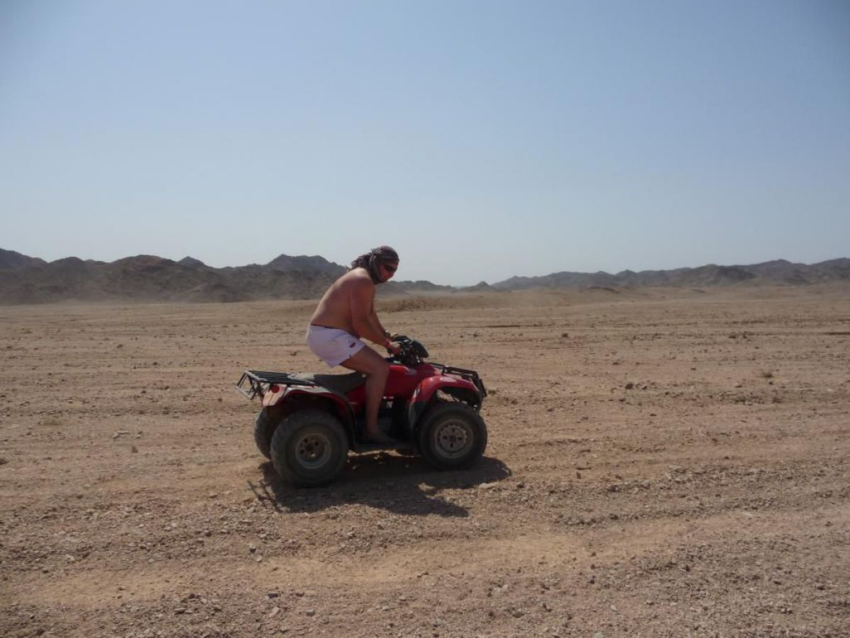 Ostatni dzień nurkowy jedziemy do Abu Dabbab, gdzie pod wodą rośnie trawa, pasą się krowy morskie i żółwie. Dwie godziny busikiem wzdłuż pustyni i jesteśmy nad zatoką Abu Dabbab hotel, plaża, palmy i palące słońce. Prowizoryczne zadaszenie i rozłożone na ziemi dywany, może latające? wolę nie sprawdzać, więc briefing butla na plecy i pod wodę. Jest spora fala więc pod wodą buja jak diabli ale co tam są żółwie i to duże jedzą trawę nie zwracając uwagi na nurków. Jest też rekin gitarowy, tak się nazywa i tak wygląda, duża płaszczka i takie różne kolorowe rybki.