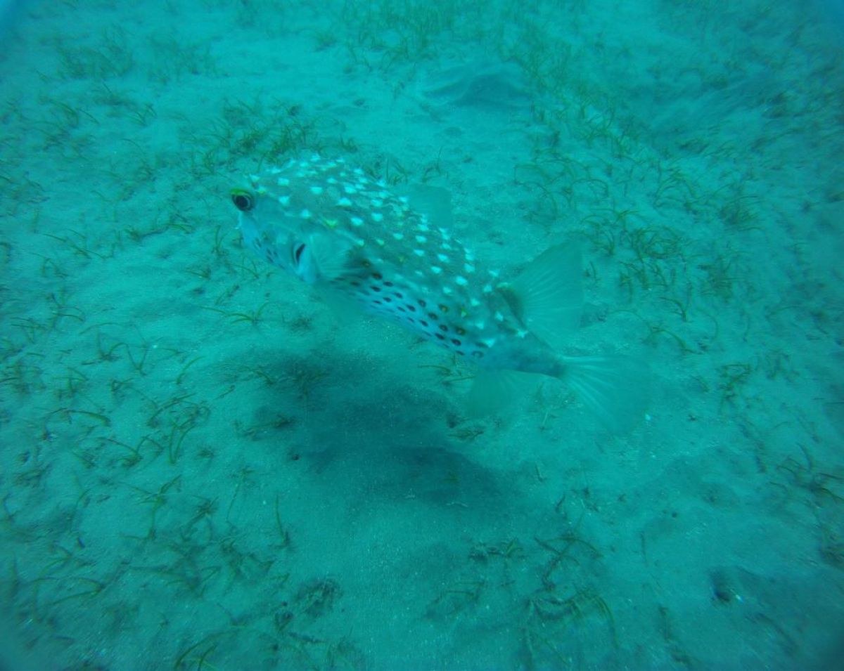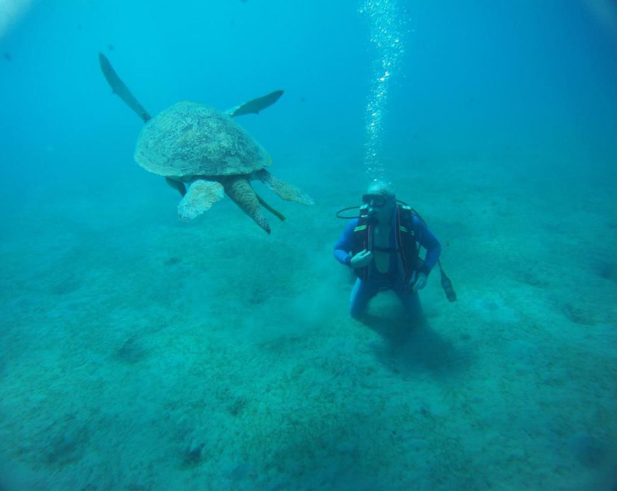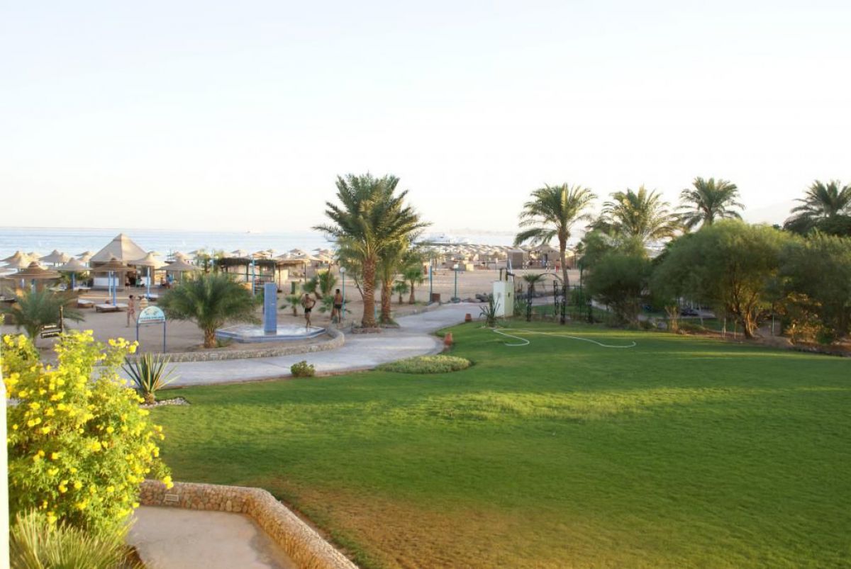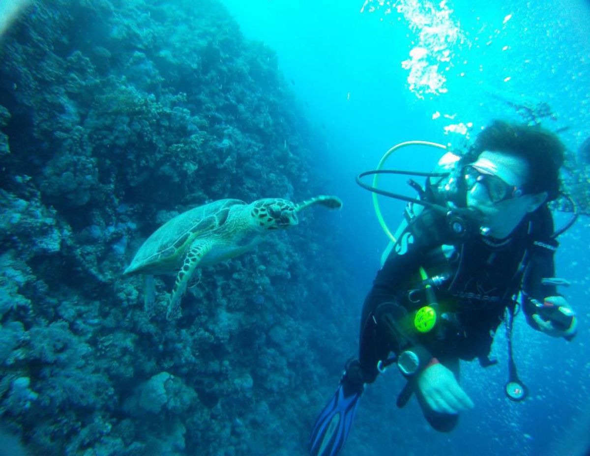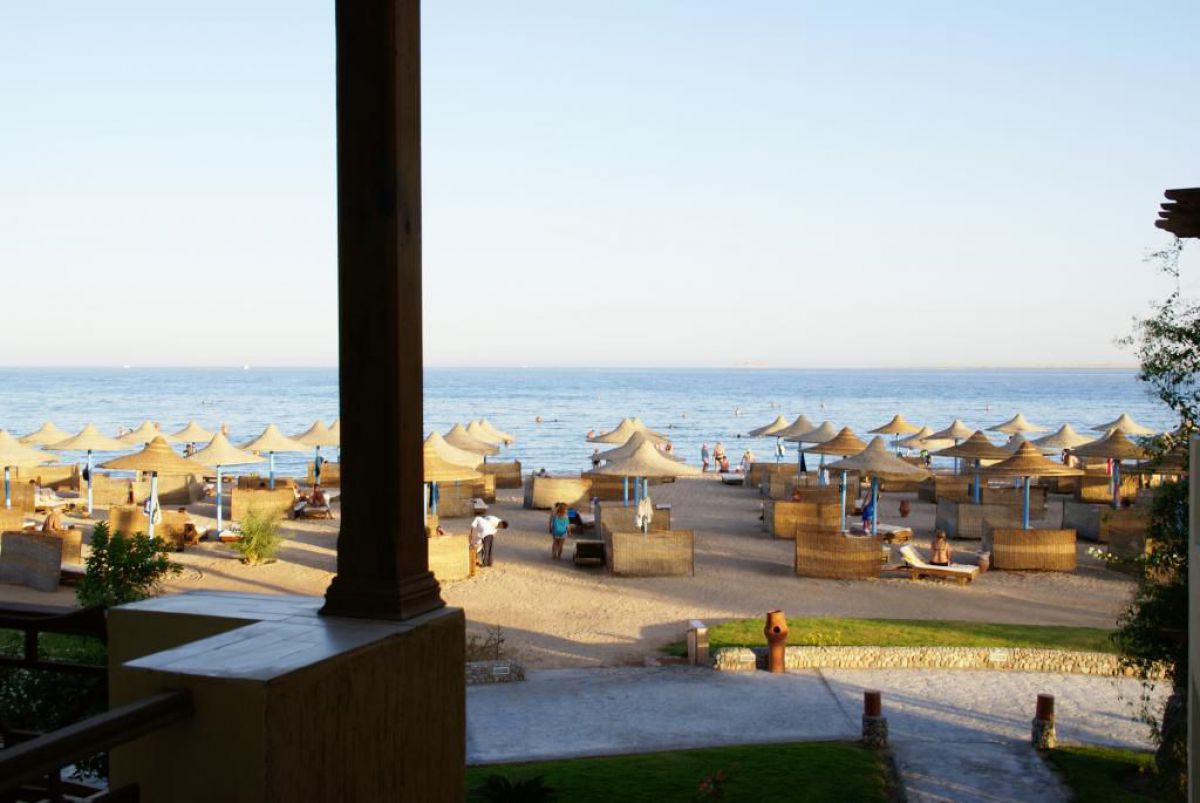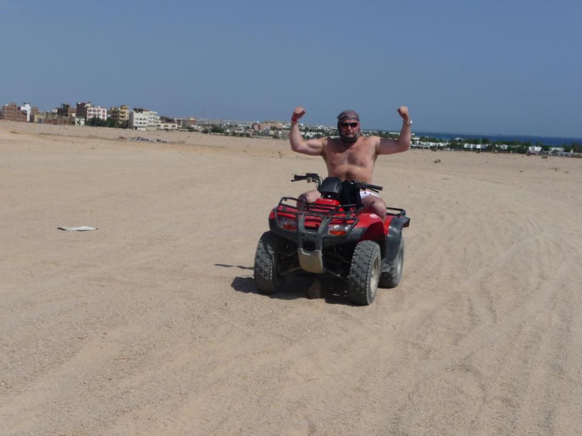 Ostatni dzień nurkowy jedziemy do Abu Dabbab, gdzie pod wodą rośnie trawa, pasą się krowy morskie i żółwie. Dwie godziny busikiem wzdłuż pustyni i jesteśmy nad zatoką Abu Dabbab hotel, plaża, palmy i palące słońce. Prowizoryczne zadaszenie i rozłożone na ziemi dywany, może latające? wolę nie sprawdzać, więc briefing butla na plecy i pod wodę. Jest spora fala więc pod wodą buja jak diabli ale co tam są żółwie i to duże jedzą trawę nie zwracając uwagi na nurków. Jest też rekin gitarowy, tak się nazywa i tak wygląda, duża płaszczka i takie różne kolorowe rybki.