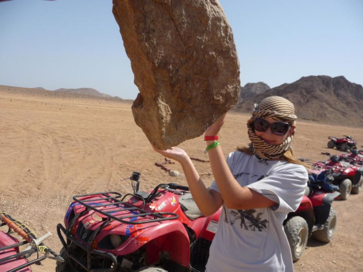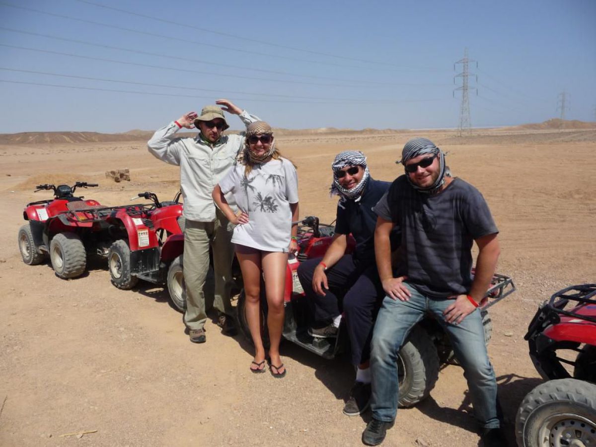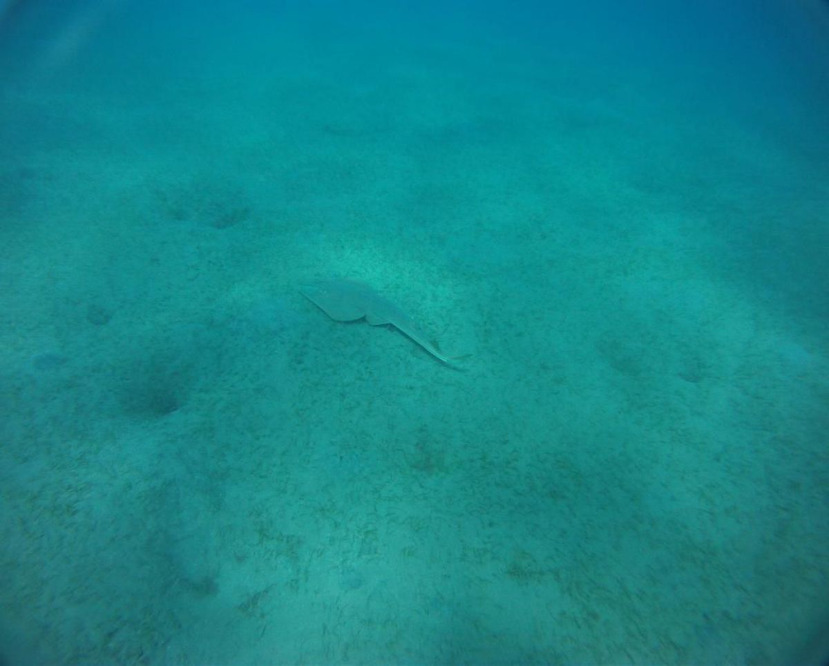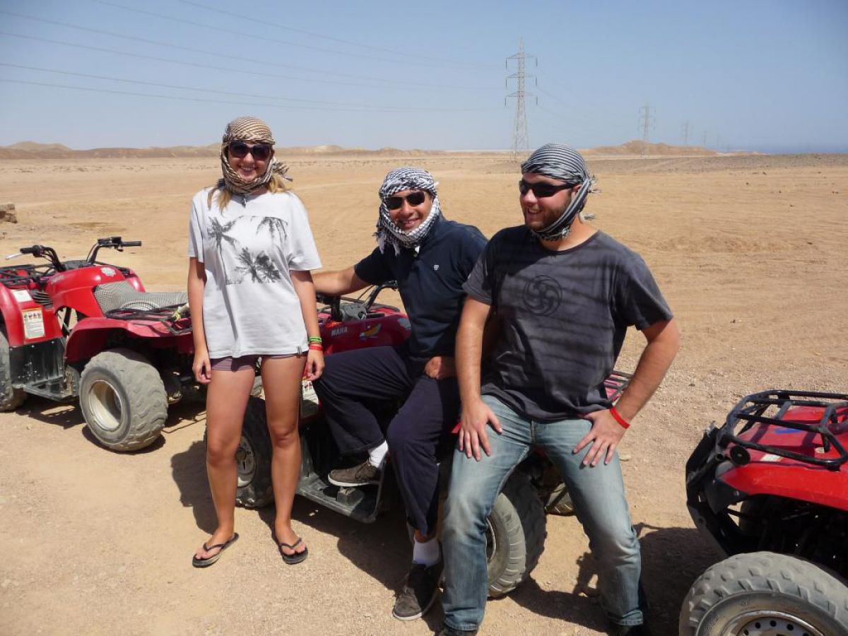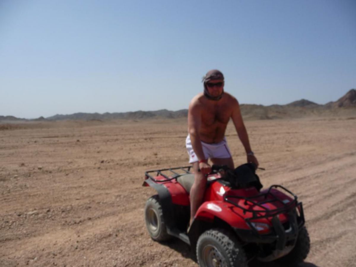 Ostatni dzień nurkowy jedziemy do Abu Dabbab, gdzie pod wodą rośnie trawa, pasą się krowy morskie i żółwie. Dwie godziny busikiem wzdłuż pustyni i jesteśmy nad zatoką Abu Dabbab hotel, plaża, palmy i palące słońce. Prowizoryczne zadaszenie i rozłożone na ziemi dywany, może latające? wolę nie sprawdzać, więc briefing butla na plecy i pod wodę. Jest spora fala więc pod wodą buja jak diabli ale co tam są żółwie i to duże jedzą trawę nie zwracając uwagi na nurków. Jest też rekin gitarowy, tak się nazywa i tak wygląda, duża płaszczka i takie różne kolorowe rybki.