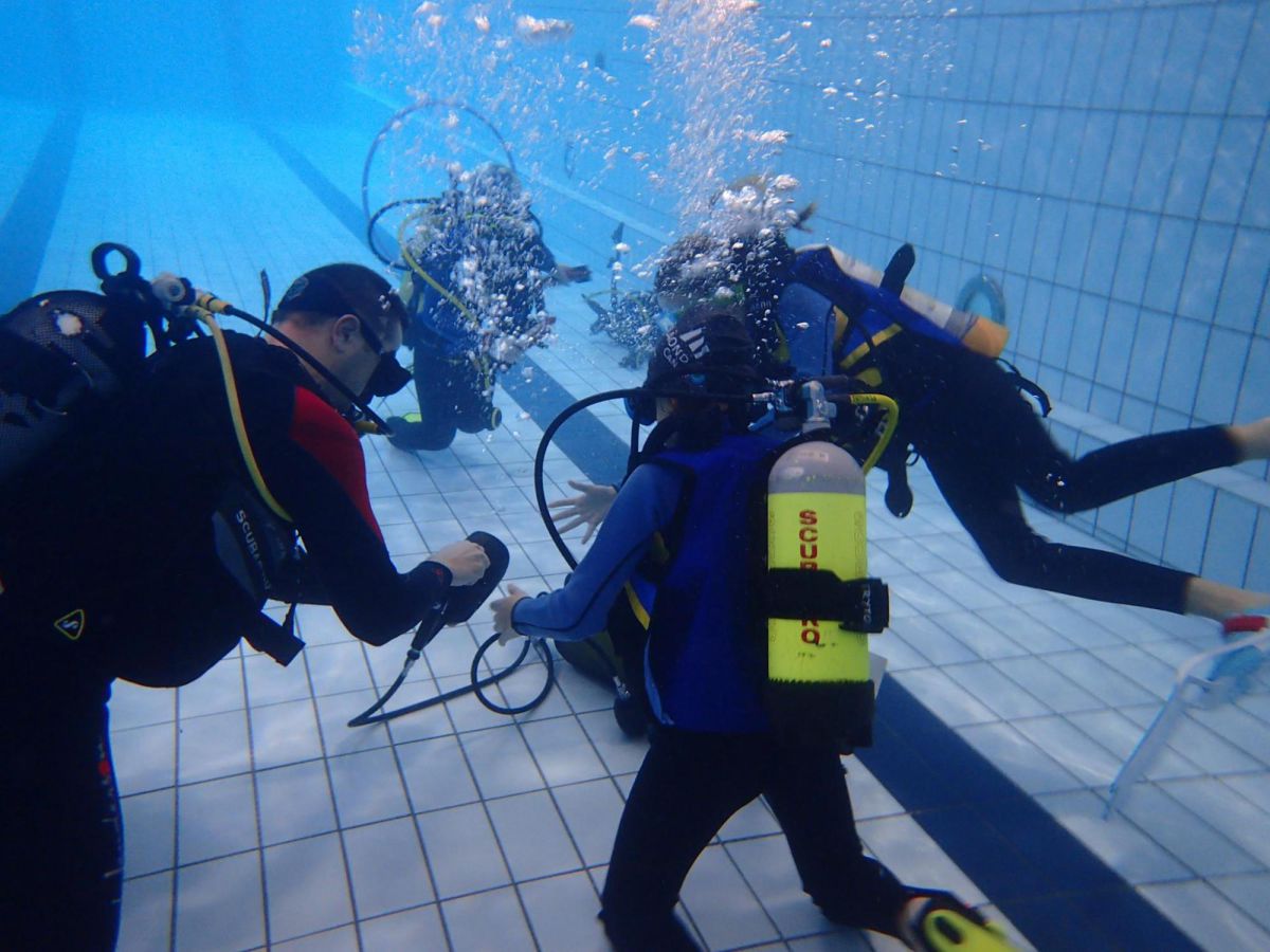 Kolejne dwa dni zaczynamy od zajęć w sali wykładowej na terenie basenu. Omawiamy sprzęt nurkowy oraz zajęcia. Krótko po zabawie w sali wykładowej przechodzimy do basenu aby w pełnym aqualungu przećwiczyć podstawowe zasady nurkowania.