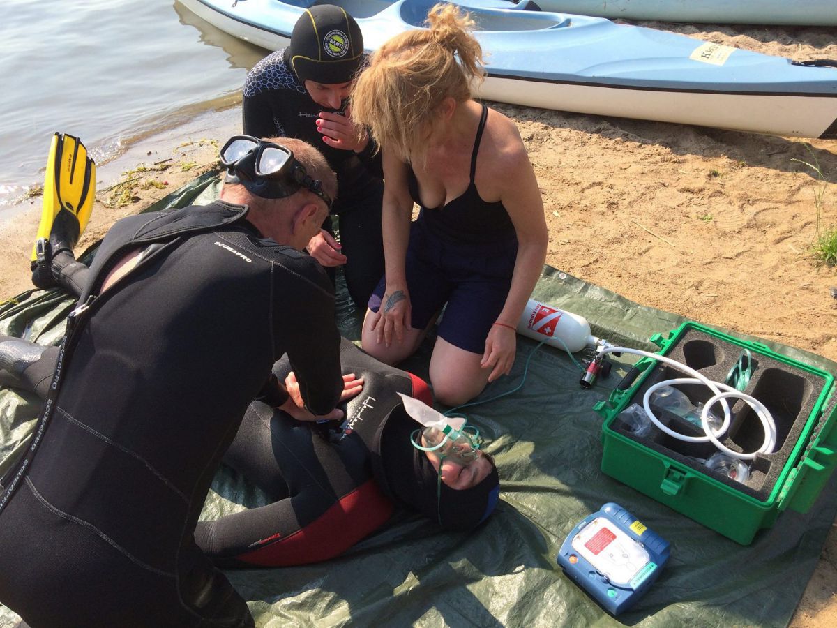 Elementem dodatkowym szkolenia będzie kurs podania tlenu Oxygen Provider. Na szkoleniu Stress&Rescue będziesz uczył się jak radzić sobie ze spanikowaną osobą na lustrze wody, techniki wyjścia z poszkodowanym z wody (na łódź, pomost, brzeg, trap, drabinę), wydobywać poszkodowanego z pod wody i inne.