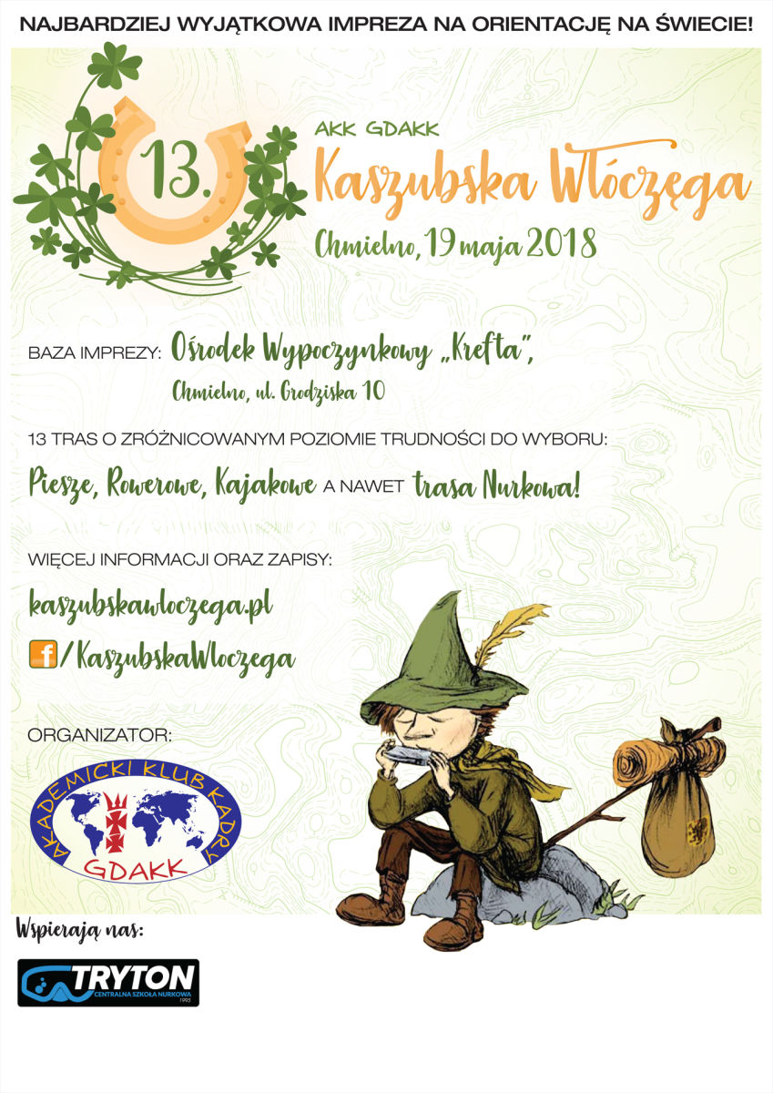 " Kaszubska Włóczęga to impreza na orientację, gdzie uczestnicy, podczas wędrówki z mapą, mają za zadanie potwierdzić w określonym limicie czasu swoją obecność przy ustawionych w terenie punktach kontrolnych. W terenie czeka na zawodników wiele niespodzianek: od dodatkowych zadań i mylnych tropów, poprzez przeprawy przez nieraz bardzo trudne tereny jak rzeki czy mokradła, po urzekające krajobrazy. W tym roku będziemy rywalizować w okolicach Chmielna na Kaszubach i już teraz zapowiada się świetna zabawa w doborowym towarzystwie!