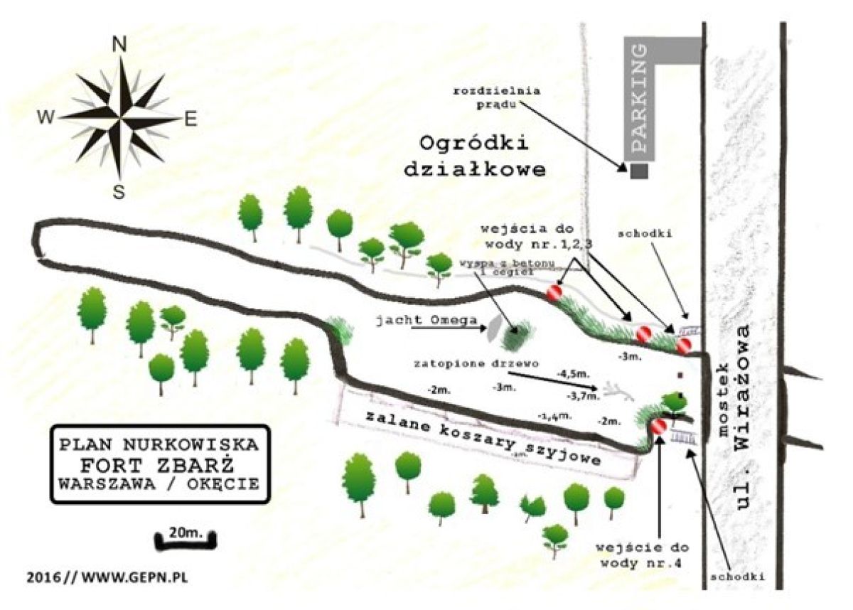 W wodzie liczne ślady bytności wojsk zarówno jeszcze carskich jak i z lat 60-tych i 70-tych ludowego wojska polskiego. Można wpływać do „wnętrza" jednakże dobrze jest mieć kask jako ochronę przed spadającymi luźnymi fragmentami cegieł. Wewnątrz Fortu głębokość nie przekracza 3 metrów. Należy mieć narzędzia tnące przy brzegu jest wiele pozostawionych żyłek w haczykami. Zbiornik płytki ale nie należy do najłatwiejszych. To swego rodzaju skansen. Zachowany fragment historii do zwiedzenia tylko dla nurka.