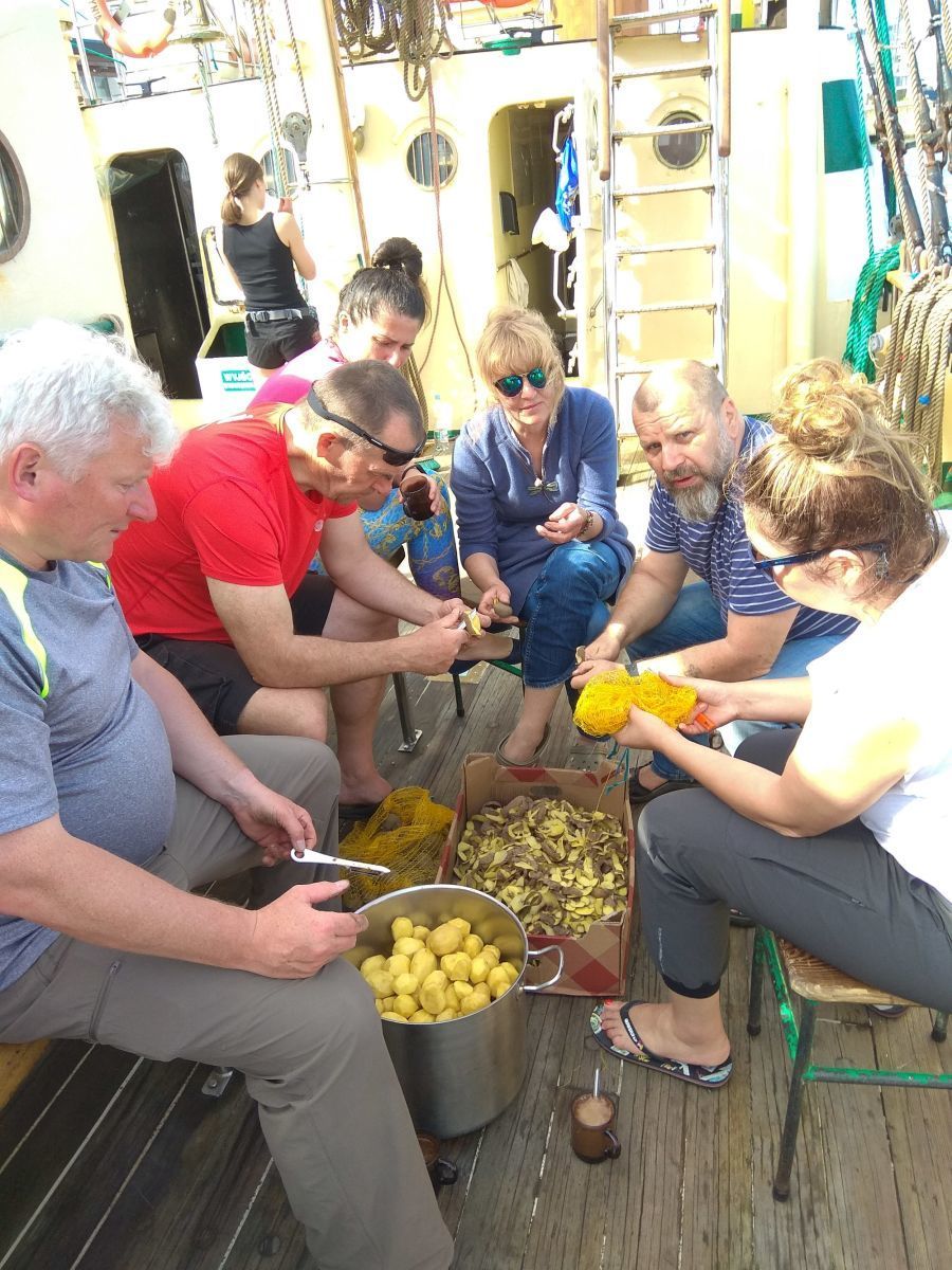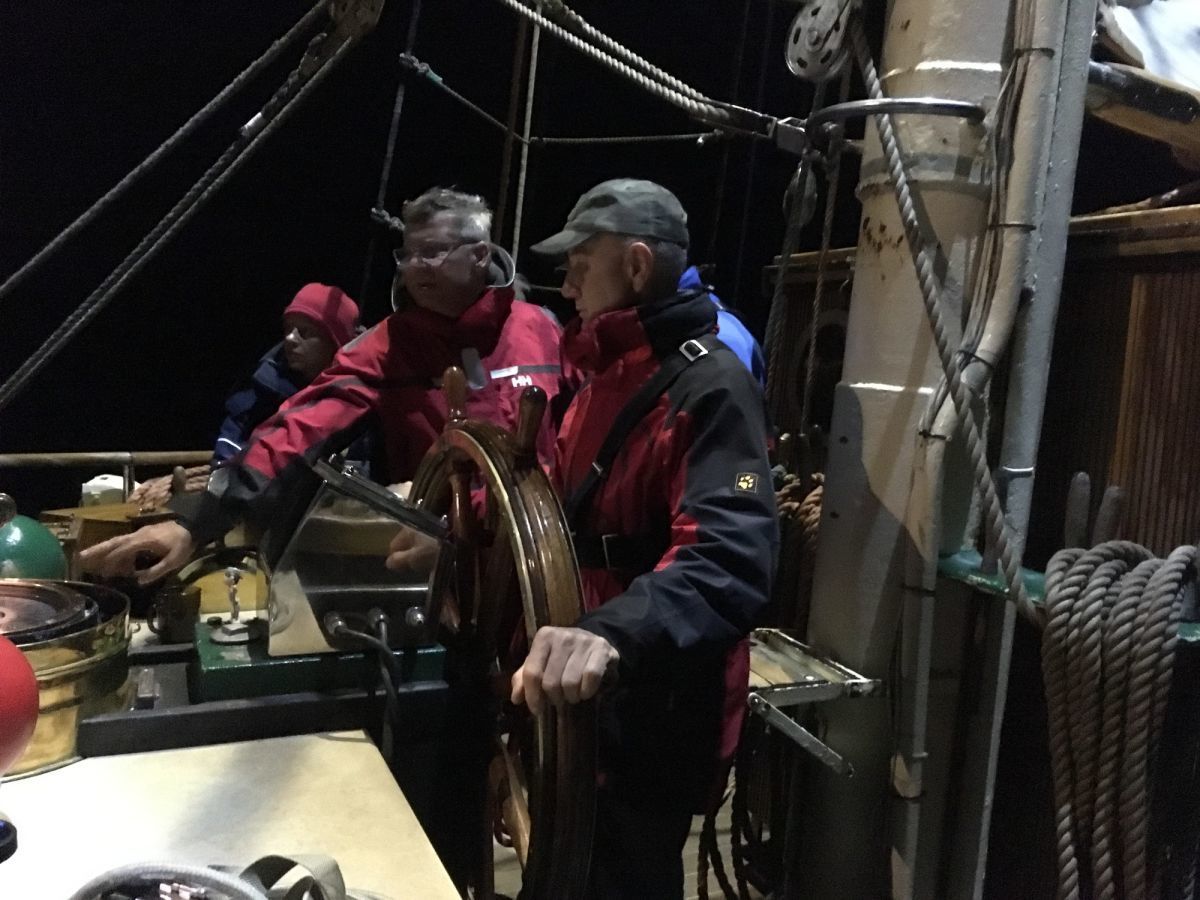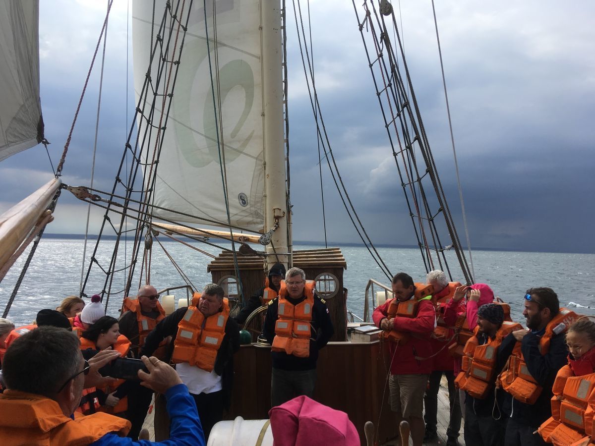 Do obsługi mamy 10 żagli : bomkliwer, kliwer, latacz, sztafok, fok, grotsztaksel, grot, bezansztaksel, bezan i wielki bryfok, który wisi na rei. Będziemy bowiem podzieleni na 4 sześcioosobowe wachty + starszy wachty + oficer wachtowy. Te zespoły co 4 godziny obejmują wachtę na decku i pracują w czasie kiedy inni balują lub śpią.