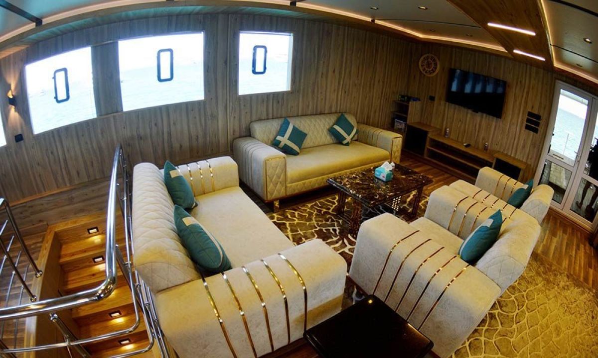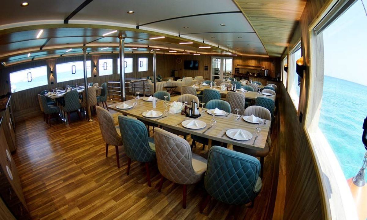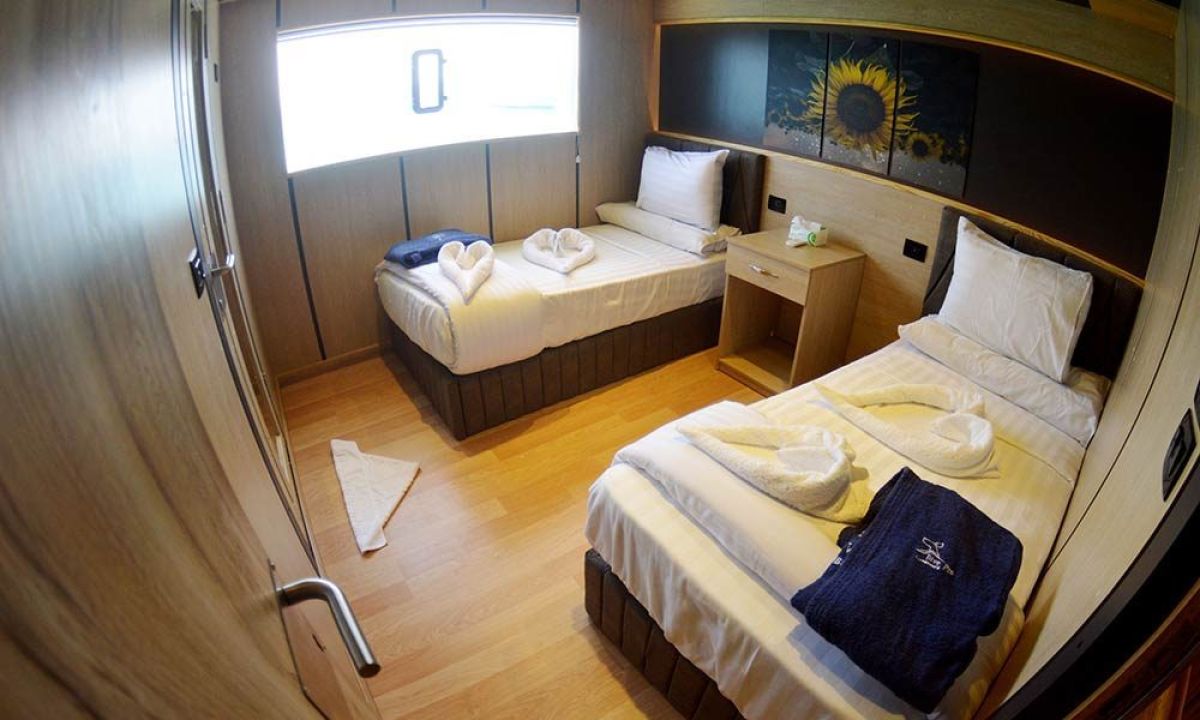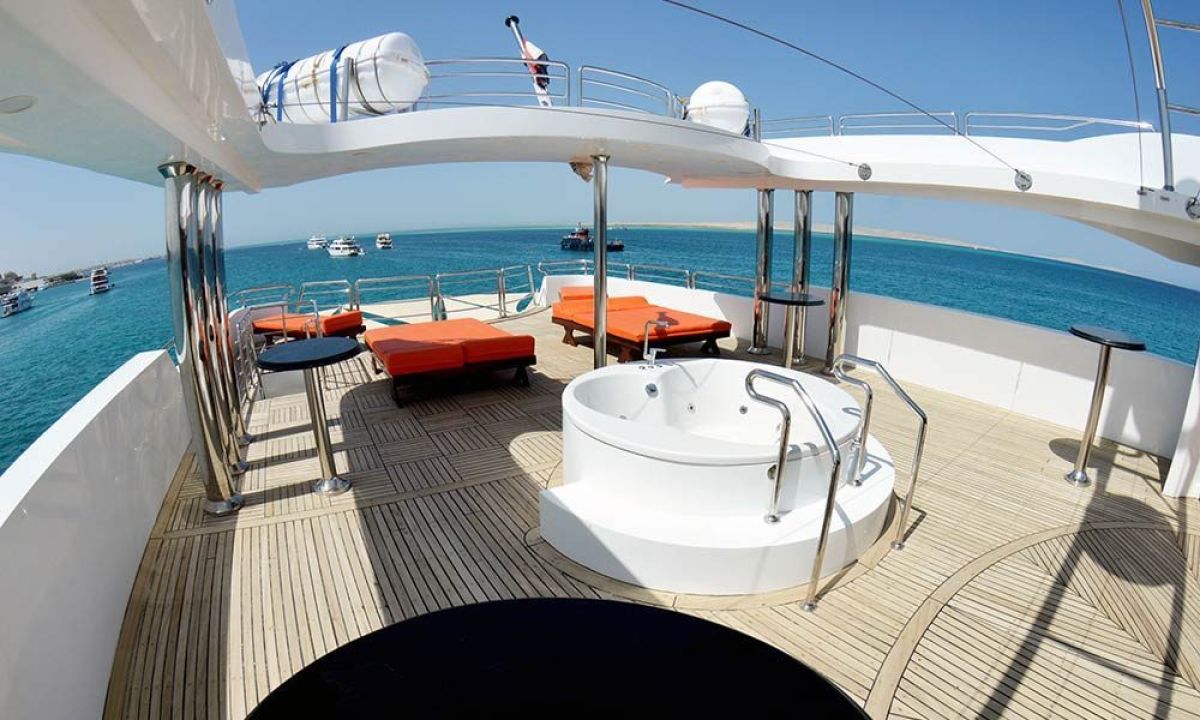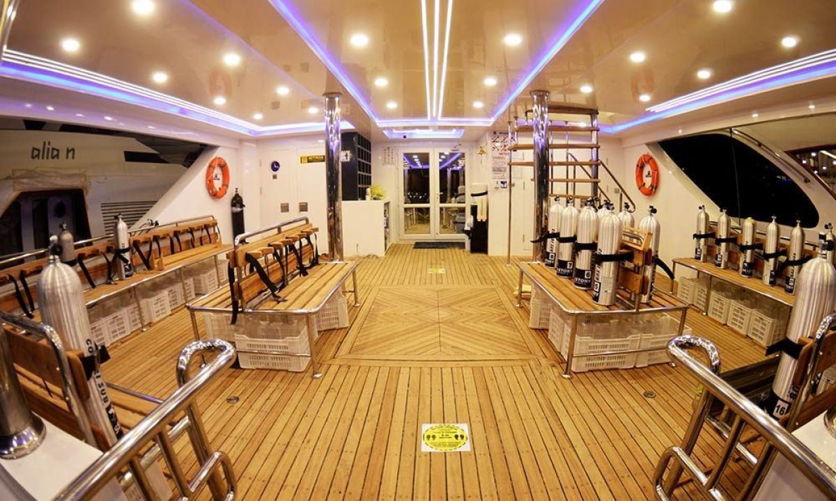 8 kabin na pokładzie sypialnym, 4 kabiny na pokładzie środkowym i 6 na pokładzie górnym. Każda kabina wyposażona jest w klimatyzację oraz prywatną toaletę. Pokład nurkowy jest bardzo przestronny a pokład rufowy z którego będziemy rozpoczynać nurkowania bardzo szeroki. Łódź posiada kilka pokładów słonecznych na najwyższym znajduje się Jacuzzi. Łódź robi wrażenie !!