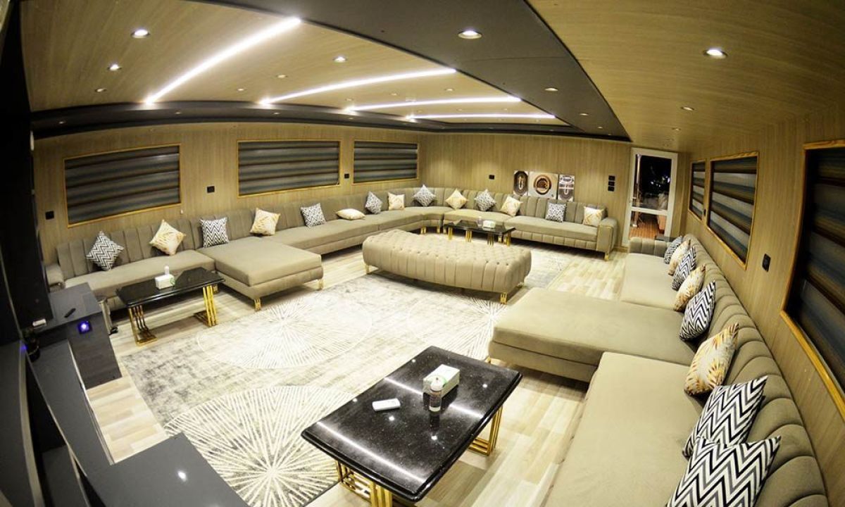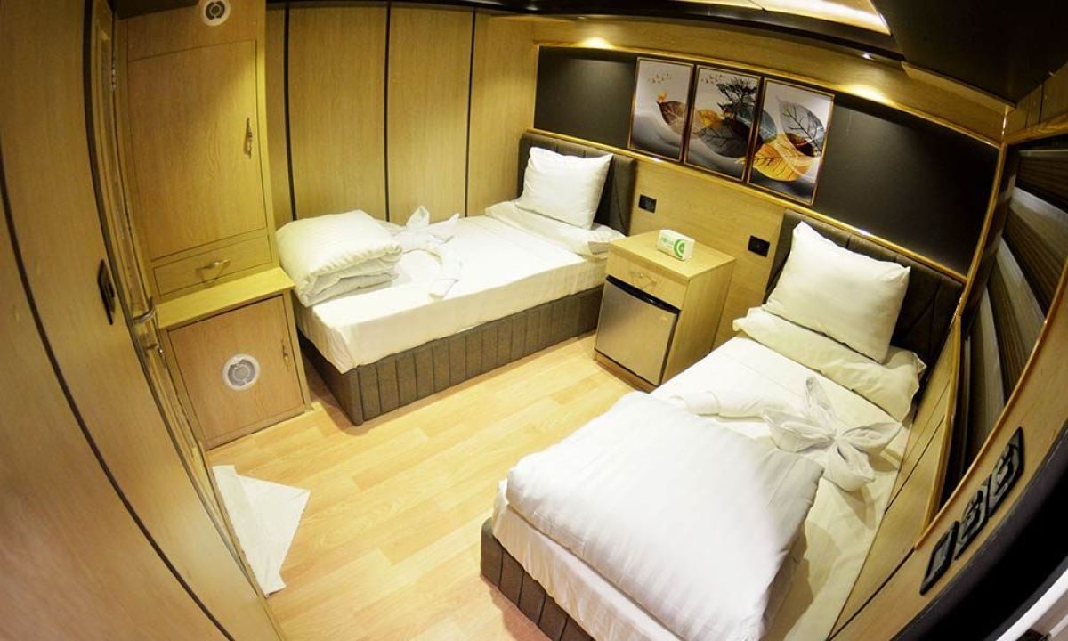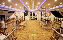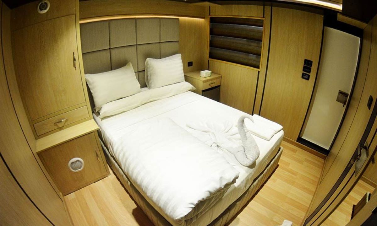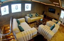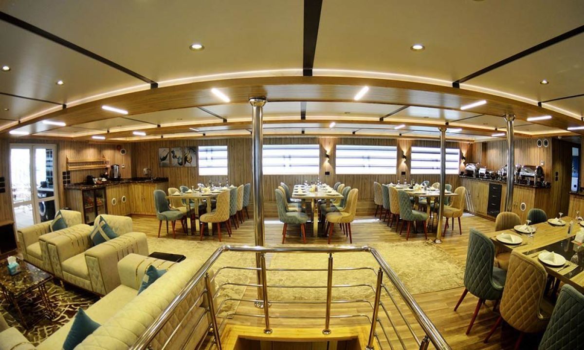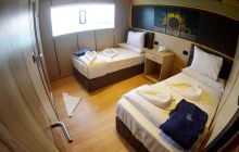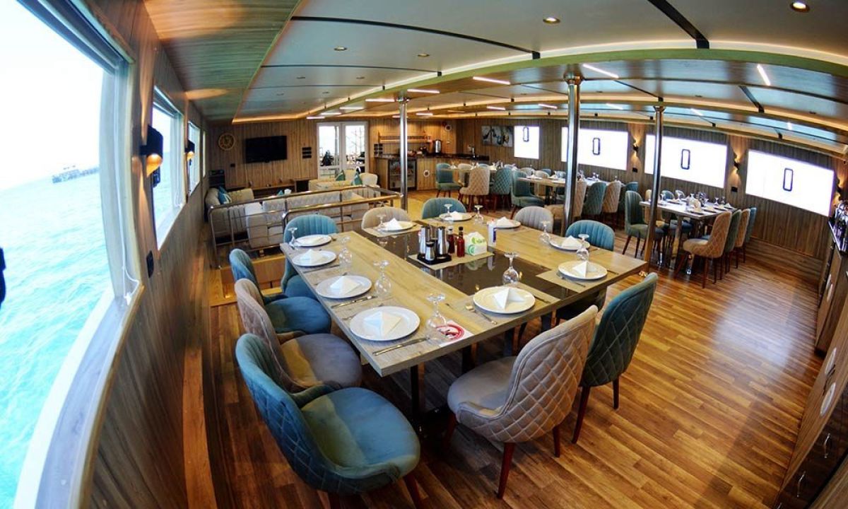 8 kabin na pokładzie sypialnym, 4 kabiny na pokładzie środkowym i 6 na pokładzie górnym. Każda kabina wyposażona jest w klimatyzację oraz prywatną toaletę. Pokład nurkowy jest bardzo przestronny a pokład rufowy z którego będziemy rozpoczynać nurkowania bardzo szeroki. Łódź posiada kilka pokładów słonecznych na najwyższym znajduje się Jacuzzi. Łódź robi wrażenie !!