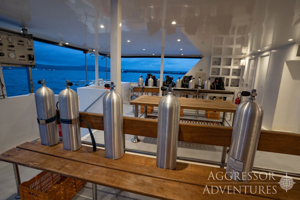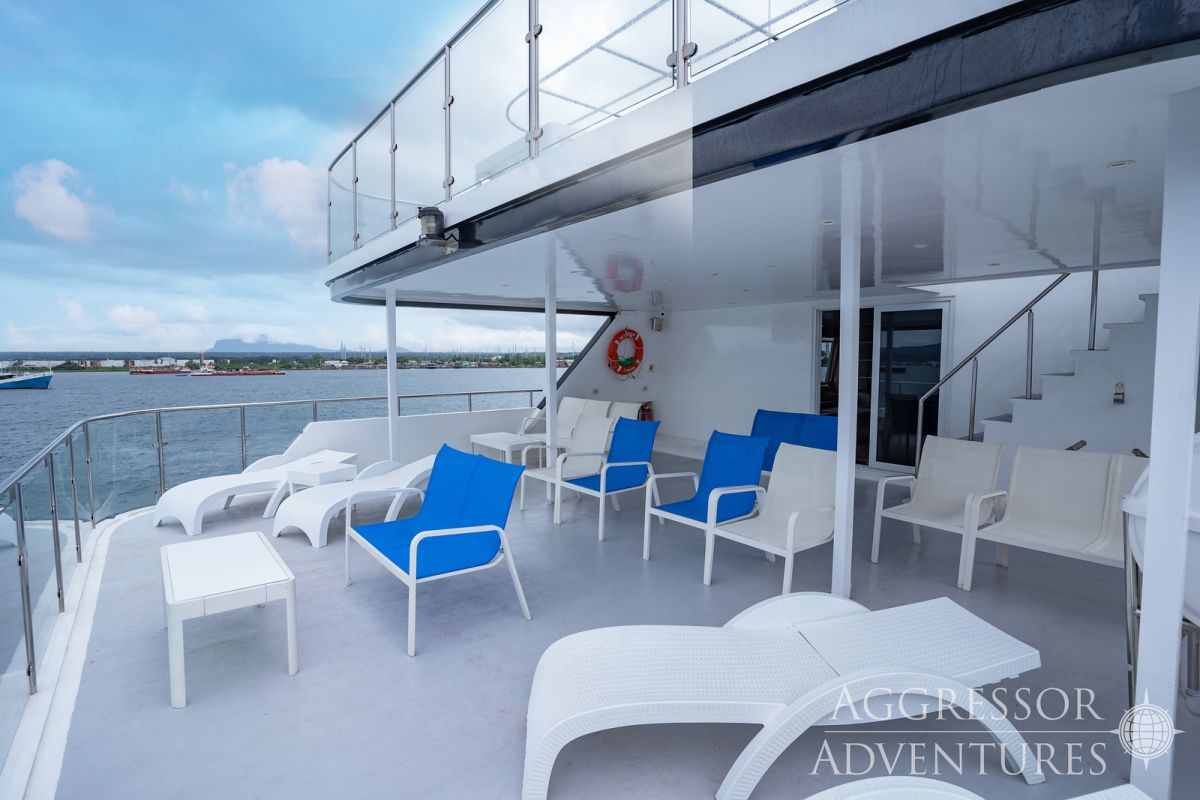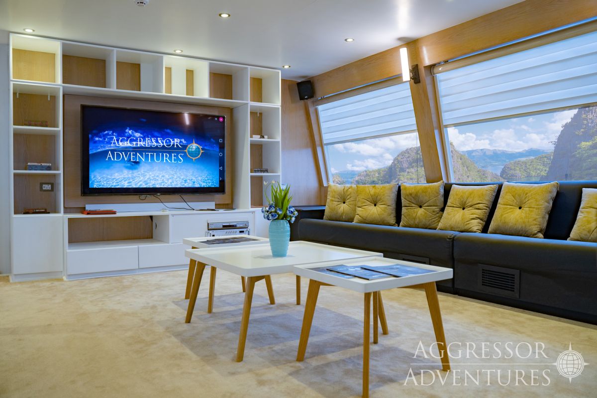 Salon wypoczynkowy znajduje się na pokładzie górnym a restauracja na pokładzie dolnym. Jednostka ma dość przestronny dek nurkowy przygotowany do obsługi 24 gości.