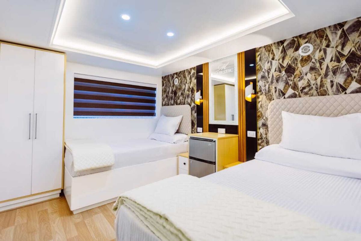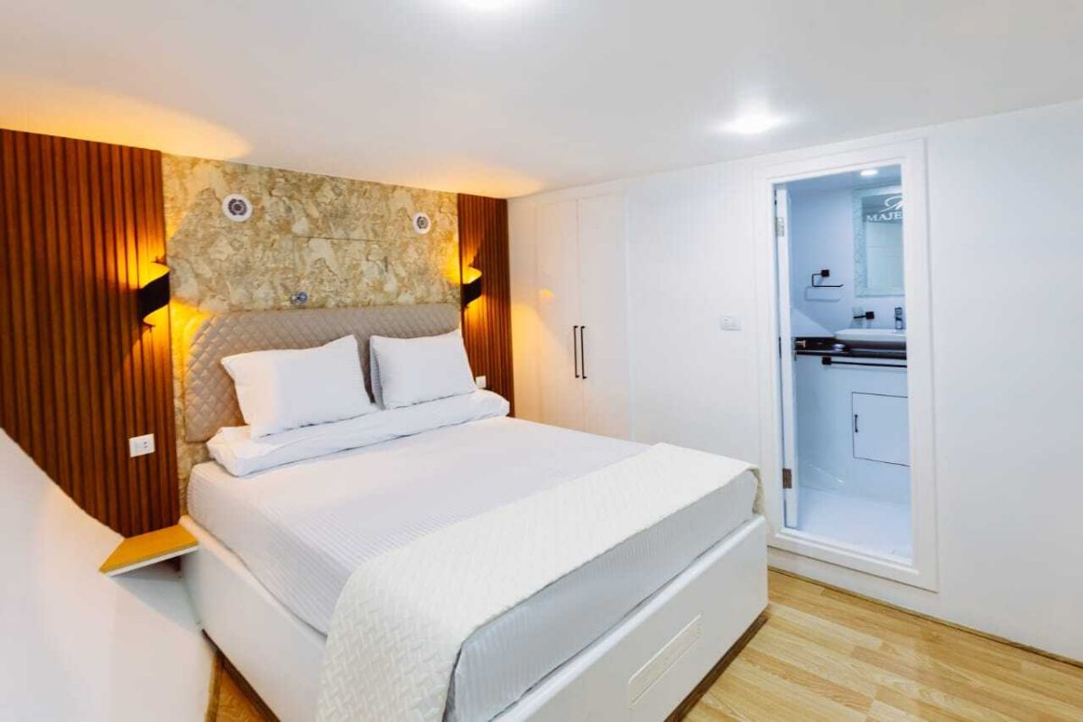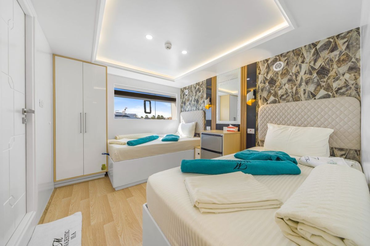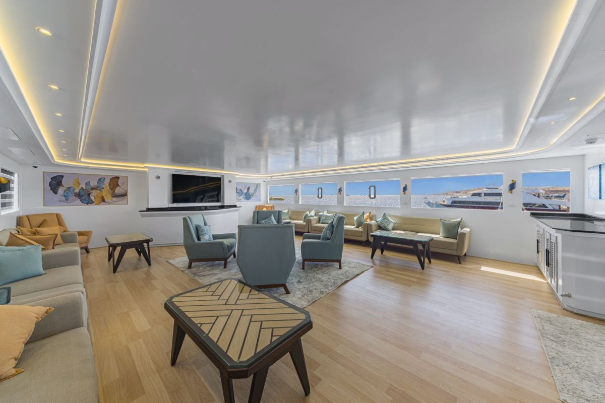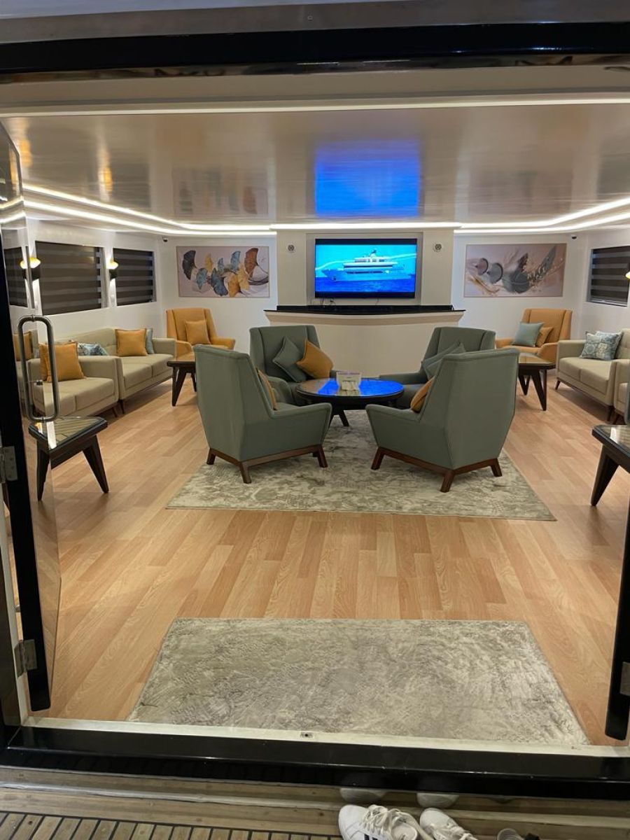 3 kabiny na pokładzie dolnym. 8 kabin na pokładzie sypialnym, 4 kabiny na pokładzie środkowym i 2 na pokładzie górnym. Każda kabina wyposażona jest w klimatyzację oraz prywatną toaletę. Pokład nurkowy jest bardzo przestronny a pokład rufowy, z którego będziemy rozpoczynać nurkowania bardzo szeroki. Łódź posiada kilka pokładów słonecznych na najwyższym znajduje się Jacuzzi. Łódź robi wrażenie!!