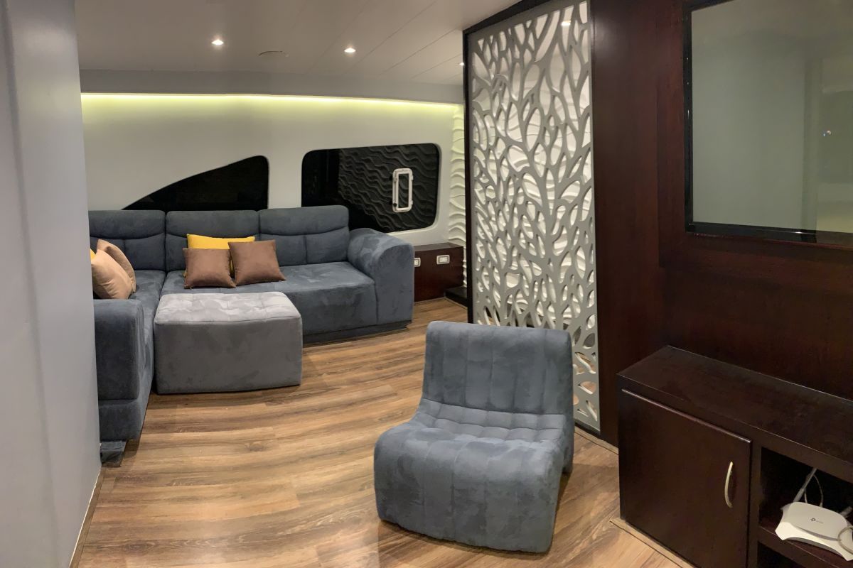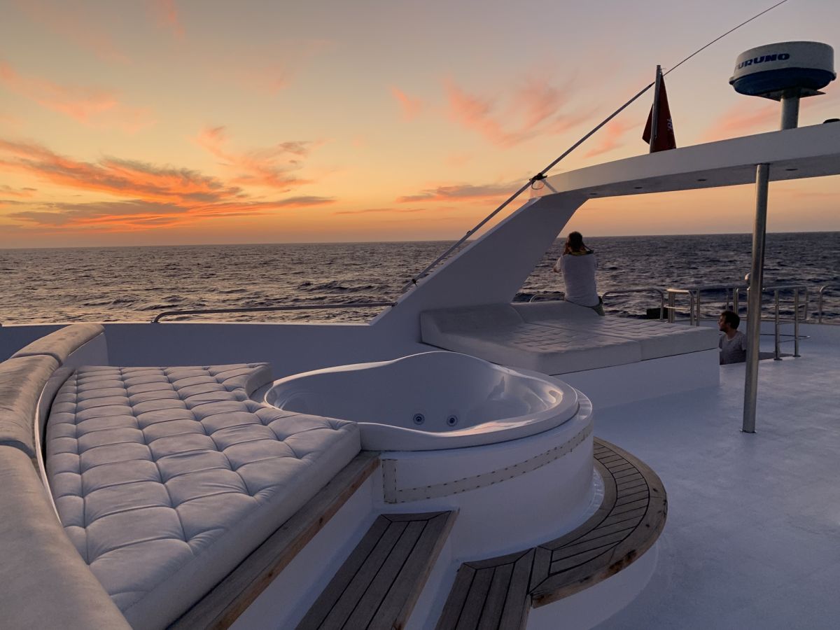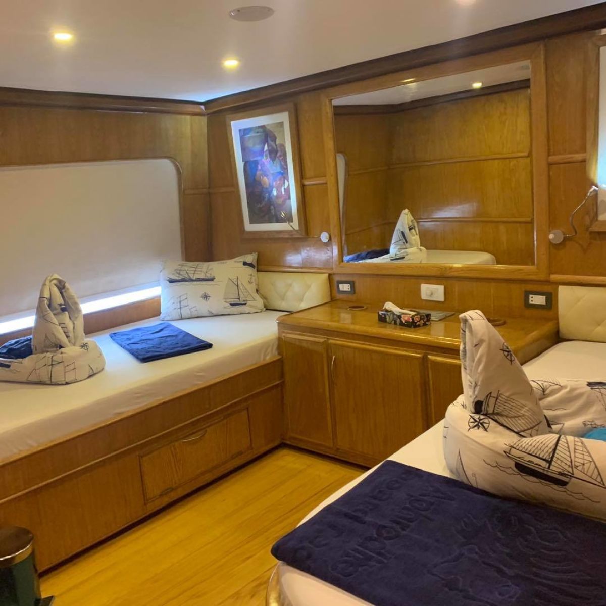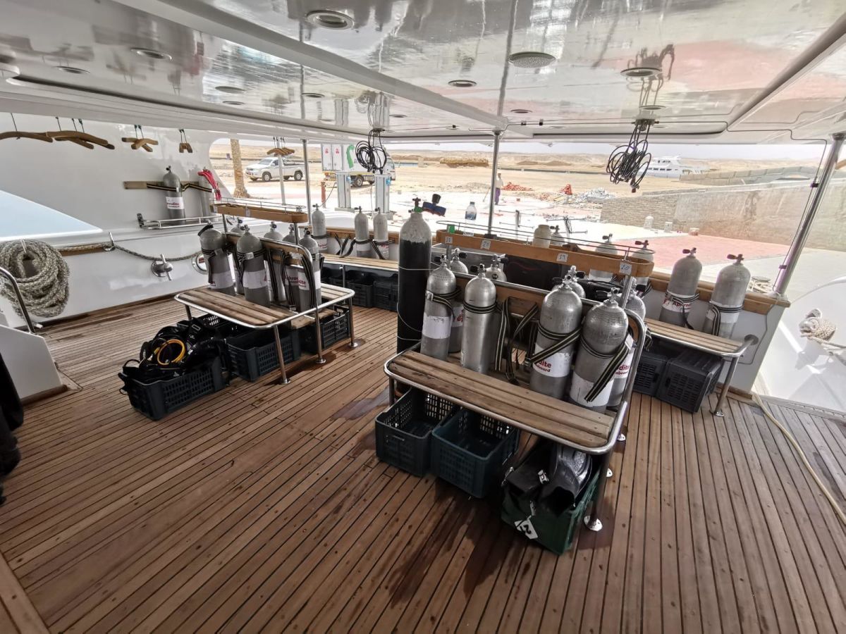 Każda kabina wyposażona jest w klimatyzację oraz prywatną toaletę. Pokład nurkowy jest bardzo przestronny a pokład rufowy z którego będziemy rozpoczynać nurkowania bardzo szeroki. Łódź posiada kilka pokładów słonecznych na najwyższym znajduje się Jacuzzi. Łódź robi wrażenie !!